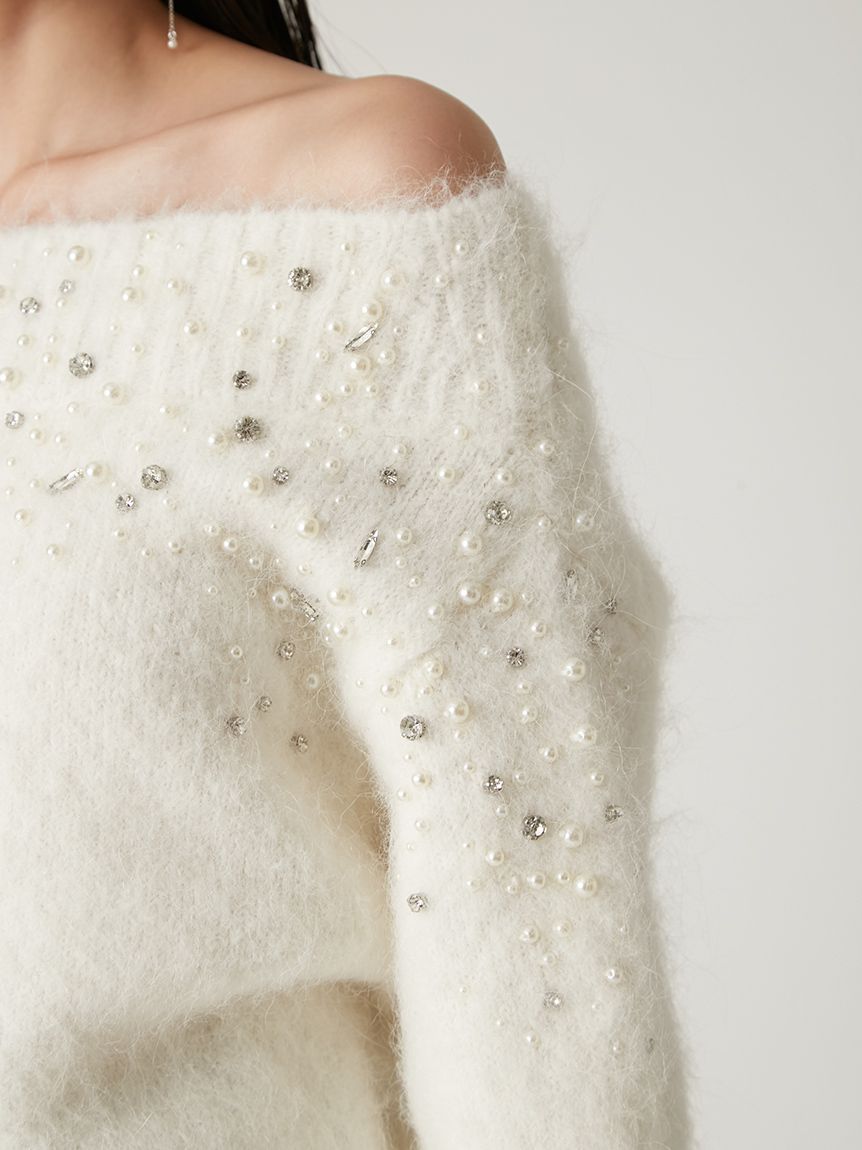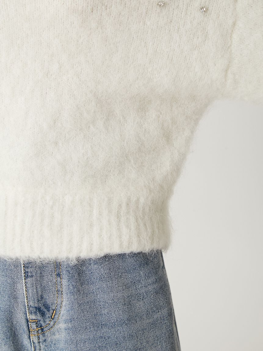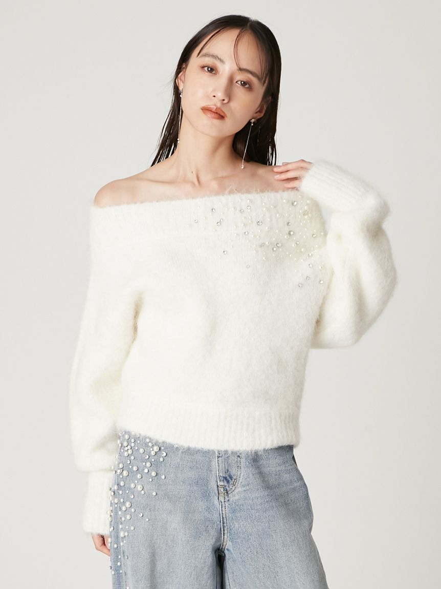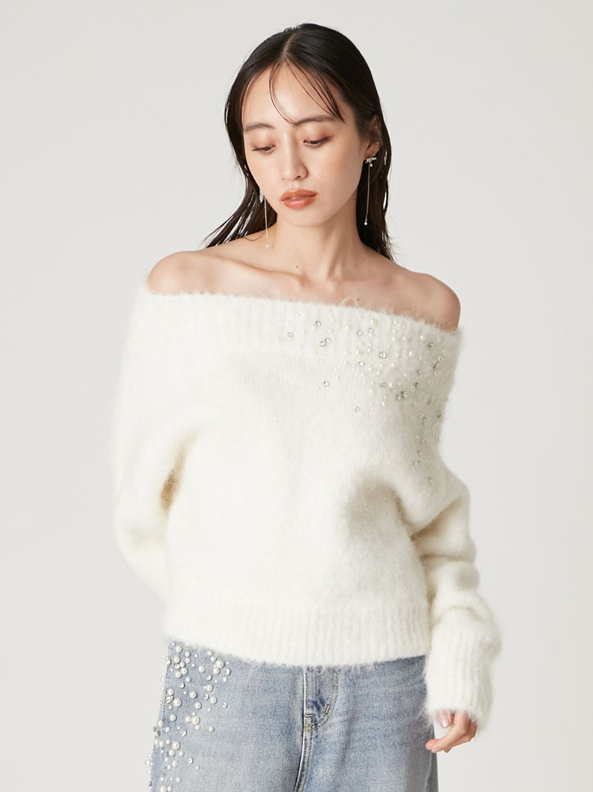 ITEM:羊駝毛絨感寶石裝飾露肩針織上衣 FWNT255107