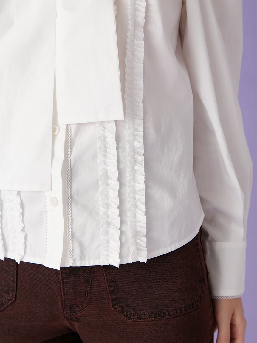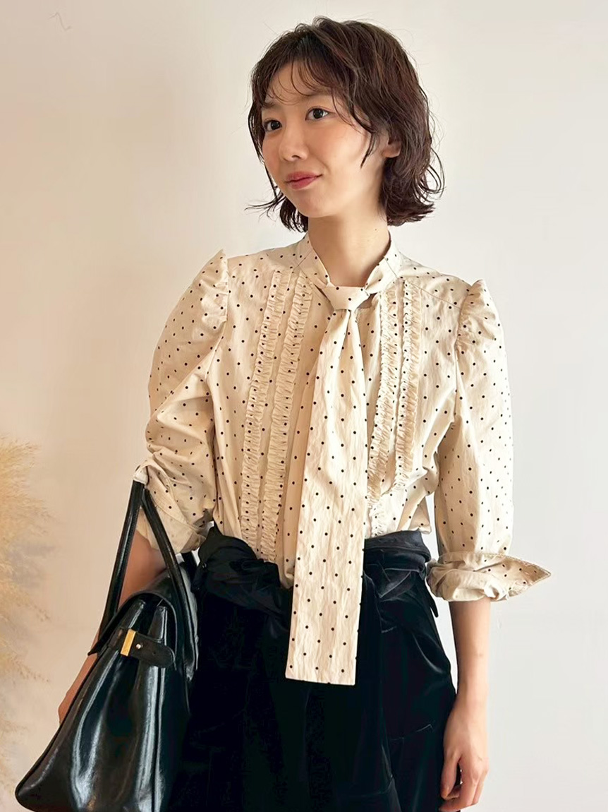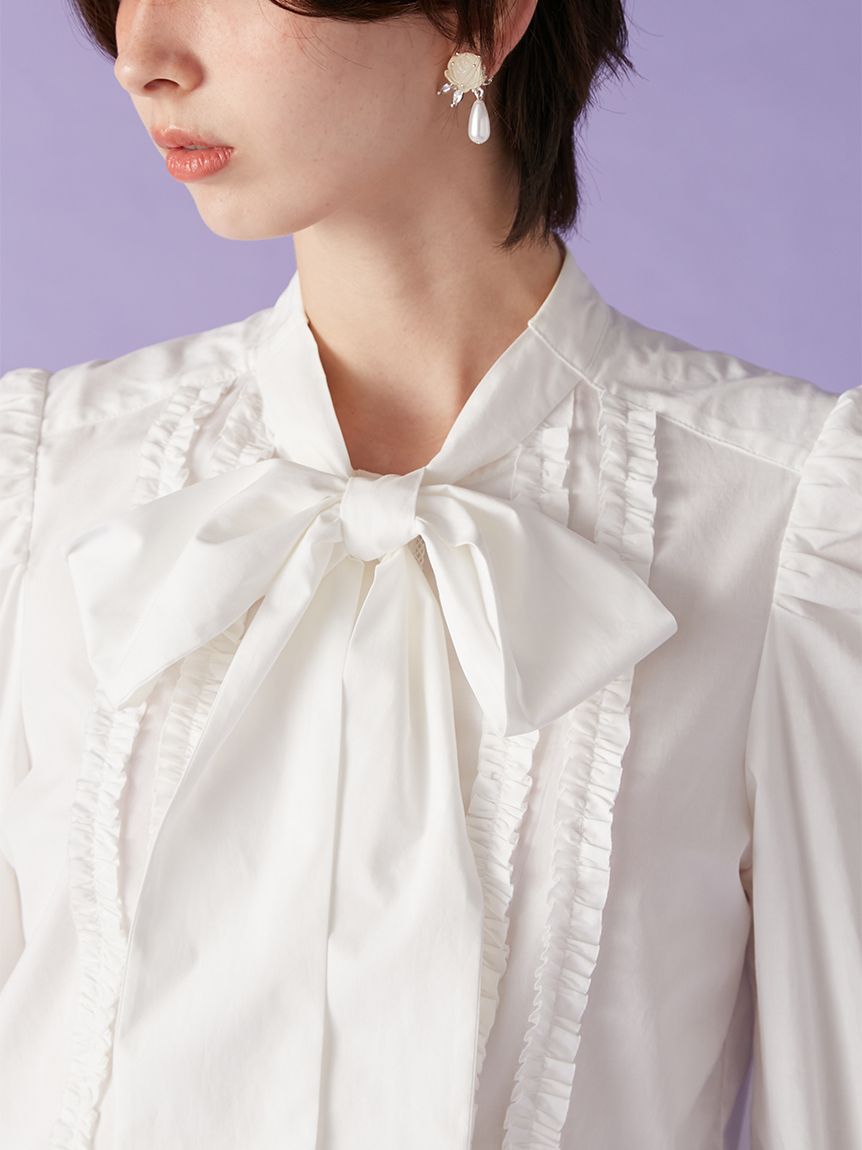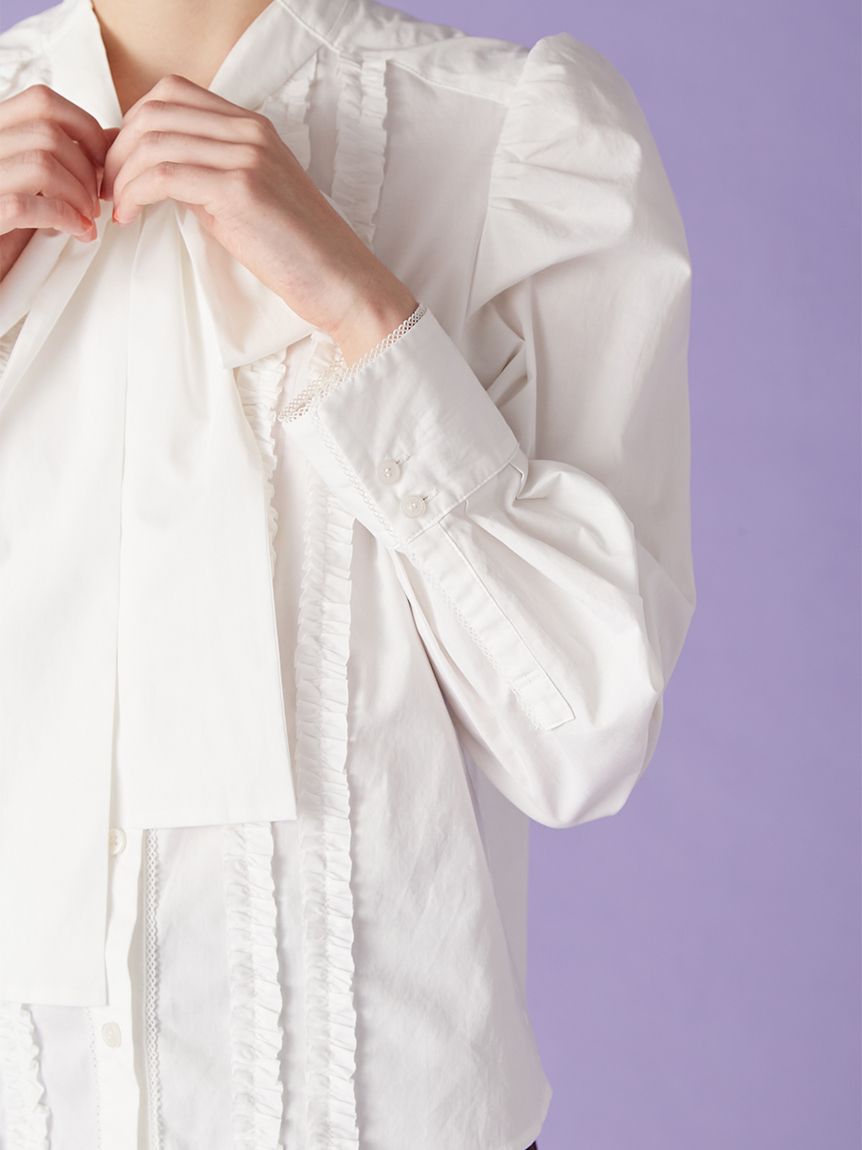 【荷葉邊與蕾絲點綴。經典蝴蝶結領襯衫】 【Design/Styling】 正面以細緻小荷葉邊與低調蕾絲點綴,展現清新優雅印象的蝴蝶結領襯衫。 肩部加入輕微抓皺設計,使肩線更顯纖細柔和。 蝴蝶結領可依結法調整造型表情,無論正式上班或休閒外出皆適合。 雖設計簡約,仍在細節處展現精緻感,是一件能呈現經典優雅風格的必備單品。 【Fabric】 選用適度挺度的布料,保持優美輪廓;質感輕盈且表面細緻,穿著舒適,適合從通勤到日常外出各種場合。 ※由於光線原因,顏色可能與實際顏色有所不同。 或是裝置顯示器、環境光線等因素,商品與照片的顏色可能會略有不同。商品顏色請依商品單獨拍攝照片為主。 ☆禮盒提袋皆屬單獨販賣項目,故不提供包裝服務。若造成不便,敬請見諒。【點選此處加購禮物盒】☆由於7-11在貨物配送上有材積的限制,若訂購的內容有【符合】下列任一條件:1. 訂購 3 件單品以上2. 訂單包含大衣、毛衣、連身裙等單品建議您使用 宅配 寄送,以避免購買商品無法如預期出貨。