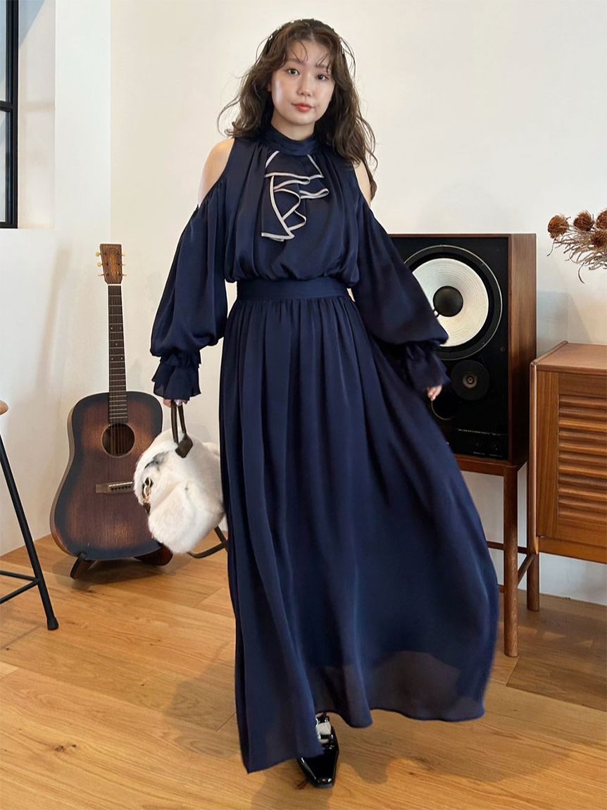【展現肌膚線條與古典氣息並存的垂墜感洋裝】 【Design/Styling】 以提升季節氛圍的大膽露膚設計,結合古典感荷葉領口,細節層次分明,展現恰到好處的對比魅力。 袖口開衩可透過釦飾調整開合程度,依場合自由拿捏露膚比例,兼具實穿與造型感。 自然流動的垂墜線條修飾身形,腰帶處加入打褶設計,勾勒俐落比例,為整體造型加分。 腰帶後側配置彈性設計,貼合不同身形,穿著感受輕鬆舒適。 【Features】 選用垂墜感佳、質地柔順的素材,行走間呈現優雅擺動。 略帶霧面質感,親膚不黏身,無論日常或正式場合皆能自在穿著。 ※由於光線原因,顏色可能與實際顏色有所不同。 或是裝置顯示器、環境光線等因素,商品與照片的顏色可能會略有不同。商品顏色請依商品單獨拍攝照片為主。 ☆禮盒提袋皆屬單獨販賣項目,故不提供包裝服務。若造成不便,敬請見諒。【點選此處加購禮物盒】☆由於7-11在貨物配送上有材積的限制,若訂購的內容有【符合】下列任一條件:1. 訂購 3 件單品以上2. 訂單包含大衣、毛衣、連身裙等單品建議您使用 宅配 寄送,以避免購買商品無法如預期出貨。 ☆提醒您,官網商品於七日鑑賞期內申請退貨前,請確認商品保持全新完整狀態。凡下水、剪吊牌、試穿痕跡(毛球、汙漬、妝粉、氣味殘留等)、人為加工,或配件、包裝(含包裝袋、衣架、鞋盒、贈品等)不完整者,恕不接受退貨。詳情請參考退換貨政策。
