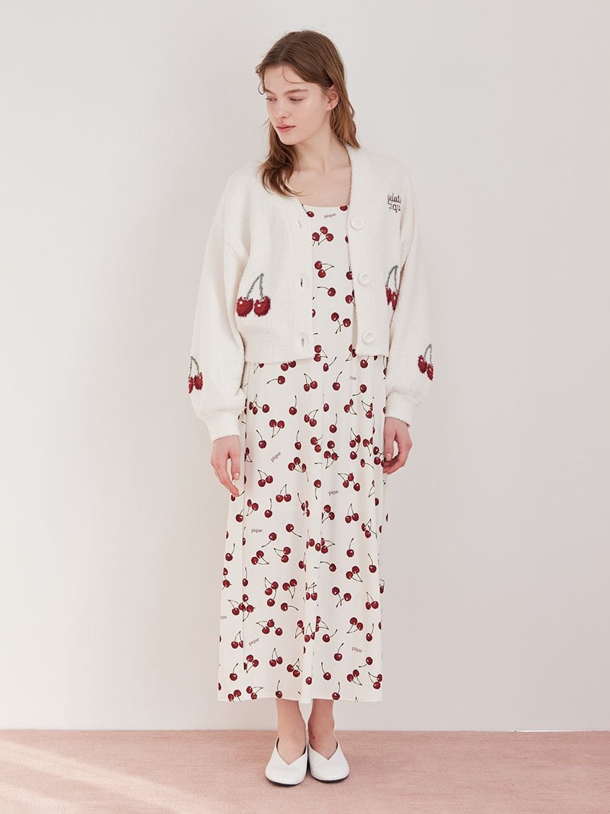 V 領開襟外套設計,於正面左右兩側與雙袖配置櫻桃緹花圖樣,細節俏皮又吸睛。