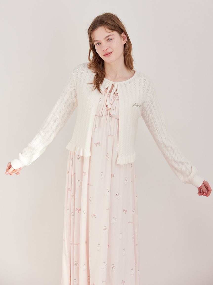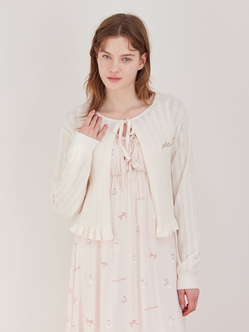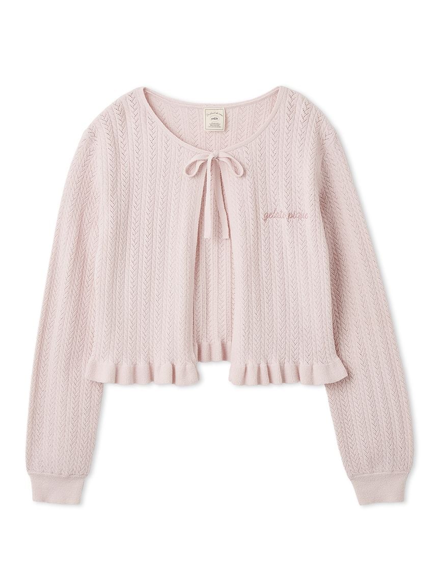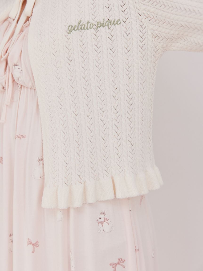 【輕盈針織開襟衫】 【Design/Styling】 使用能感受春日氣息的輕盈AIRY MOCO材質,打造圖案針織開襟衫。 下擺搭配荷葉邊設計,略短版型,非常適合疊穿背心或洋裝。 前方以手結緞帶固定一點,右胸點綴LOGO刺繡,增添小巧亮點。 提供:清新米白色、柔美粉色選擇。 可搭配同期推出的兔子圖案剪裁上衣系列,或作為日常小外搭使用,皆十分適合。 【Fabric】 AIRY MOCO 如同身披空氣般的輕盈穿感與柔軟觸感,是Gelato Pique針織系列中最輕量的AIRY MOCO。 具有鬆軟烘烤海綿般的質感及清爽觸感,四季皆宜,特別推薦給喜愛清爽舒適穿著的人。 ※由於光線原因,顏色可能與實際顏色有所不同。 或是裝置顯示器、環境光線等因素,商品與照片的顏色可能會略有不同。商品顏色請依商品單獨拍攝照片為主。 ☆禮盒提袋皆屬單獨販賣項目,故不提供包裝服務。若造成不便,敬請見諒。【點選此處加購禮物盒】☆由於7-11在貨物配送上有材積的限制,若訂購的內容有【符合】下列任一條件:1. 訂購 3 件單品以上2. 訂單包含大衣、毛衣、連身裙等單品建議您使用 宅配 寄送,以避免購買商品無法如預期出貨。 ☆提醒您,官網商品於七日鑑賞期內申請退貨前,請確認商品保持全新完整狀態。凡下水、剪吊牌、試穿痕跡(毛球、汙漬、妝粉、氣味殘留等)、人為加工,或配件、包裝(含包裝袋、衣架、鞋盒、贈品等)不完整者,恕不接受退貨。詳情請參考退換貨政策。