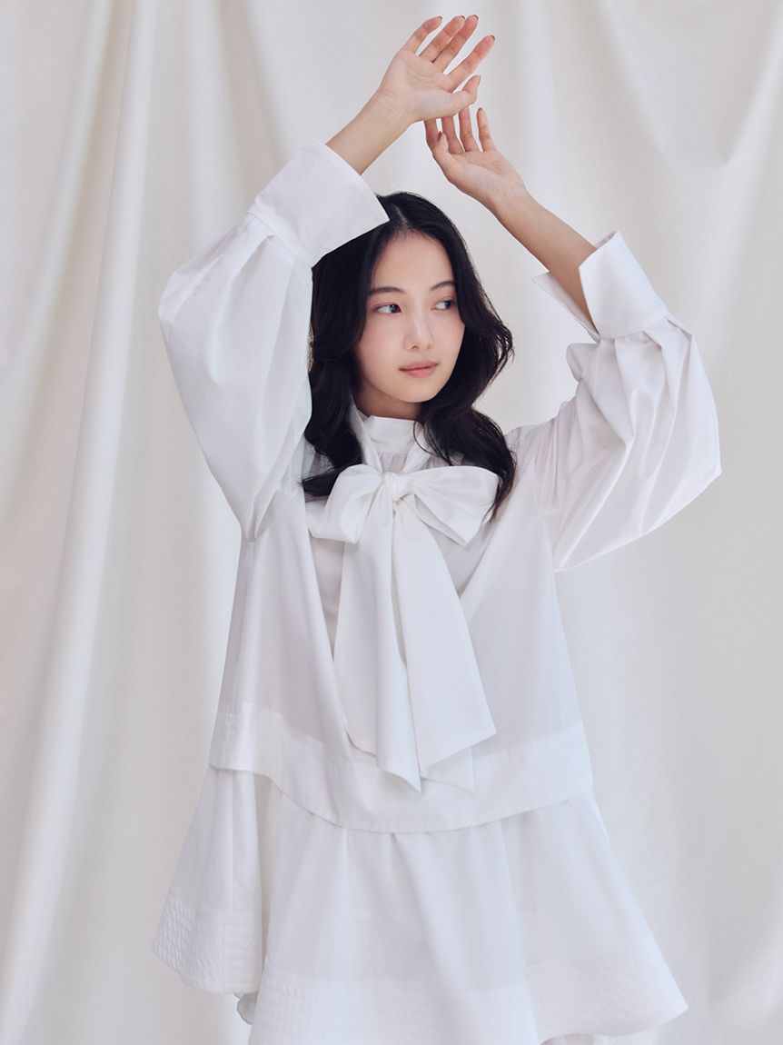 【胸前蝴蝶結點綴,展現華麗氣息的喇叭剪裁長版襯衫】 【Design/Styling】 以蓬鬆立體的淑女風袖型,結合優雅展開的喇叭剪裁,打造充滿存在感的長版襯衫。下擺特別加入內摺設計並施以車線,增加布料挺度,使喇叭輪廓更加俐落有型。袖子透過打摺塑造豐盈份量,大尺寸剪裁同時帶來自然的顯瘦視覺效果。 寬版袖口於正面開衩設計,為手部線條增添華麗層次,袖長略短,展現輕盈平衡感。胸前的大尺寸蝴蝶結份量感十足,讓臉部周圍更顯明亮動人,且可拆式設計,可依造型需求自由變化。 推薦搭配柔軟的寬版針織背心(SWNT255134)營造層次感穿搭。長度設定可單穿作為洋裝,也非常適合搭配長褲造型。後領採包釦設計,方便穿脫。 ※由於光線原因,顏色可能與實際顏色有所不同。 或是裝置顯示器、環境光線等因素,商品與照片的顏色可能會略有不同。商品顏色請依商品單獨拍攝照片為主。 ☆禮盒提袋皆屬單獨販賣項目,故不提供包裝服務。若造成不便,敬請見諒。【點選此處加購禮物盒】☆由於7-11在貨物配送上有材積的限制,若訂購的內容有【符合】下列任一條件:1. 訂購 3 件單品以上2. 訂單包含大衣、毛衣、連身裙等單品建議您使用 宅配 寄送,以避免購買商品無法如預期出貨。