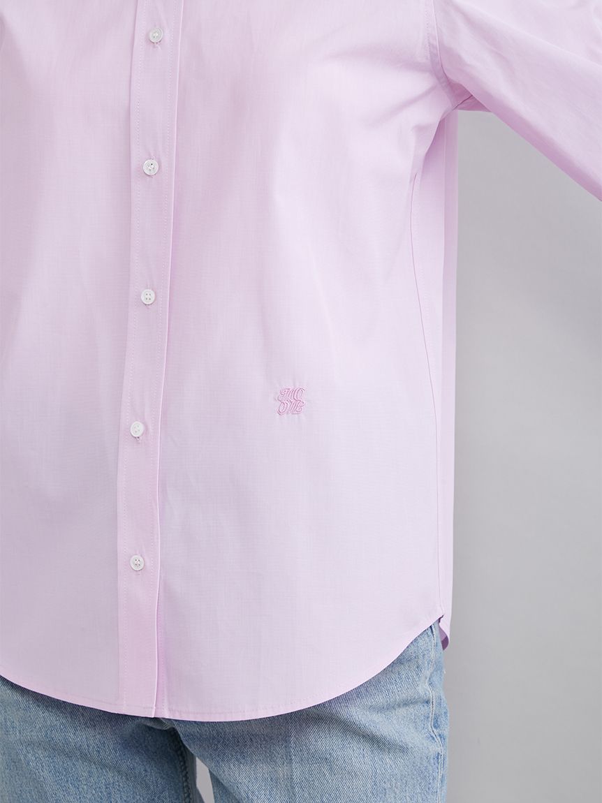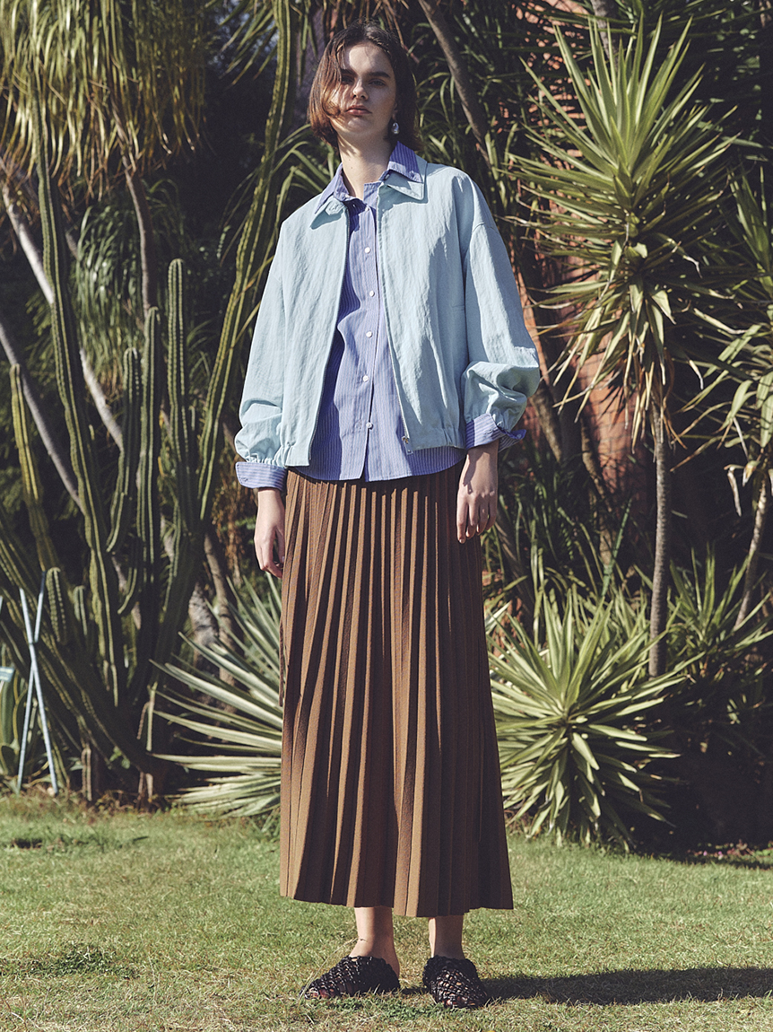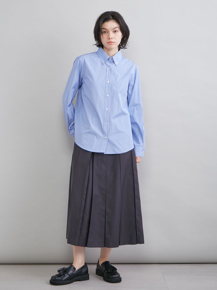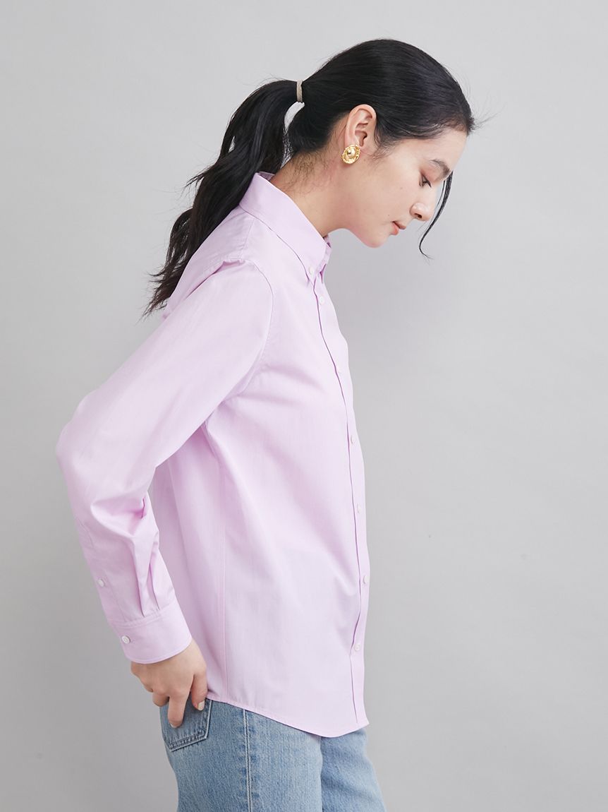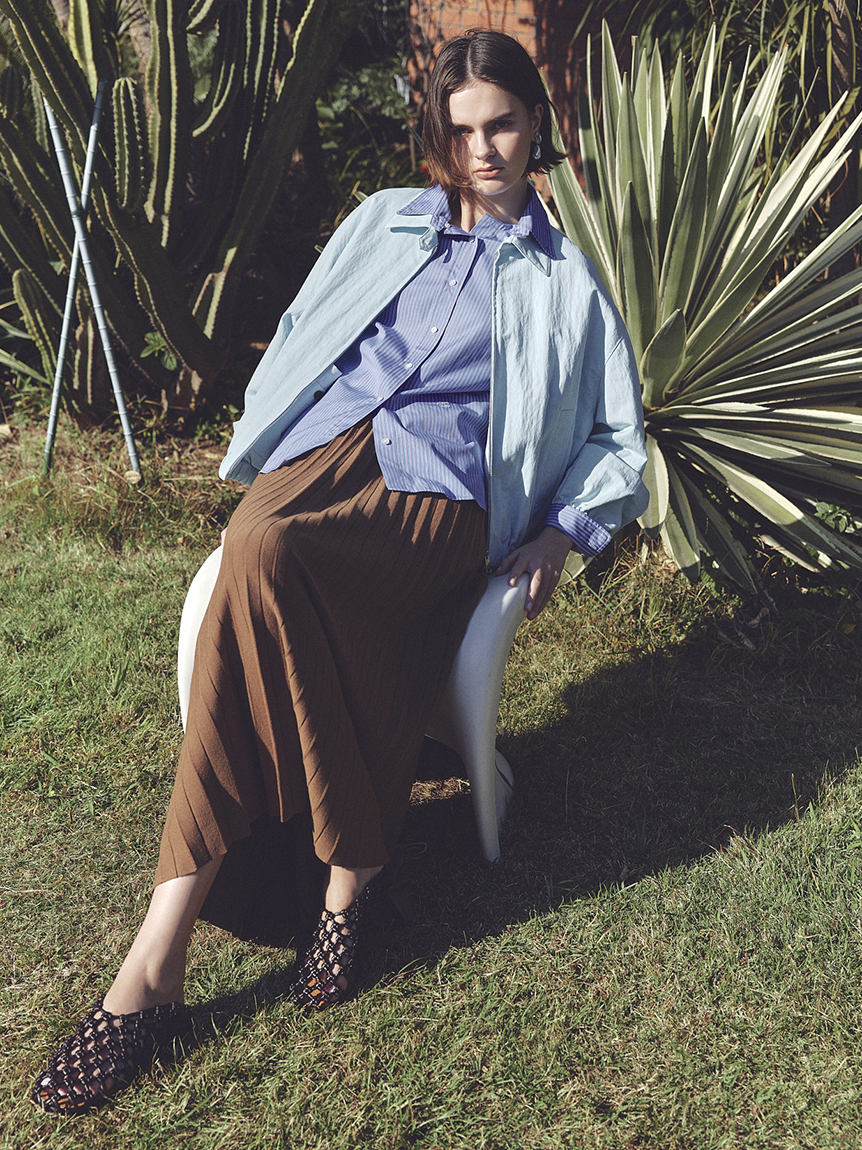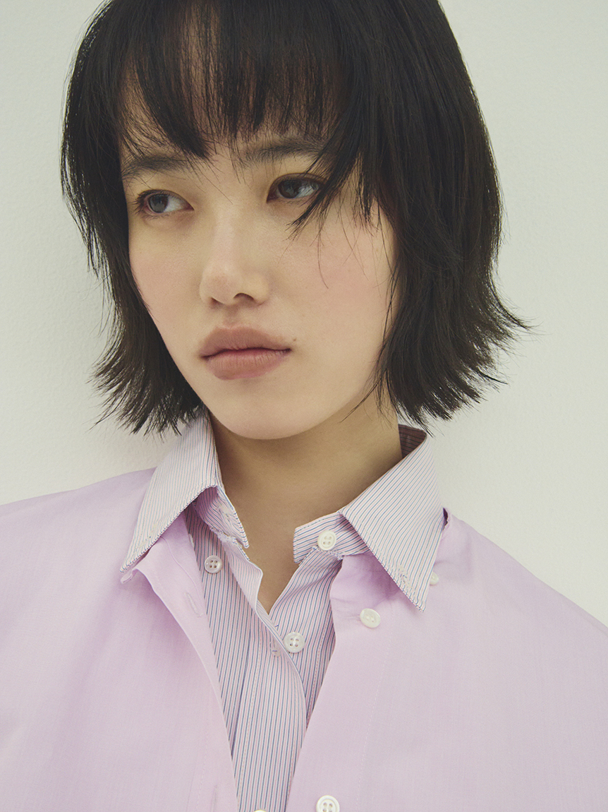 Mila Owen以此面料設計經典鈕扣領襯衫,版型稍寬鬆,營造中性帥氣感。