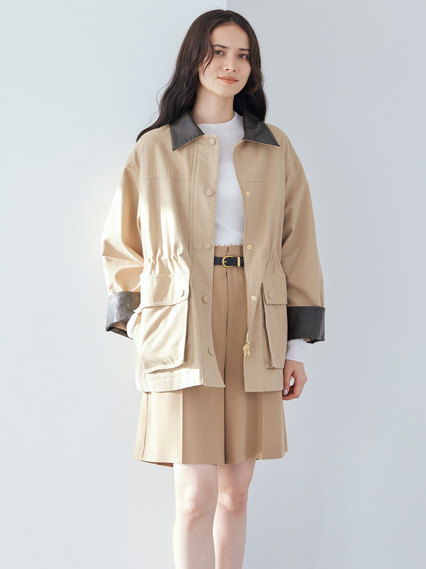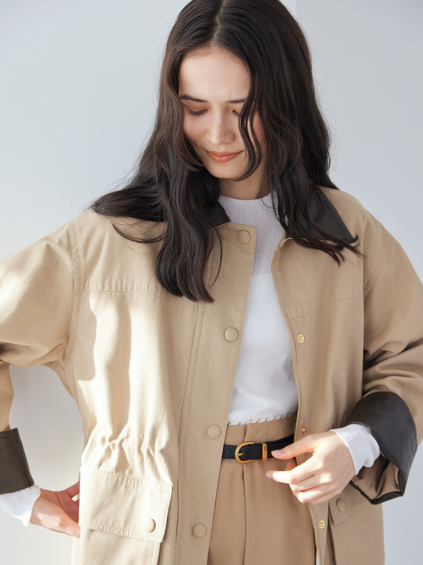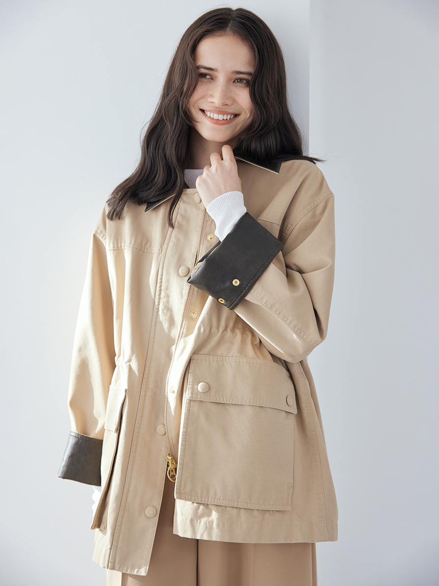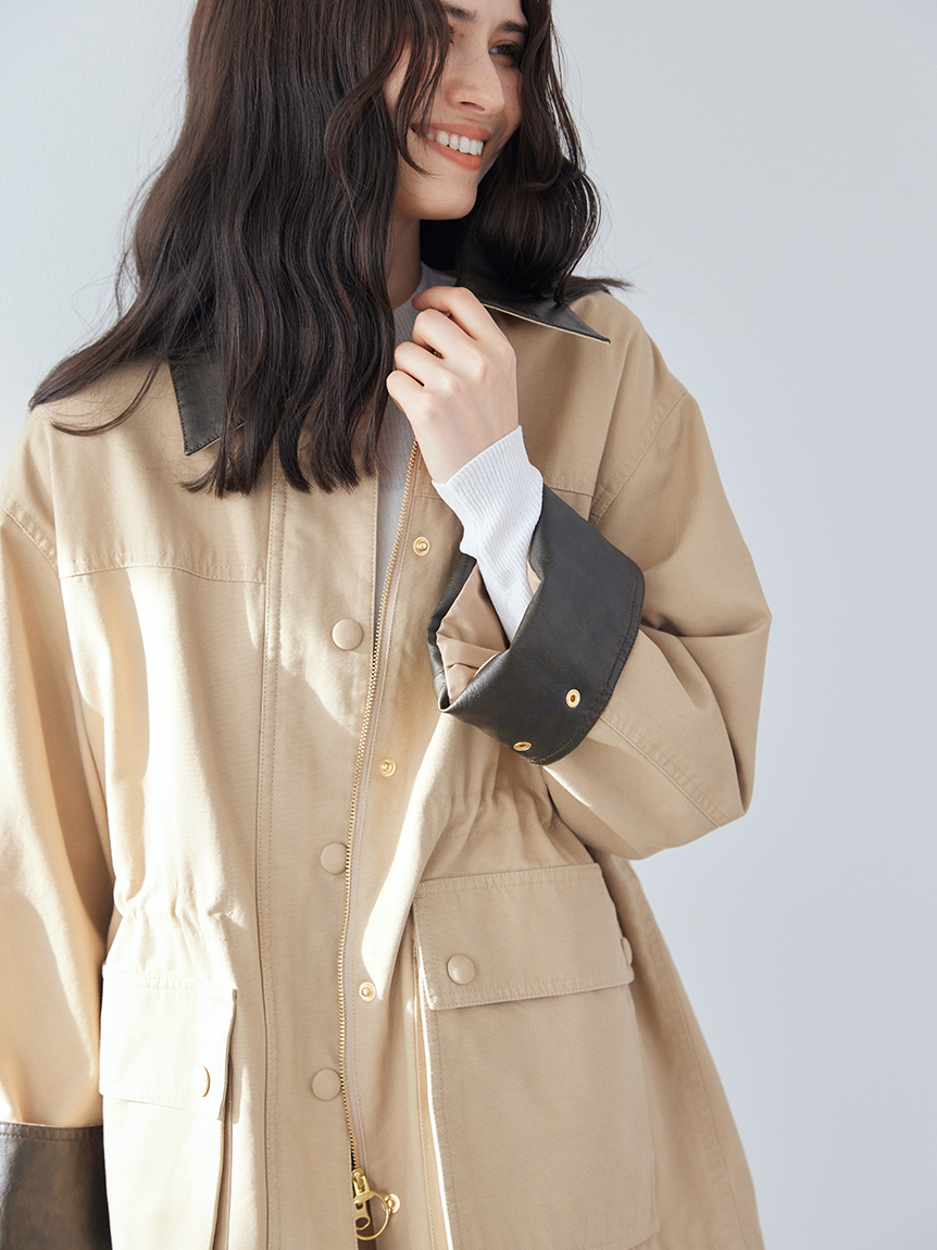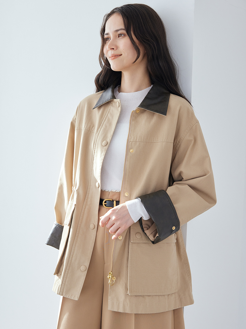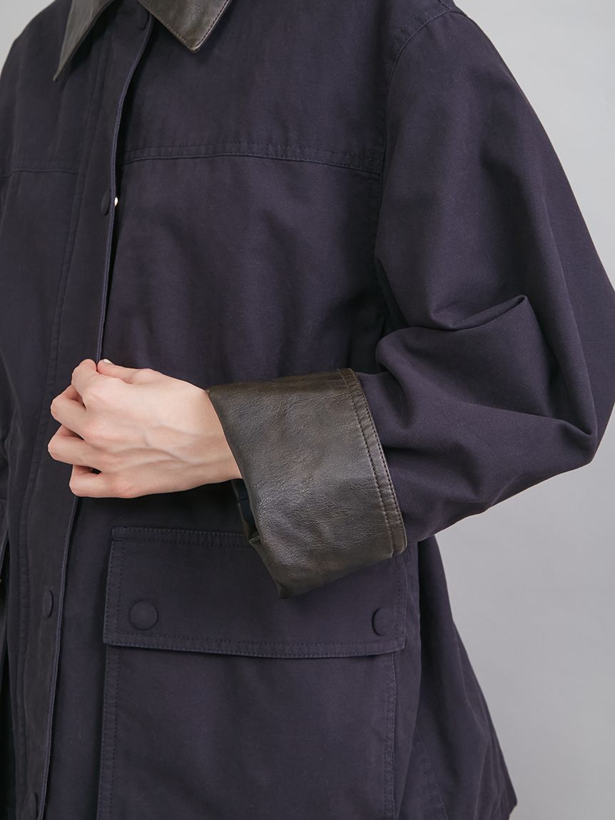 領口與袖口翻折部分採用環保皮革,提升細節質感。