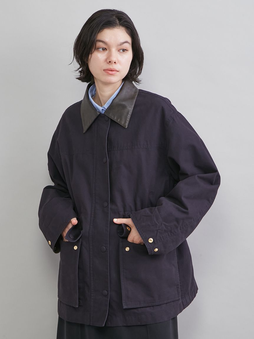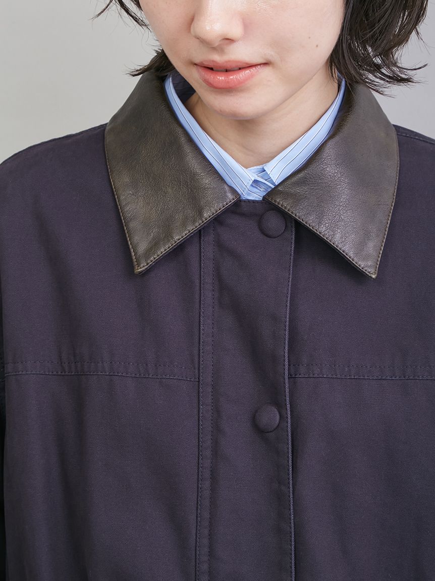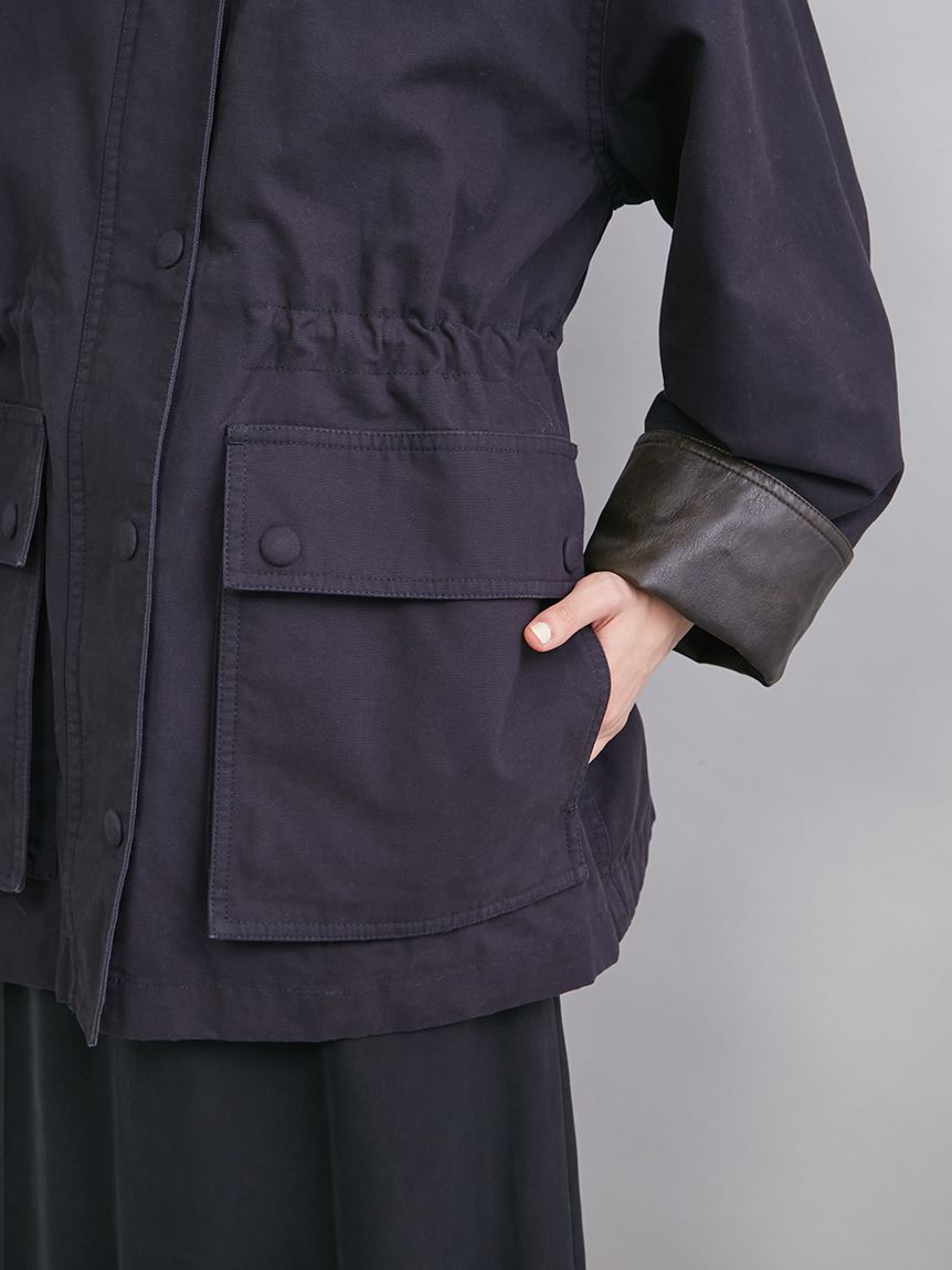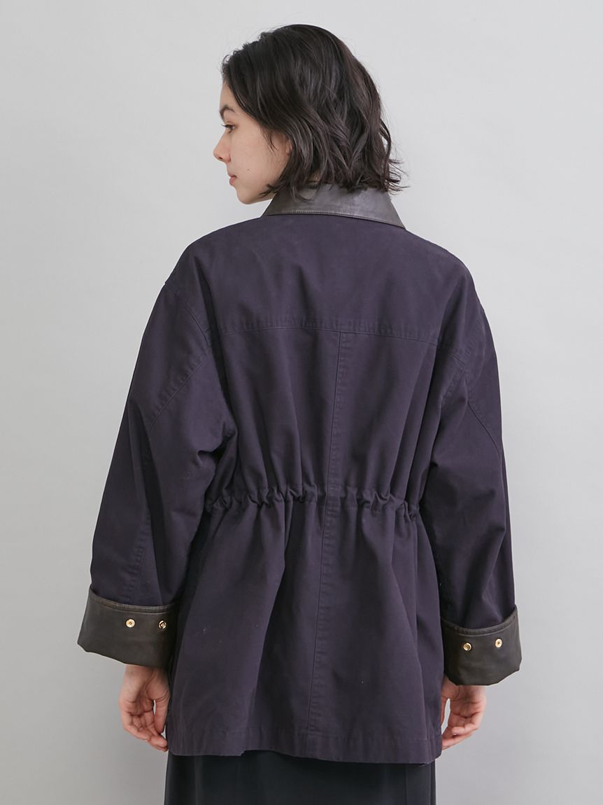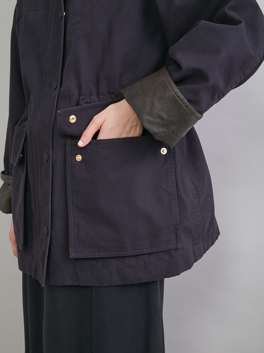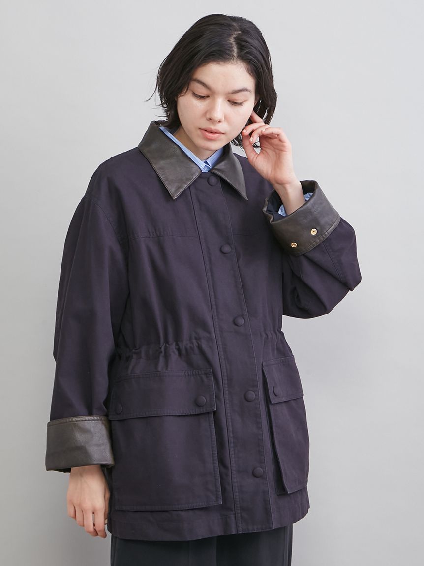 領口與袖口翻折部分採用環保皮革,提升細節質感。