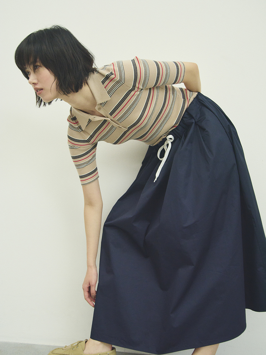 上衣Polo領設計為五分袖俐落剪裁;裙身附腰部綁帶,可調整腰線,兼具可愛與實用,增添造型亮點。