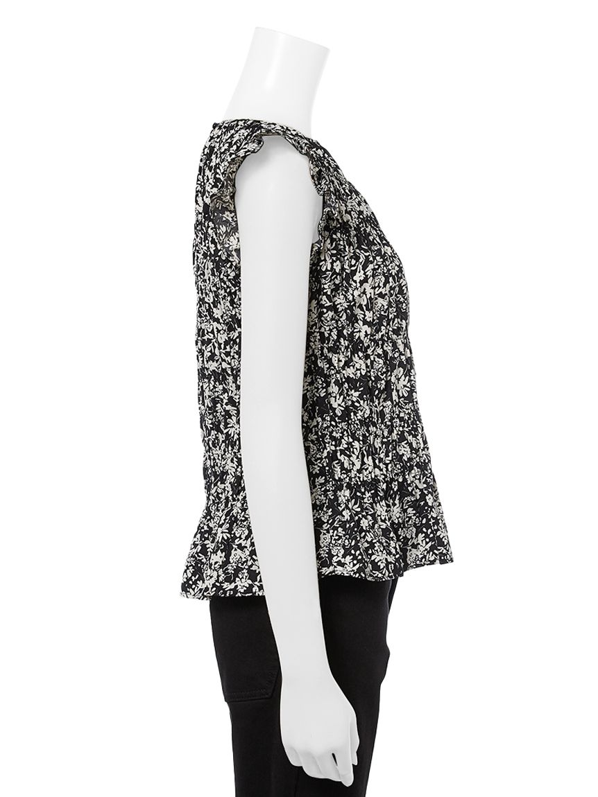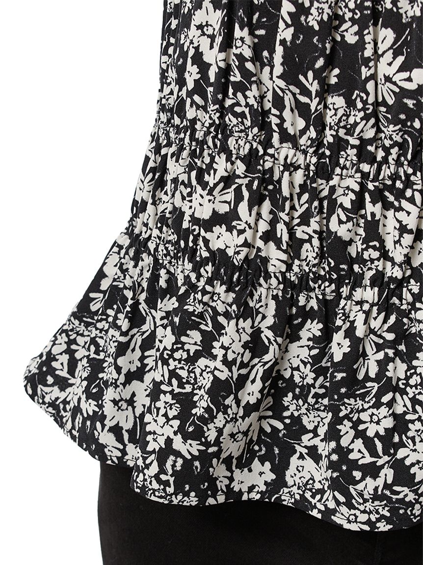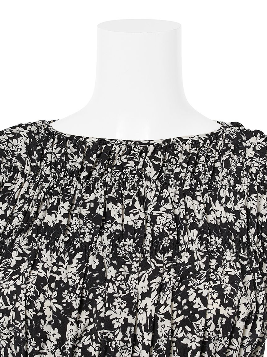 整體以大量抽皺設計勾勒,搭配低腰剪裁的微荷葉下擺與袖口的荷葉裝飾,呈現柔美氛圍。