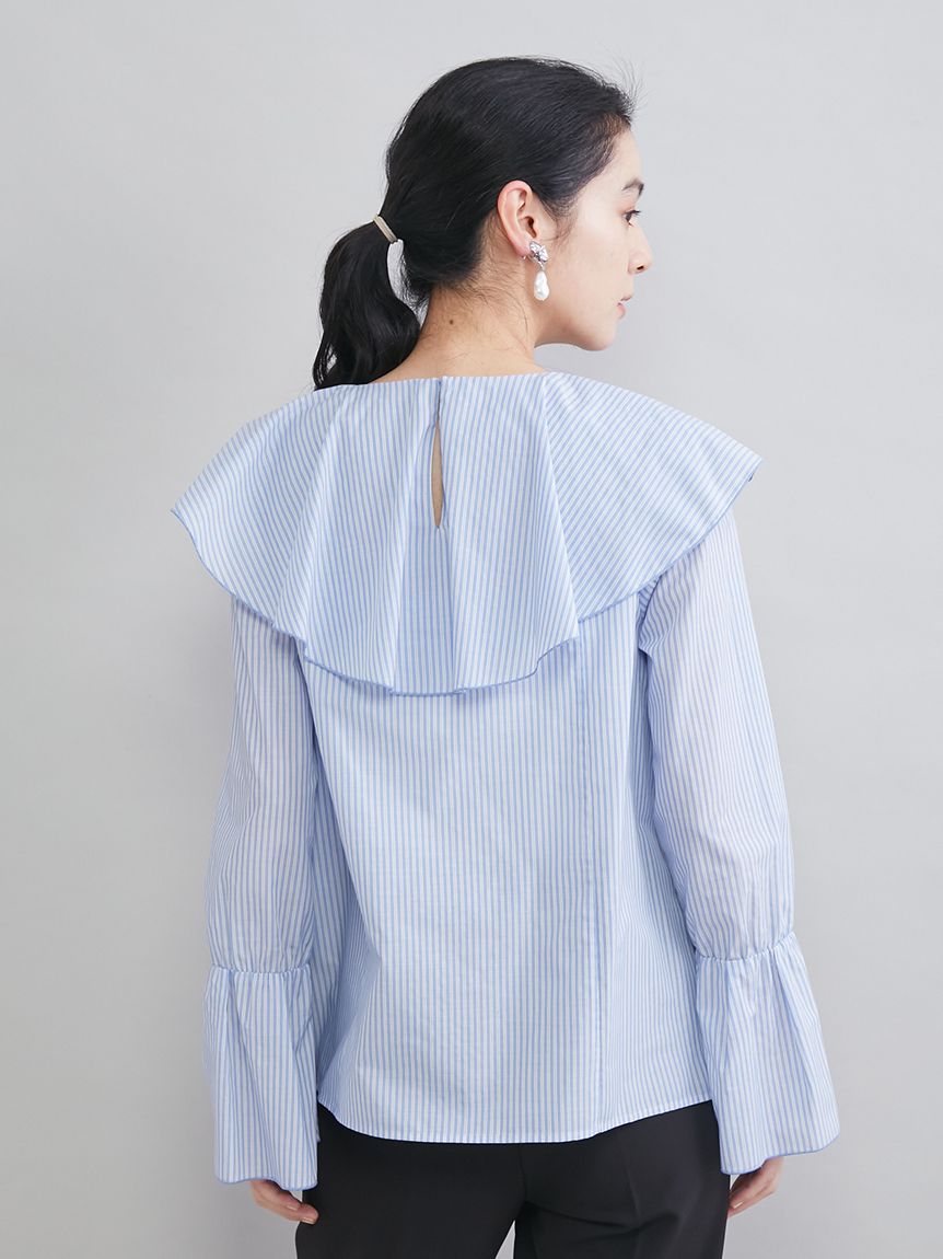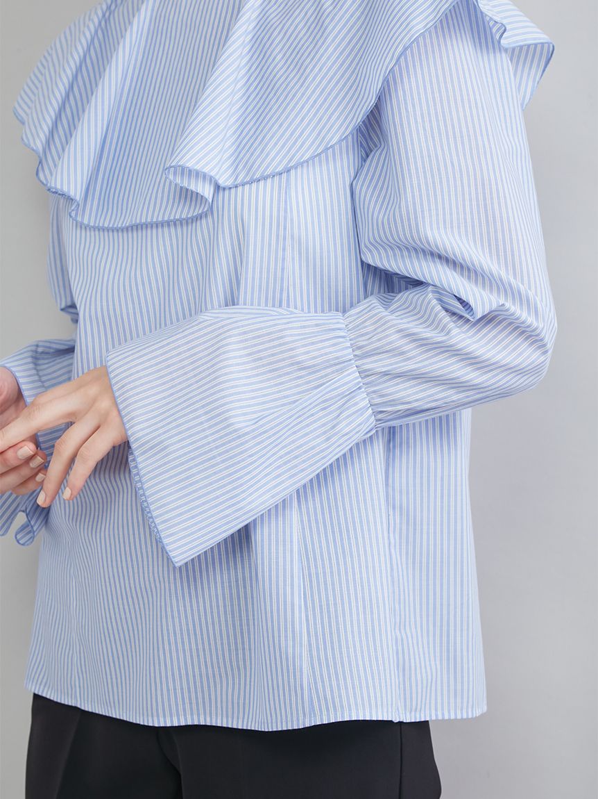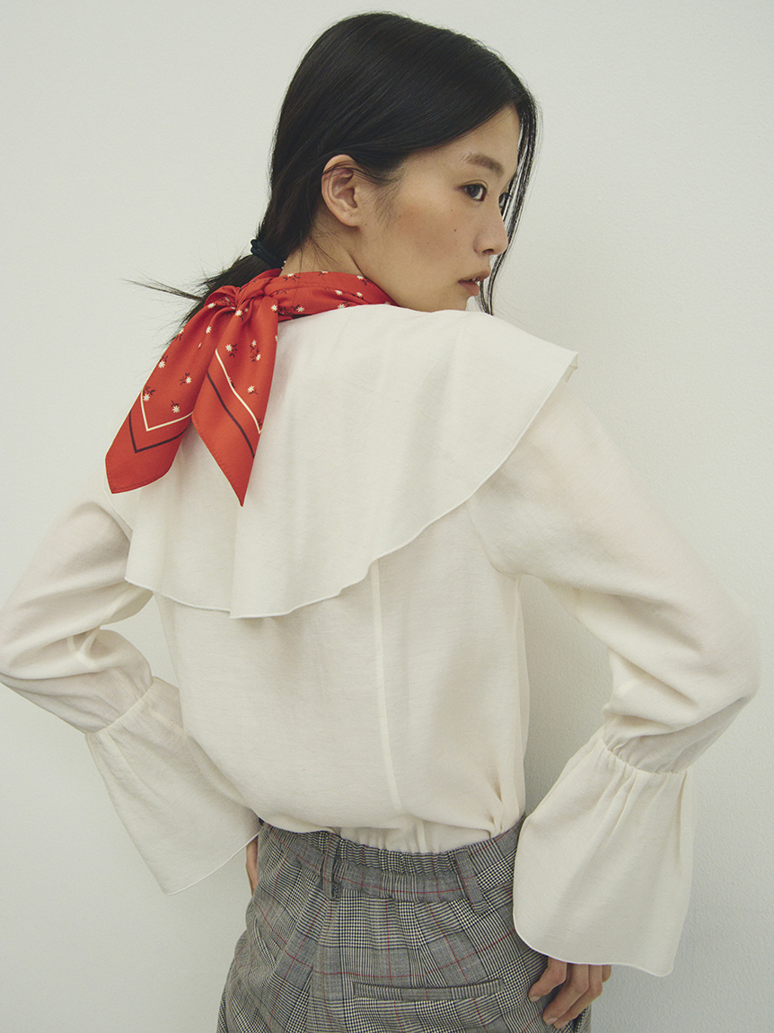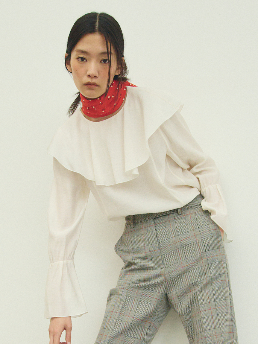 如斗篷般的喇叭式荷葉邊領點綴肩部,打造時尚感襯衫。