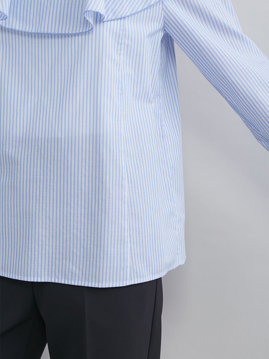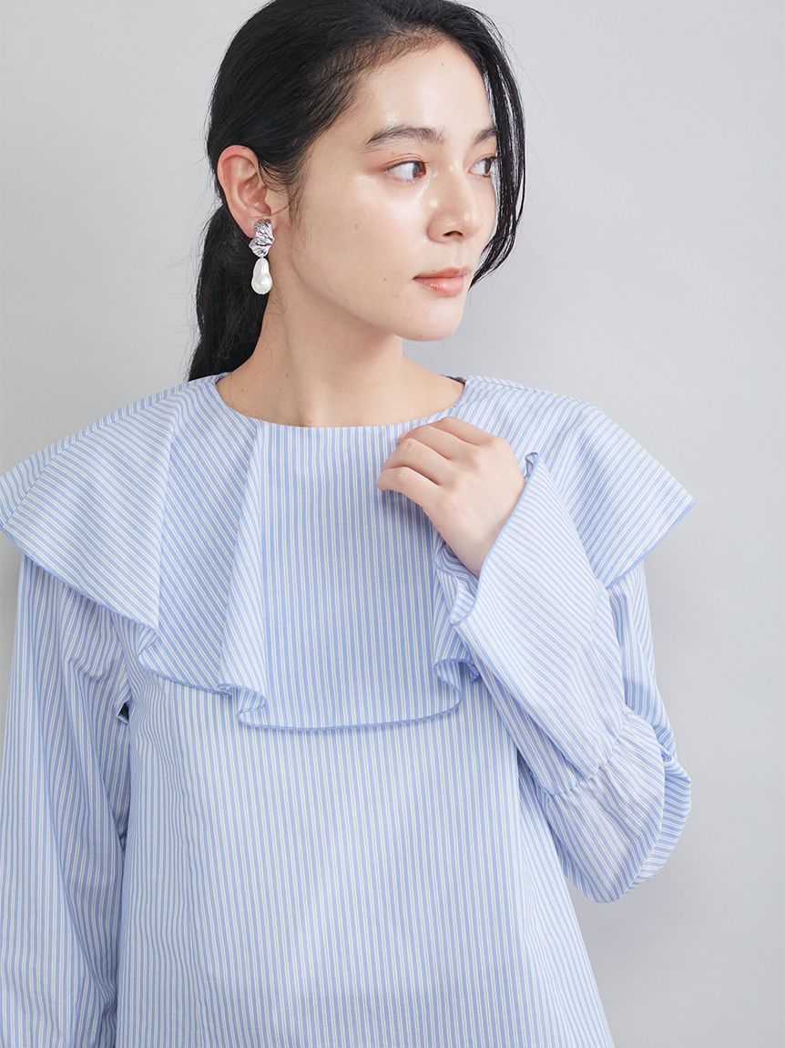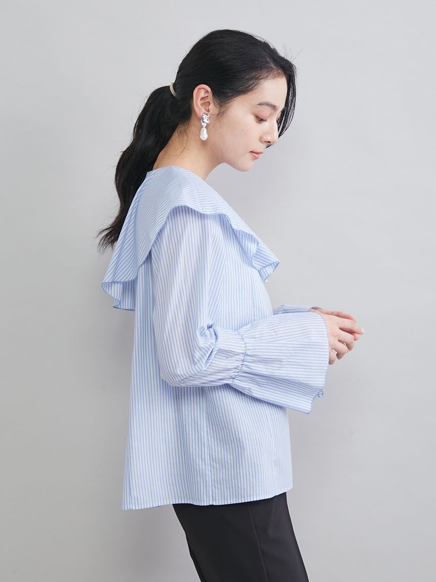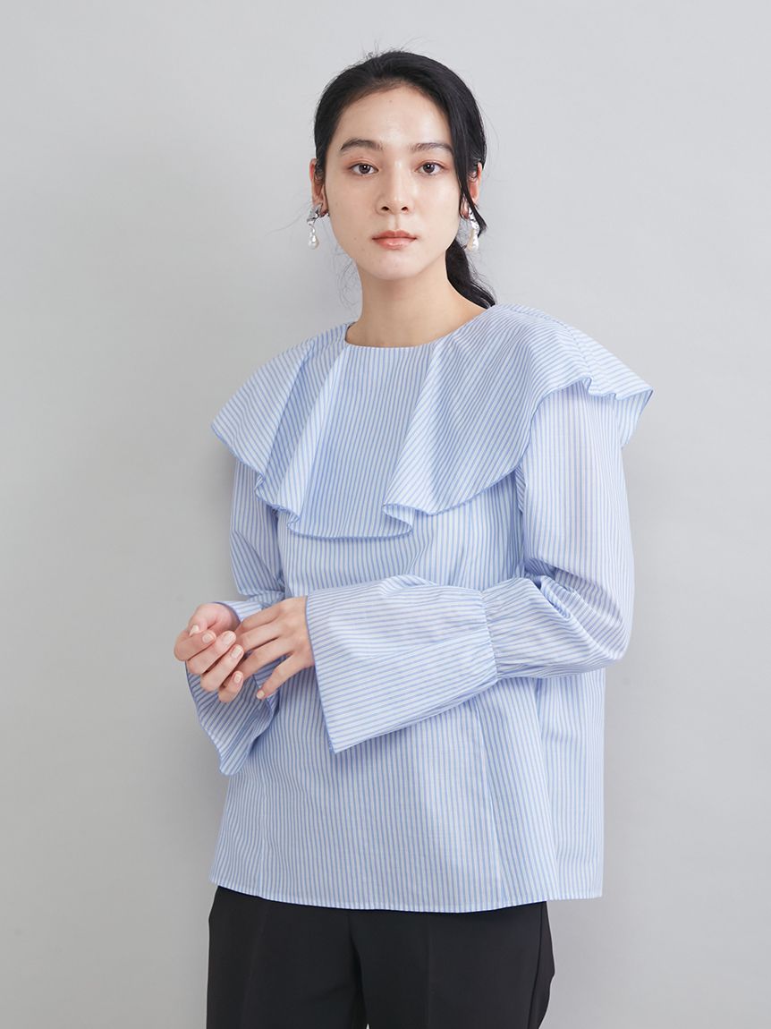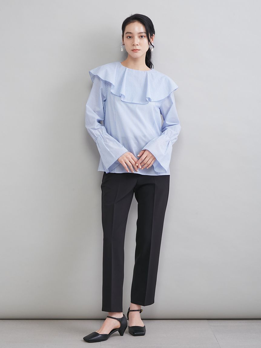 如斗篷般的喇叭式荷葉邊領點綴肩部,打造時尚感襯衫。