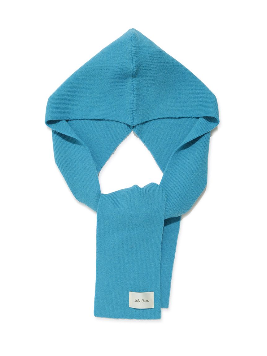 看似肩披毛衣。其實是連帽式羅紋針織圍巾。