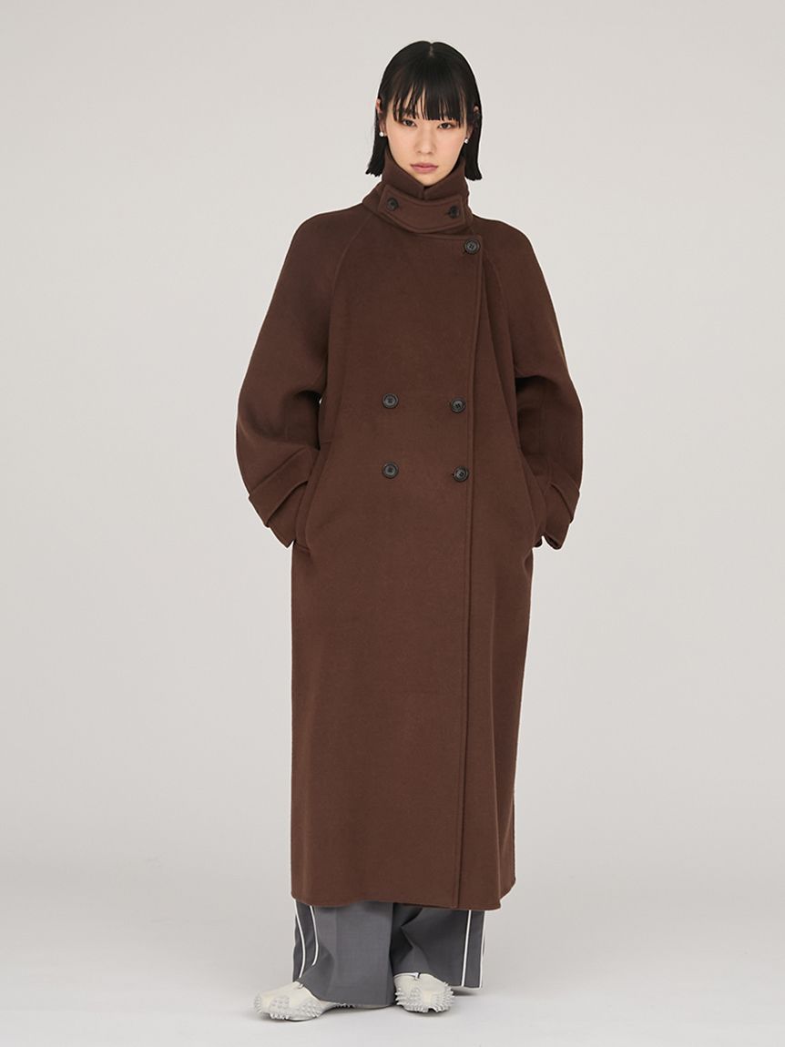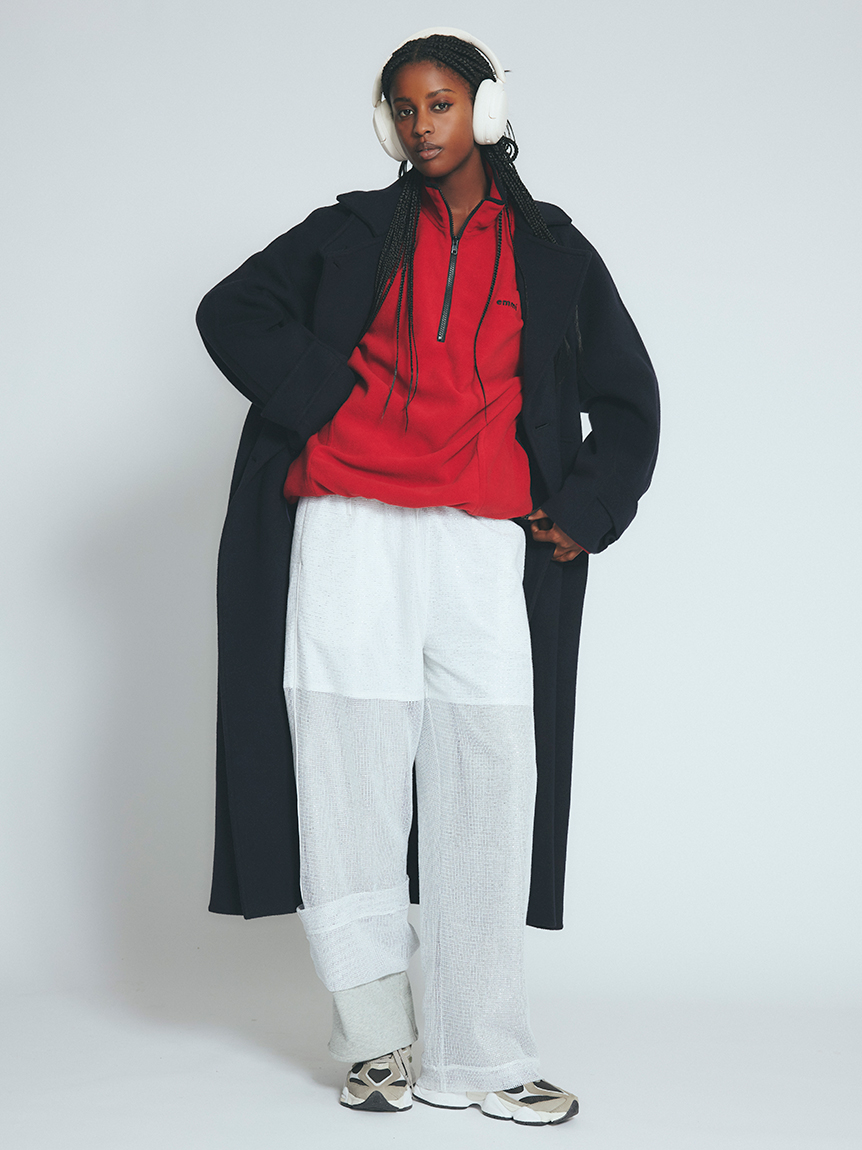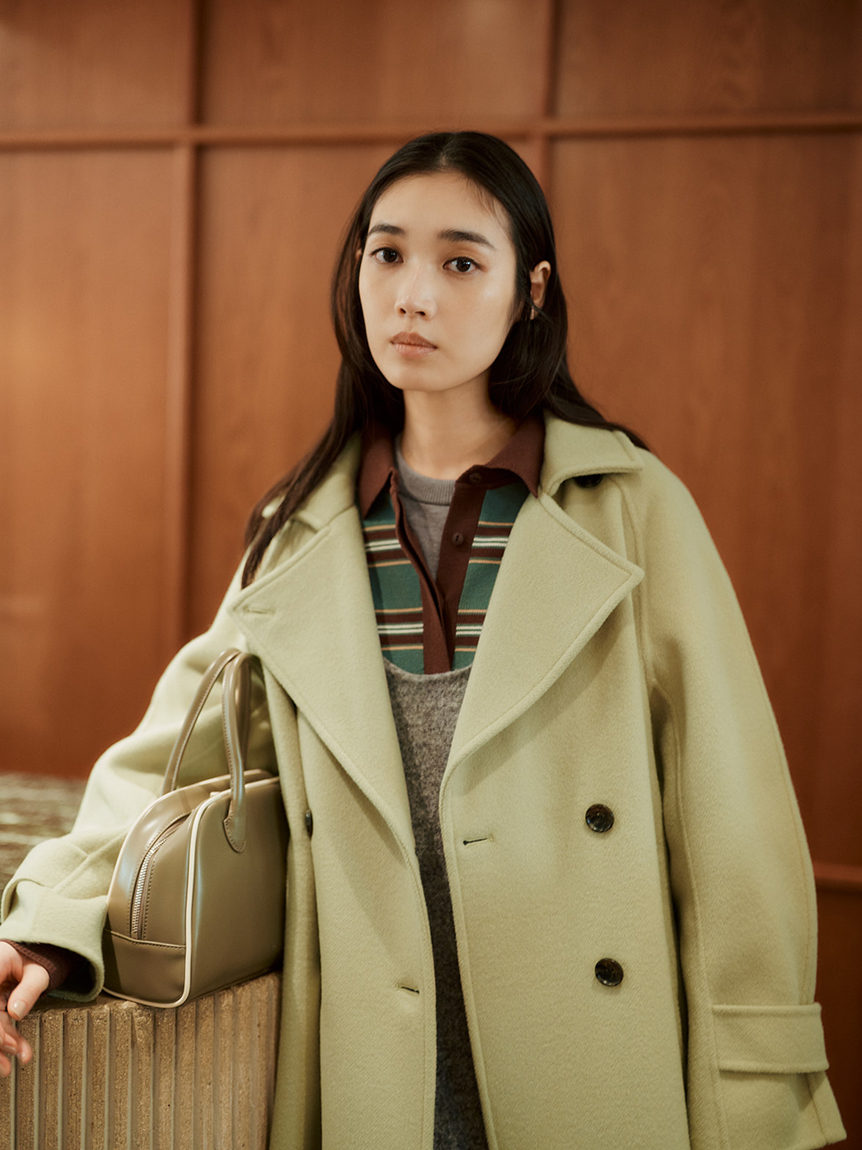 前排鈕扣閉合時,可呈現立領造型;打開時則可作為切斯特大衣風格,隨心變換多種穿搭。
