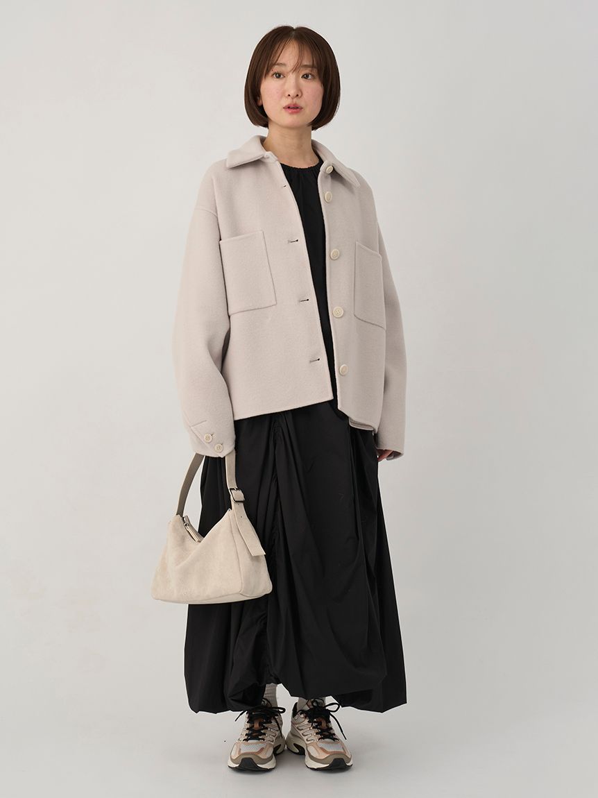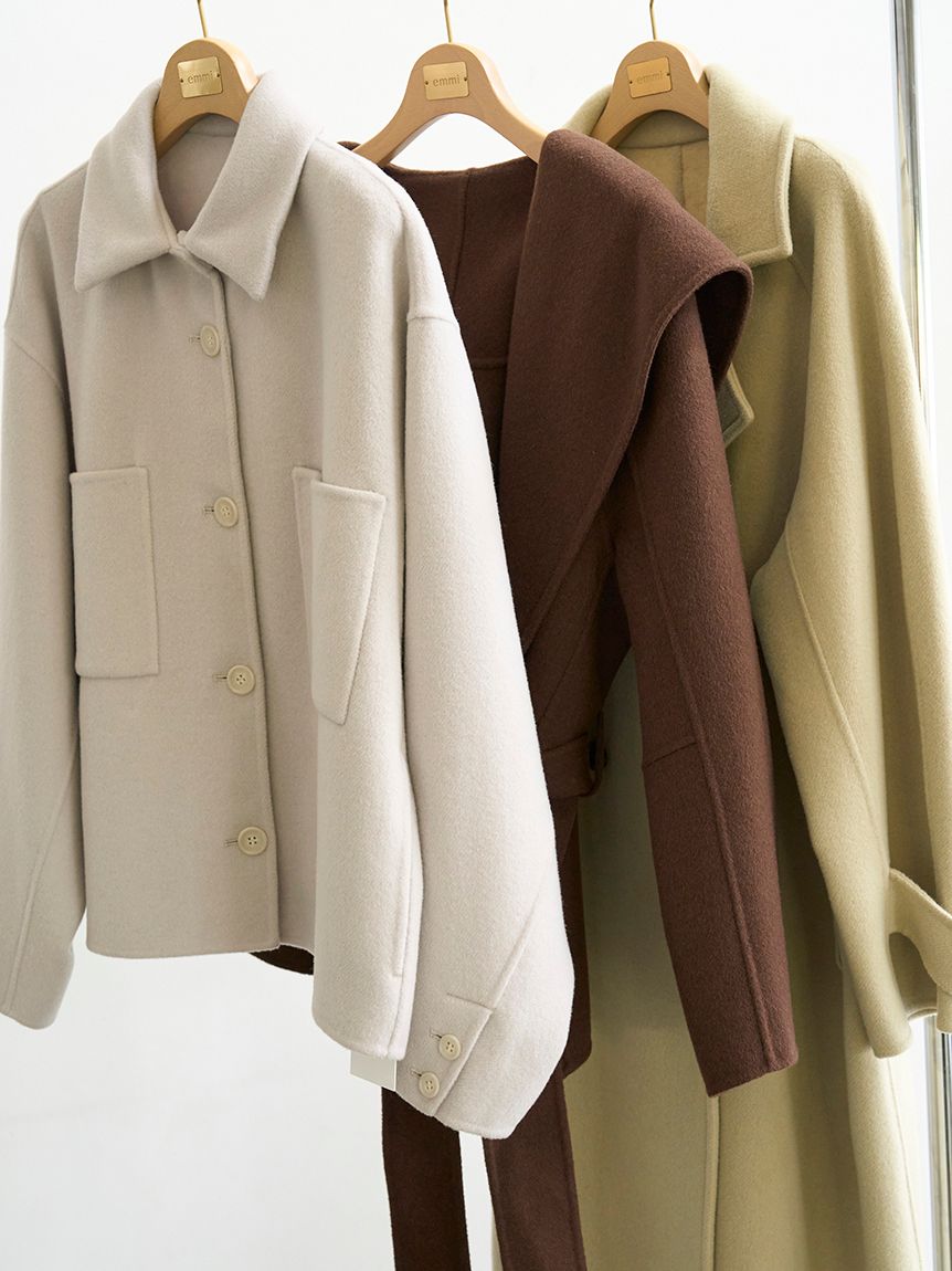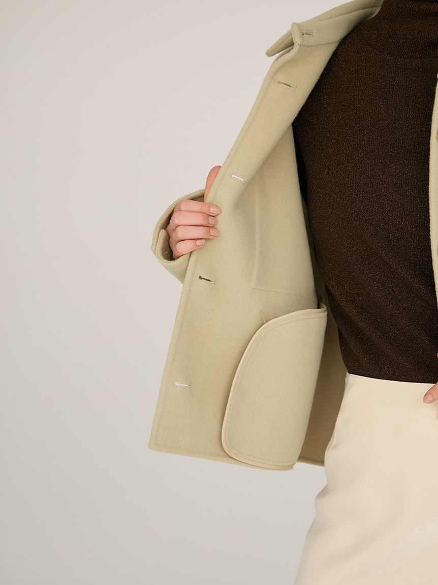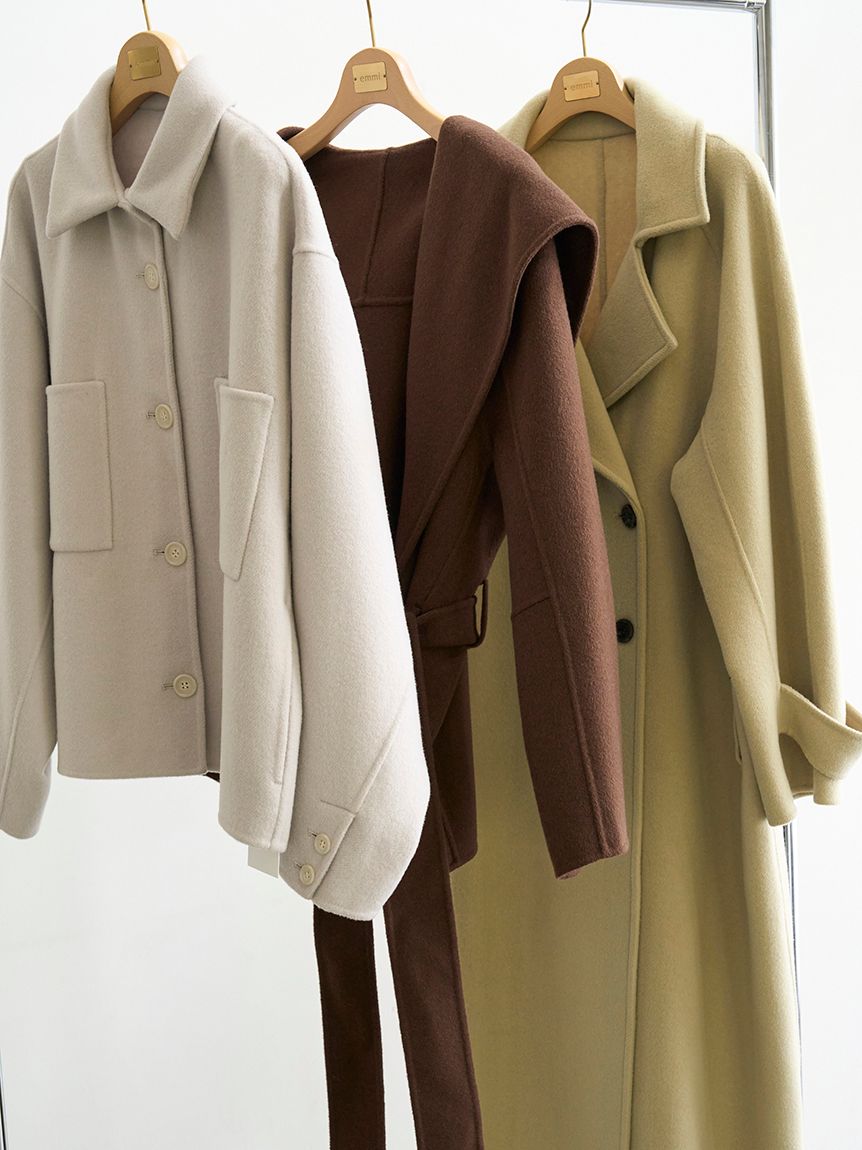 採用去年廣受好評的「Royal Geelong」素材製作的連帽中長版外套登場。質感如羊絨般柔滑,輕盈易穿,舒適好搭配。