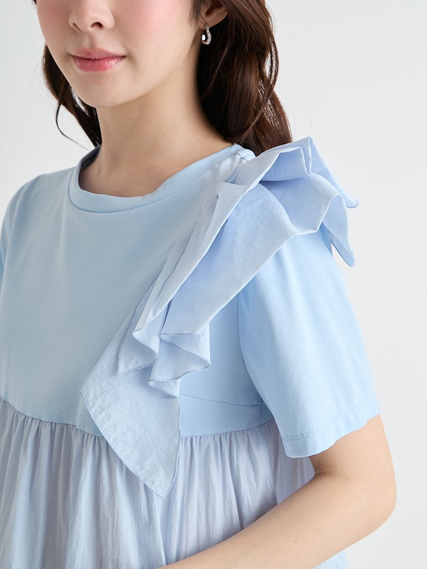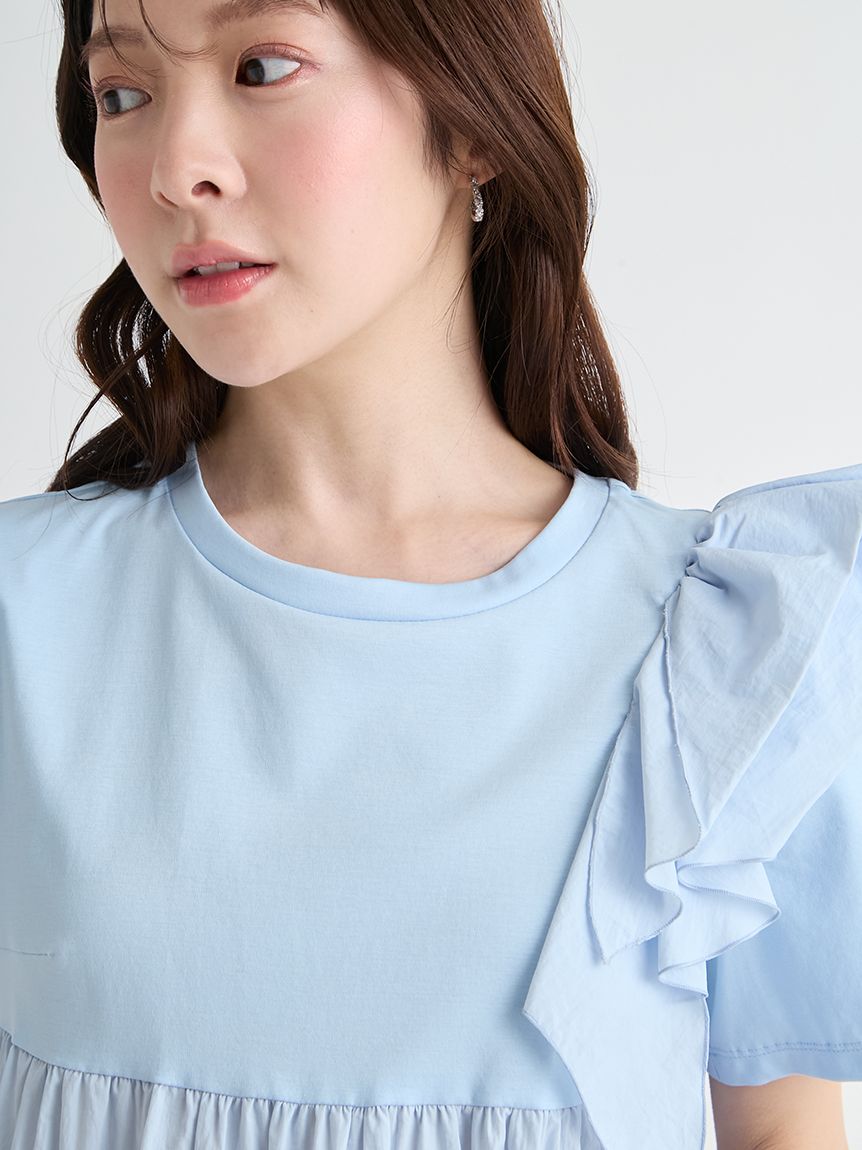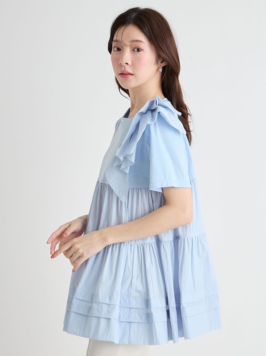 這款連身罩衫採用彈性剪裁布料製成衣領與袖口,肩部荷葉邊及層疊下擺部分則選用挺括的塔夫綢布料。肩部的不對稱荷葉邊設計,為臉部周圍增添華麗感。