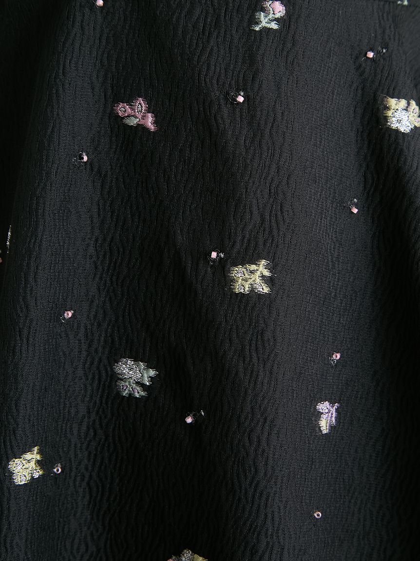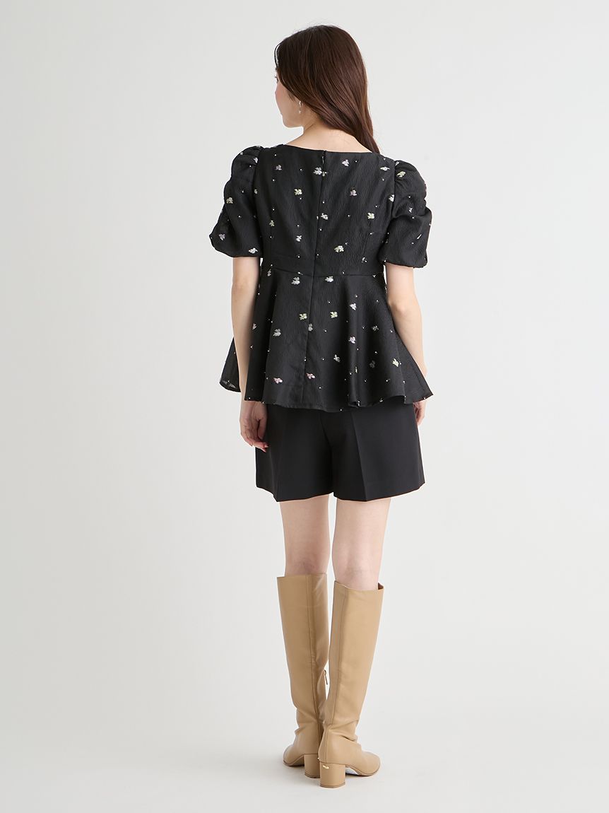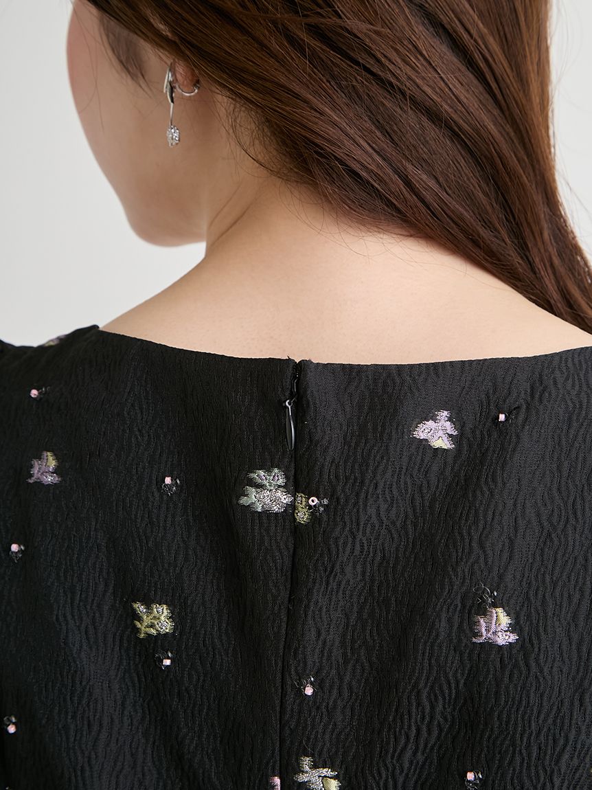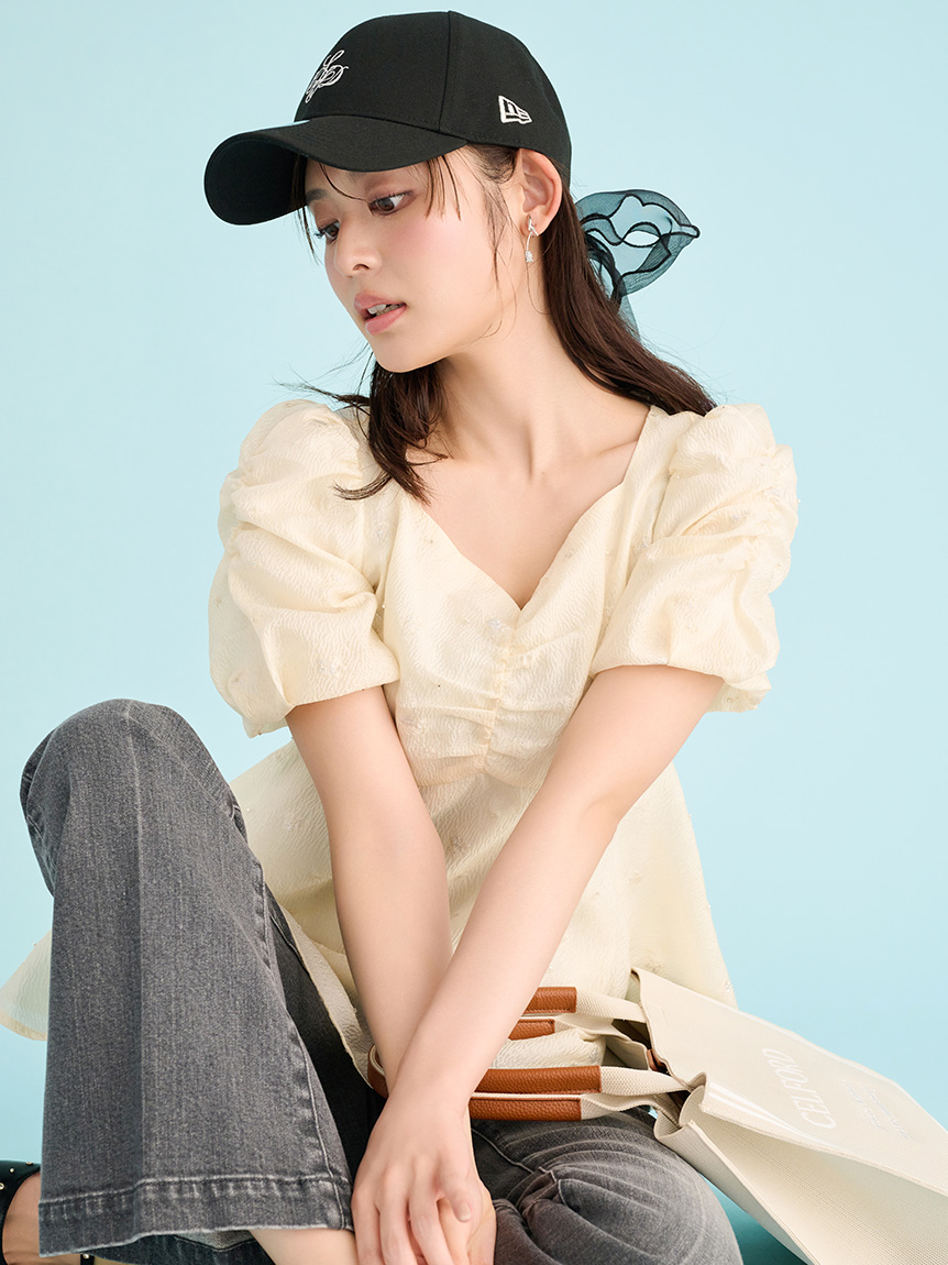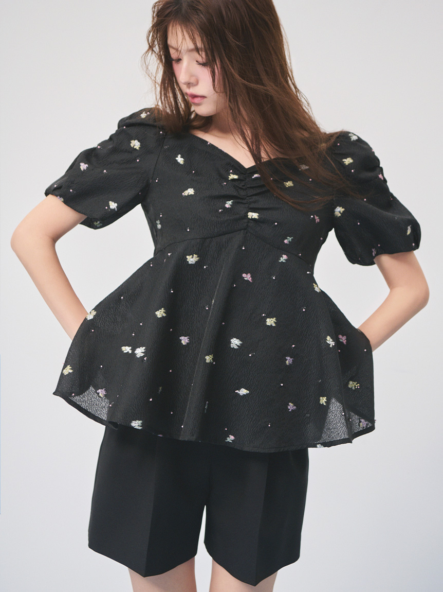 採用小碎花紋提花布料,並在表面點綴珠飾,打造原創質感上衣。