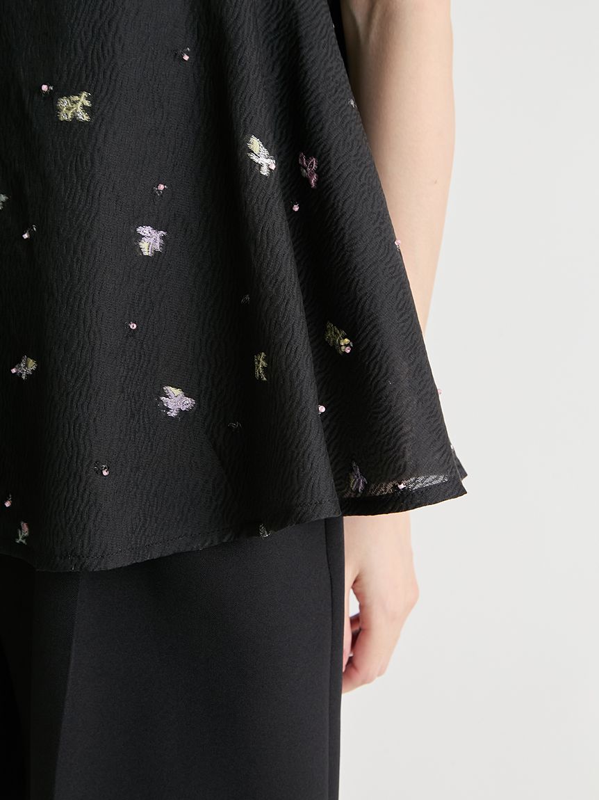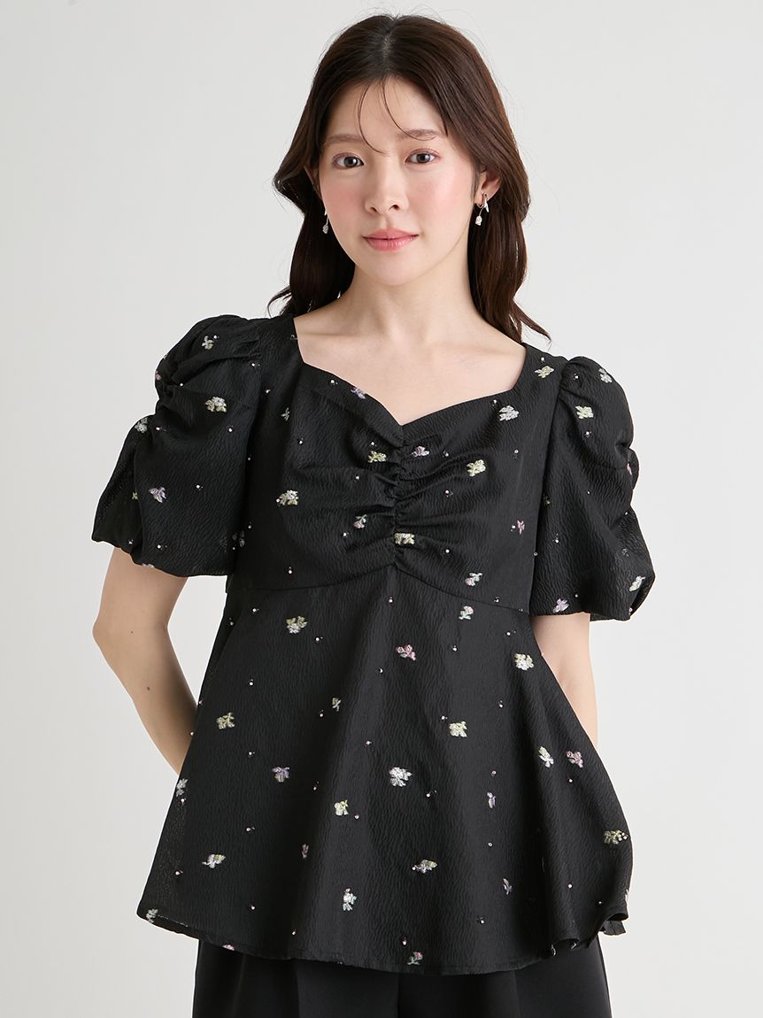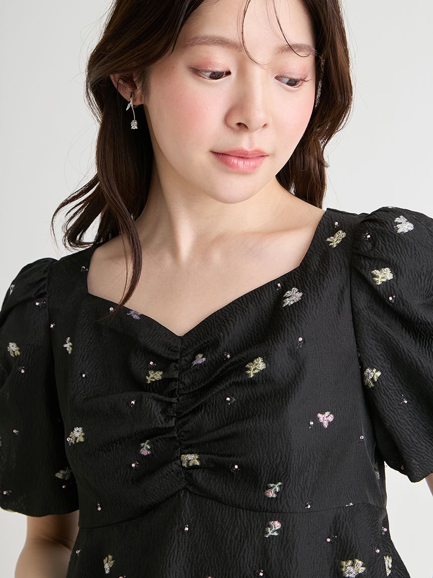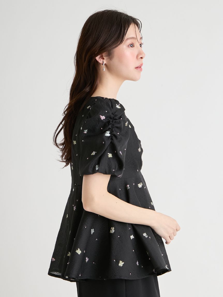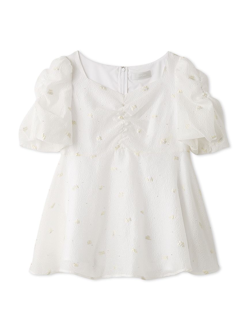 採用小碎花紋提花布料,並在表面點綴珠飾,打造原創質感上衣。