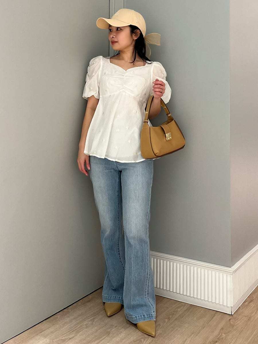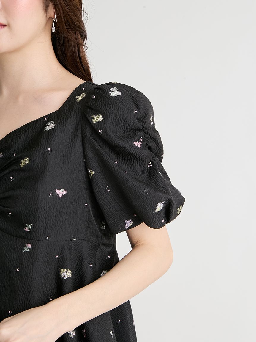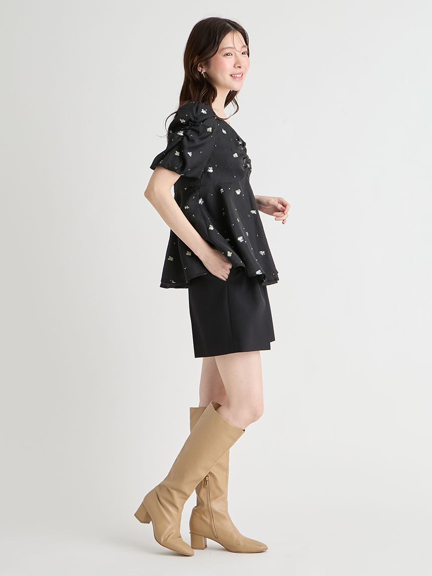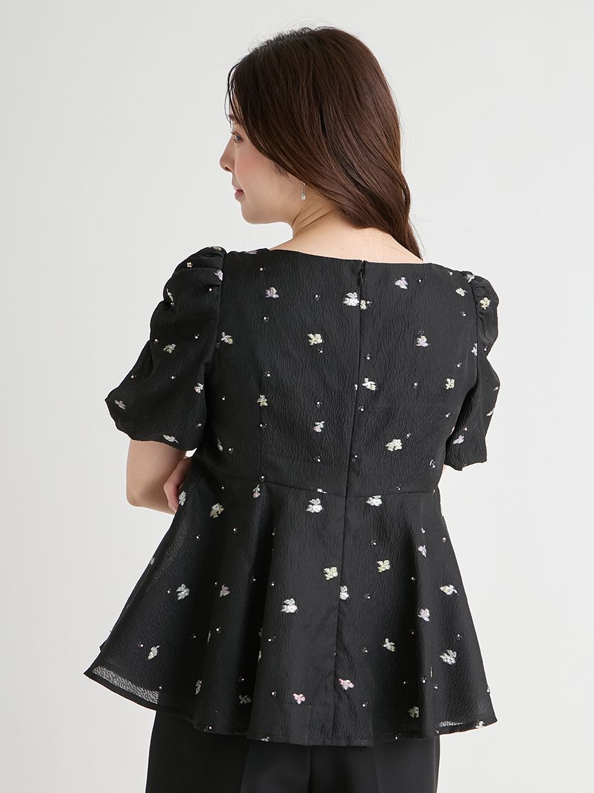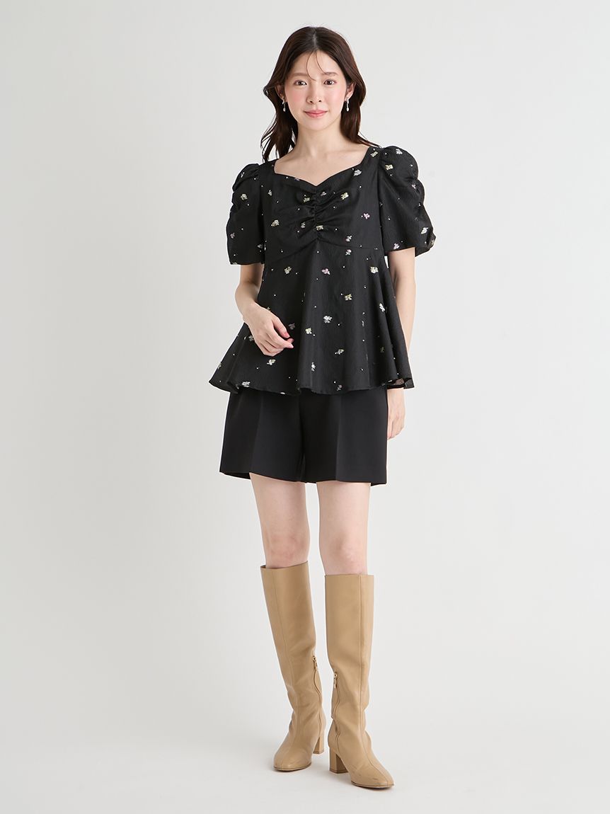 採用小碎花紋提花布料,並在表面點綴珠飾,打造原創質感上衣。