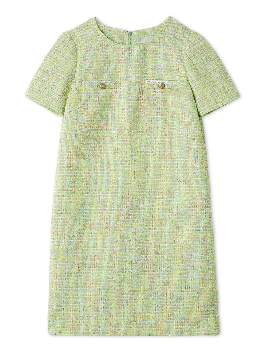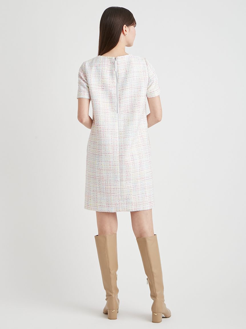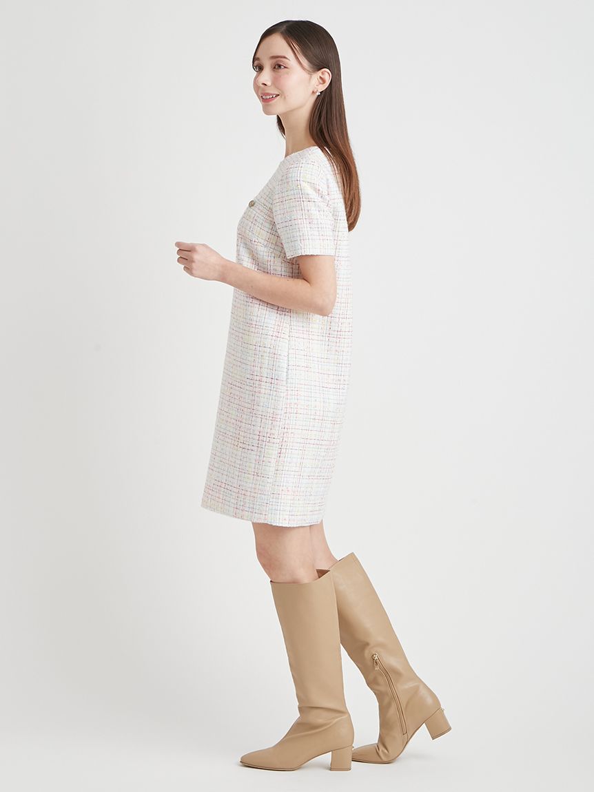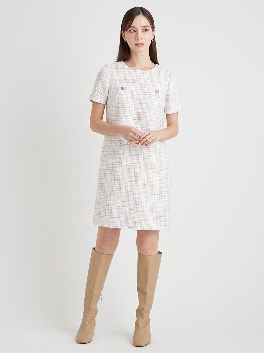 由多種圖案線交織而成的華麗感斜紋軟呢洋裝。