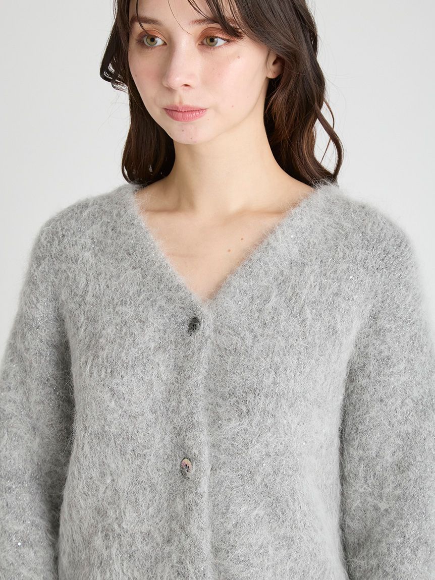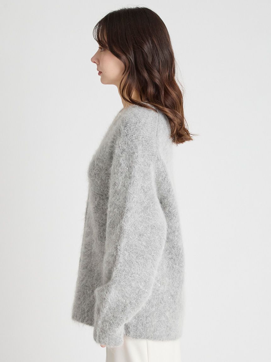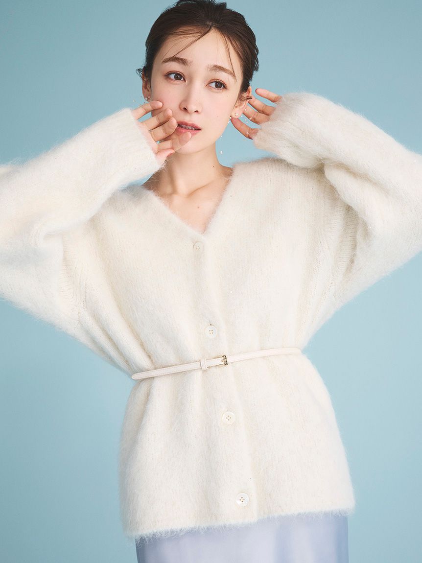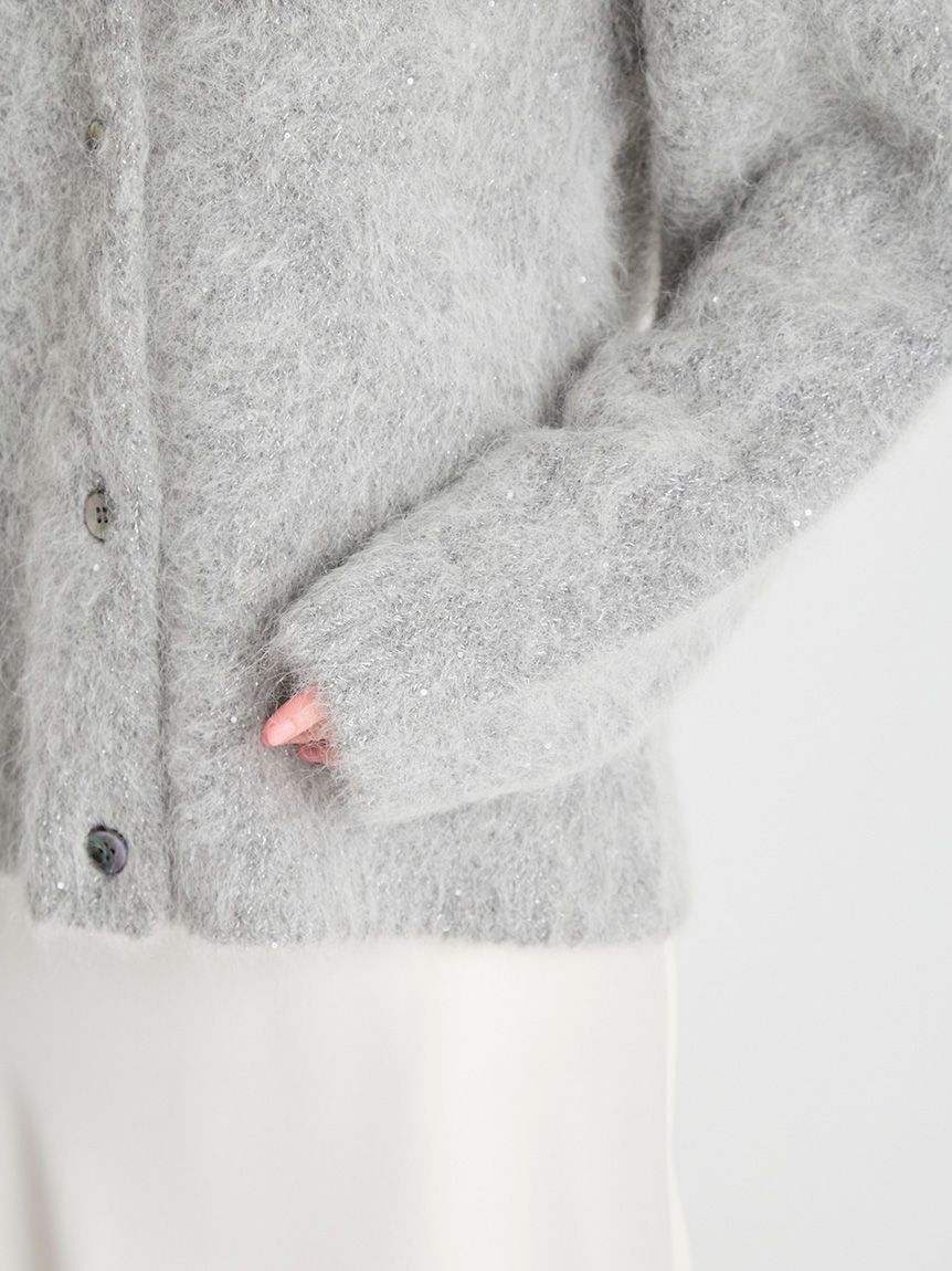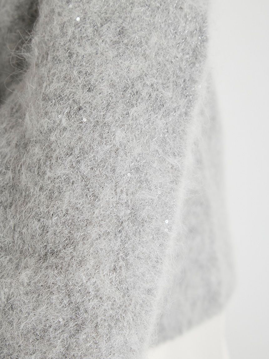 CELFORD經典中長版針織外套,今年以亮片與金線重新詮釋,為節慶季增添華麗氣息。柔軟的羊駝毛線混織迷你亮片與金線,細緻閃爍中帶出高雅質地,並以同色系貝殼釦點綴。