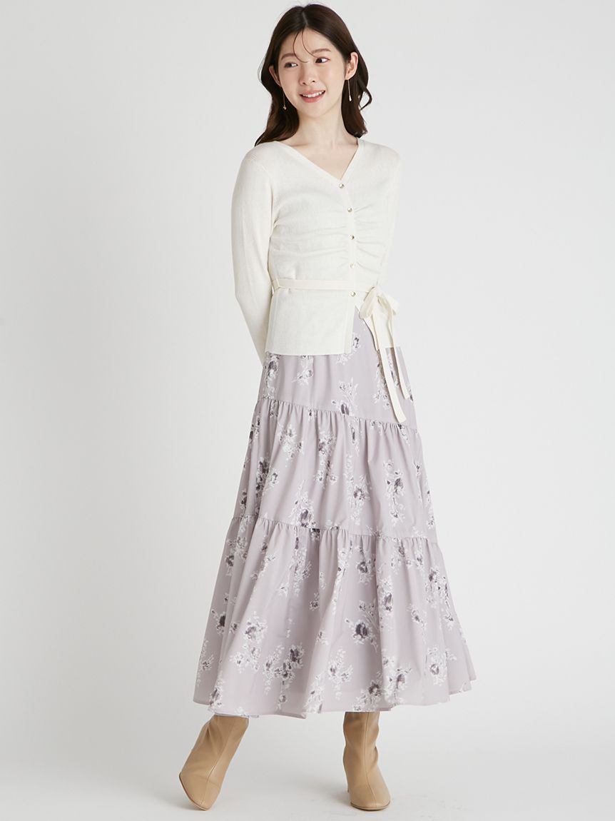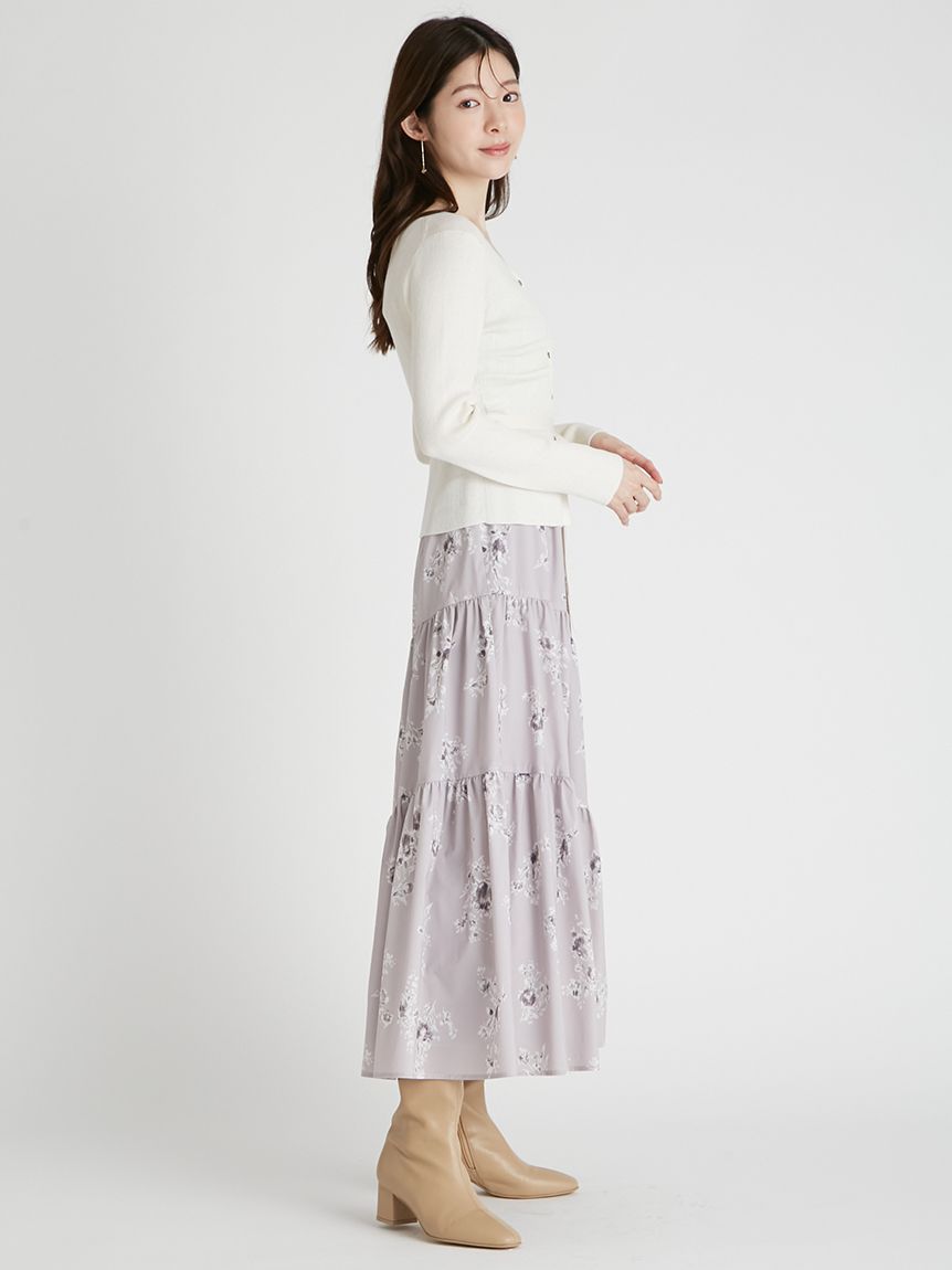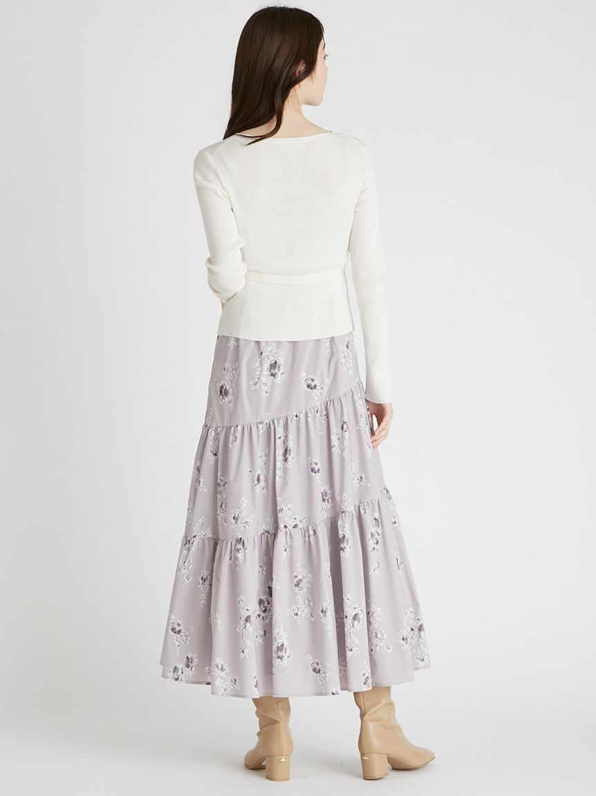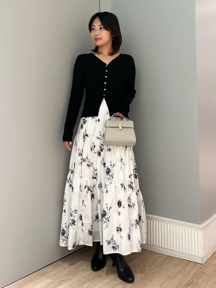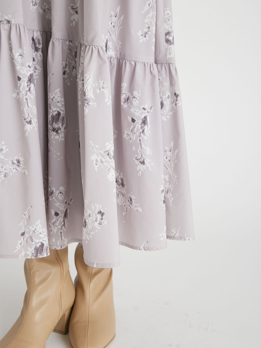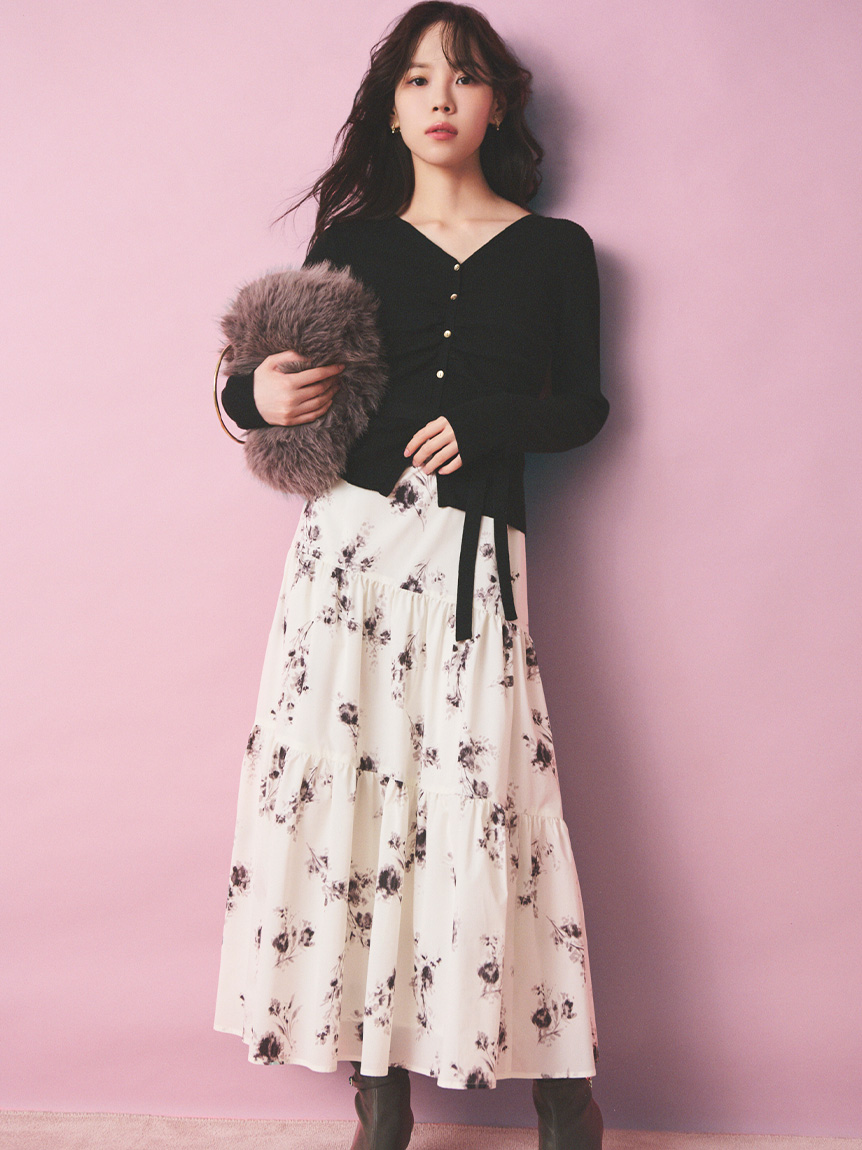 裙擺部分使用薄款塔夫綢布料,印製品牌原創花卉圖案,增添精緻。