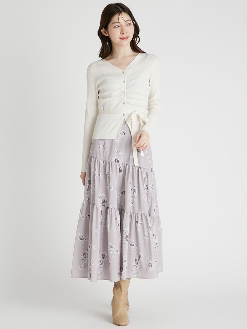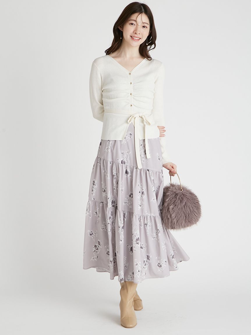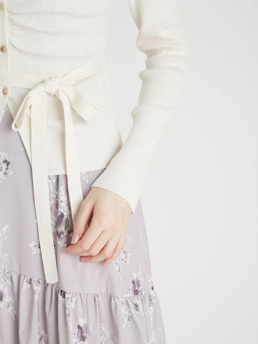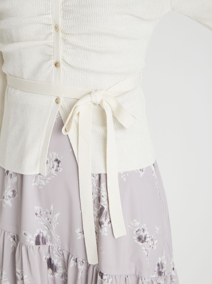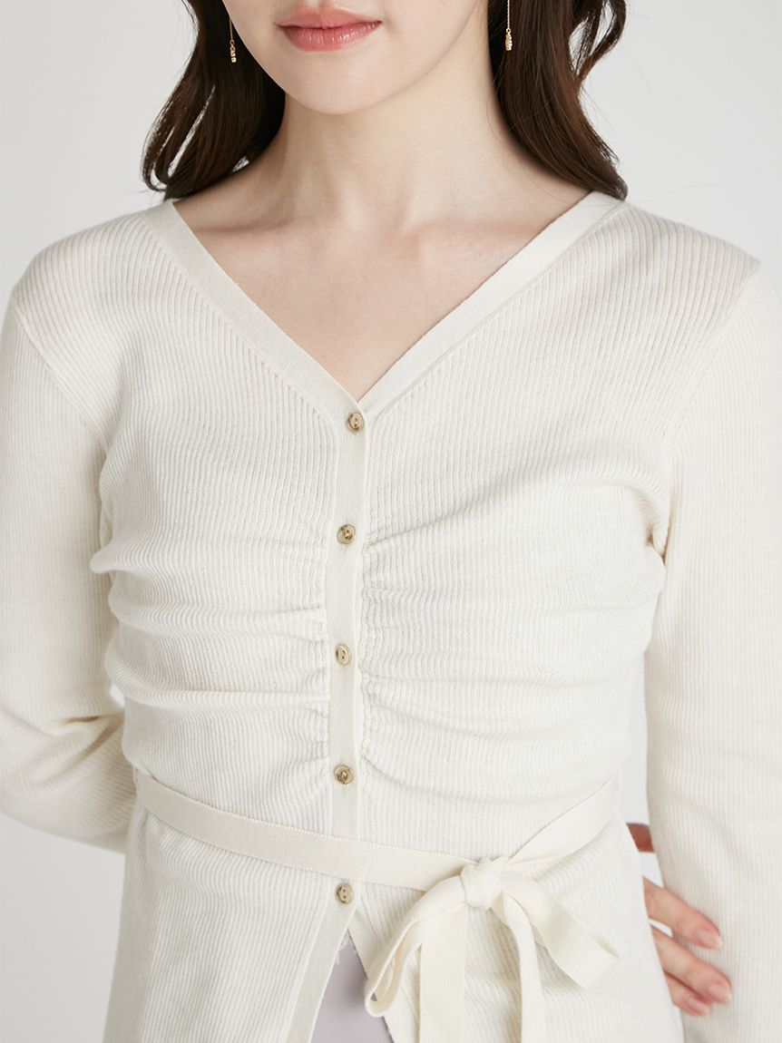 針織外套採用絲質混紡柔軟紗線,觸感細膩,前中心的皺褶因柔軟材質而呈現自然美感。