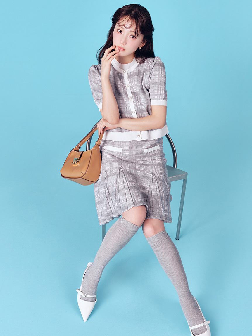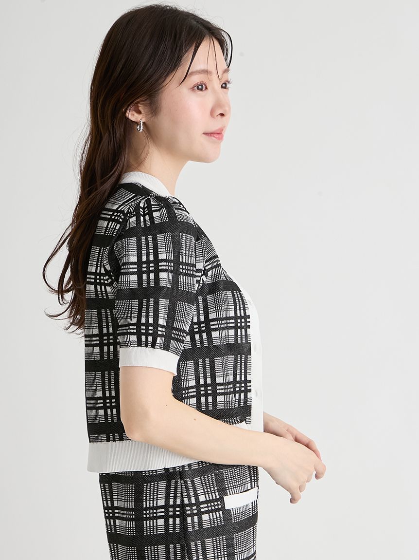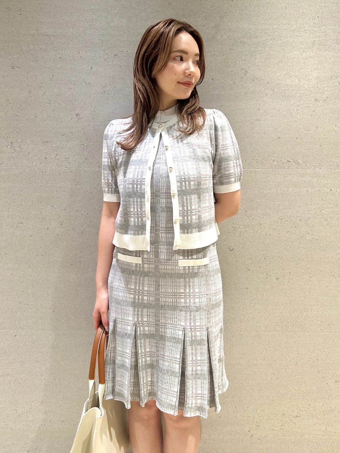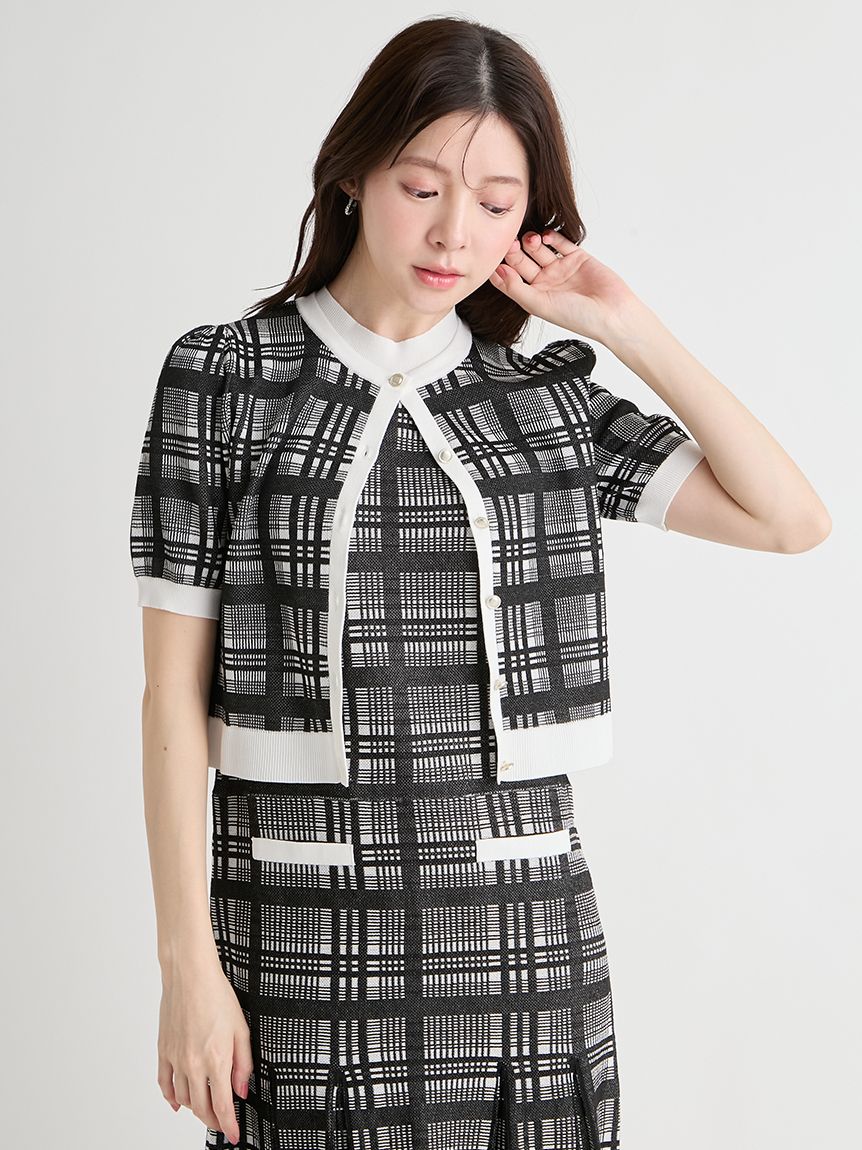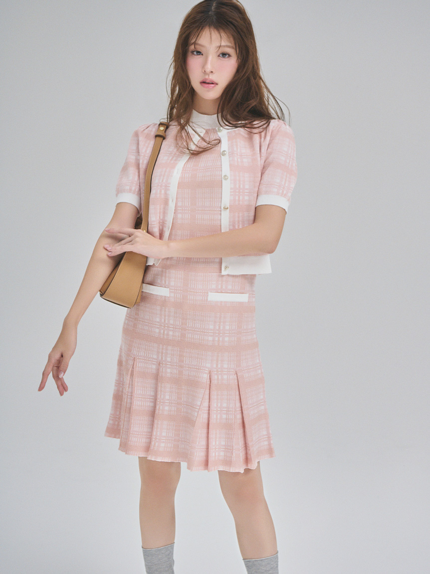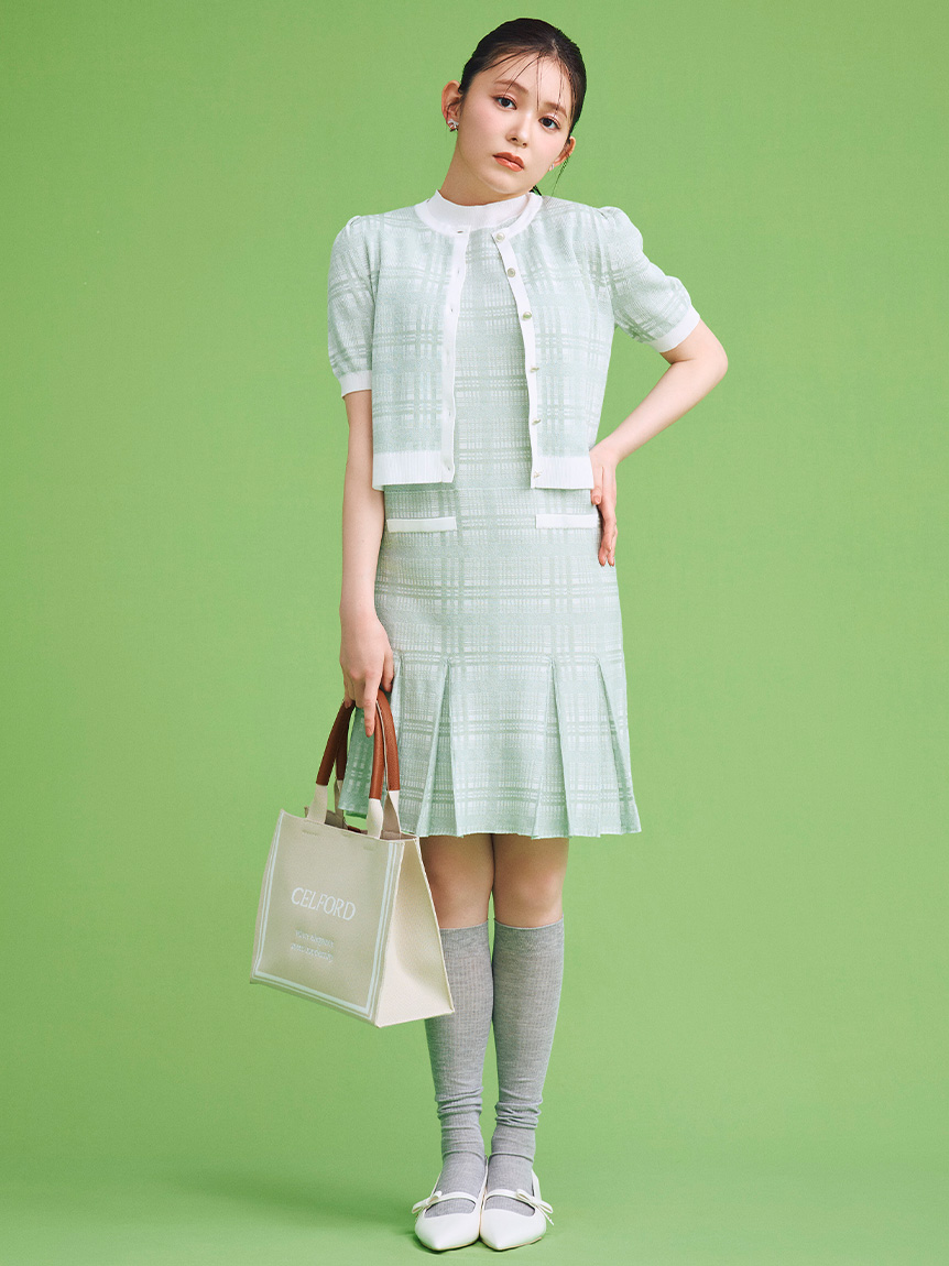 【細緻格紋短袖開襟外套與針織迷你洋裝的SET單品】