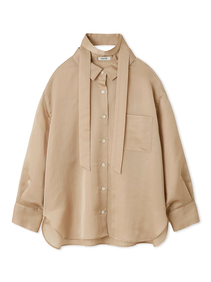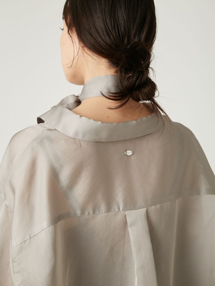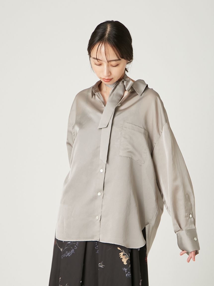 【可休閒亦可優雅穿搭的透膚緞面襯衫,附可拆式頸鍊綁帶】