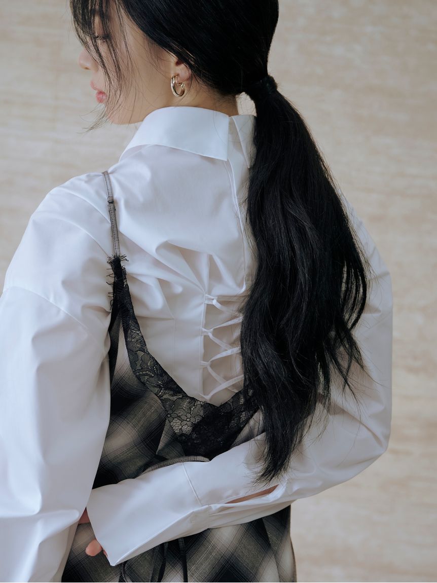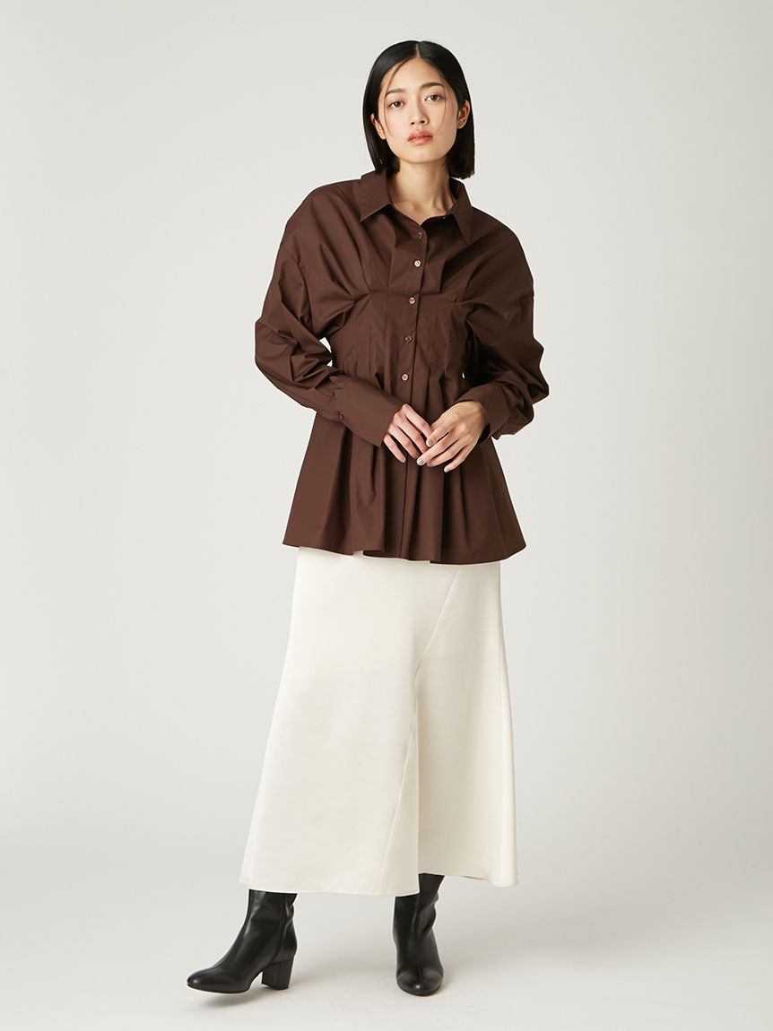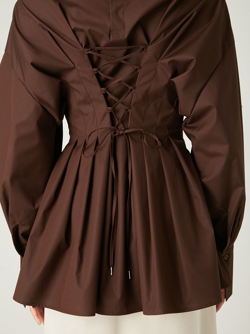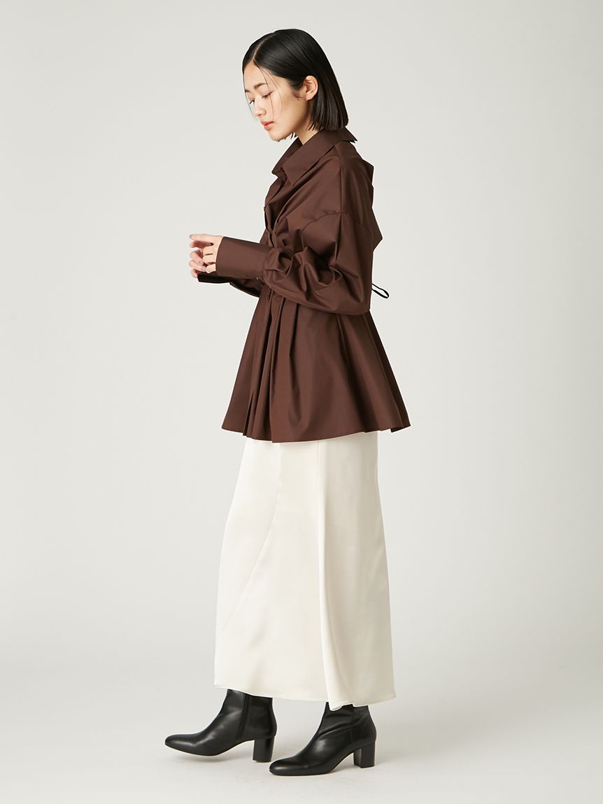 背部綁帶設計,使後姿也充滿細節。採中等挺度的襯衫布料,營造立體優美的輪廓。前後腰部均設置打摺,呈現自然修飾線條。