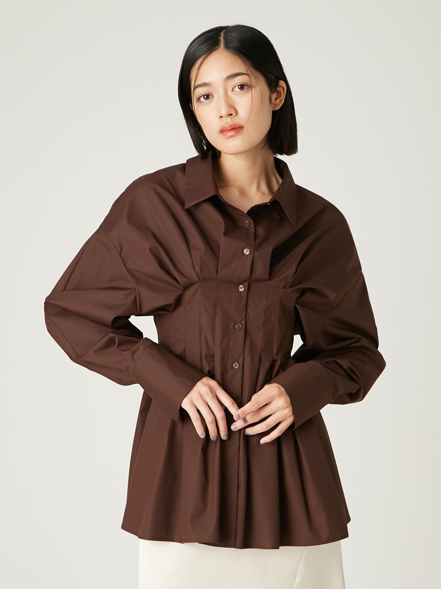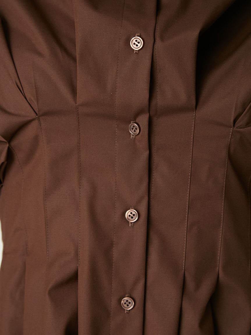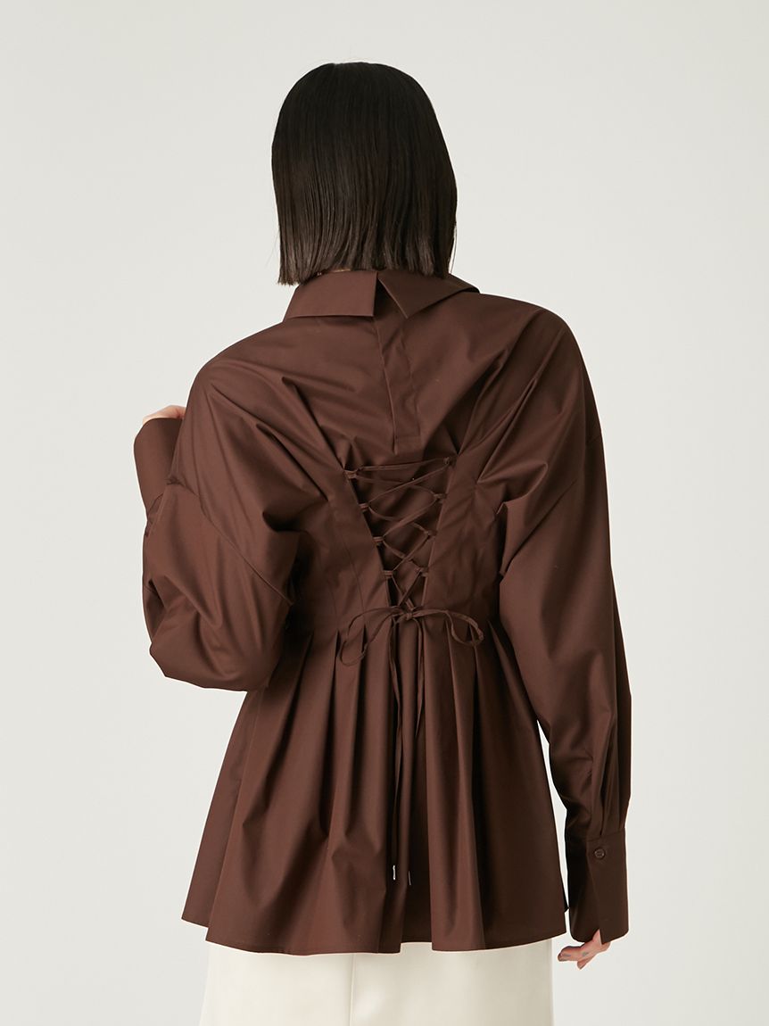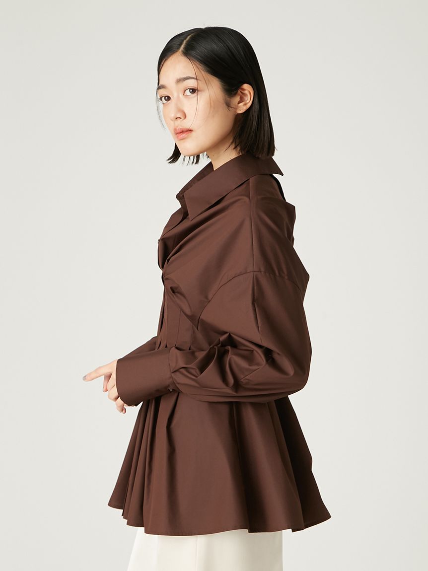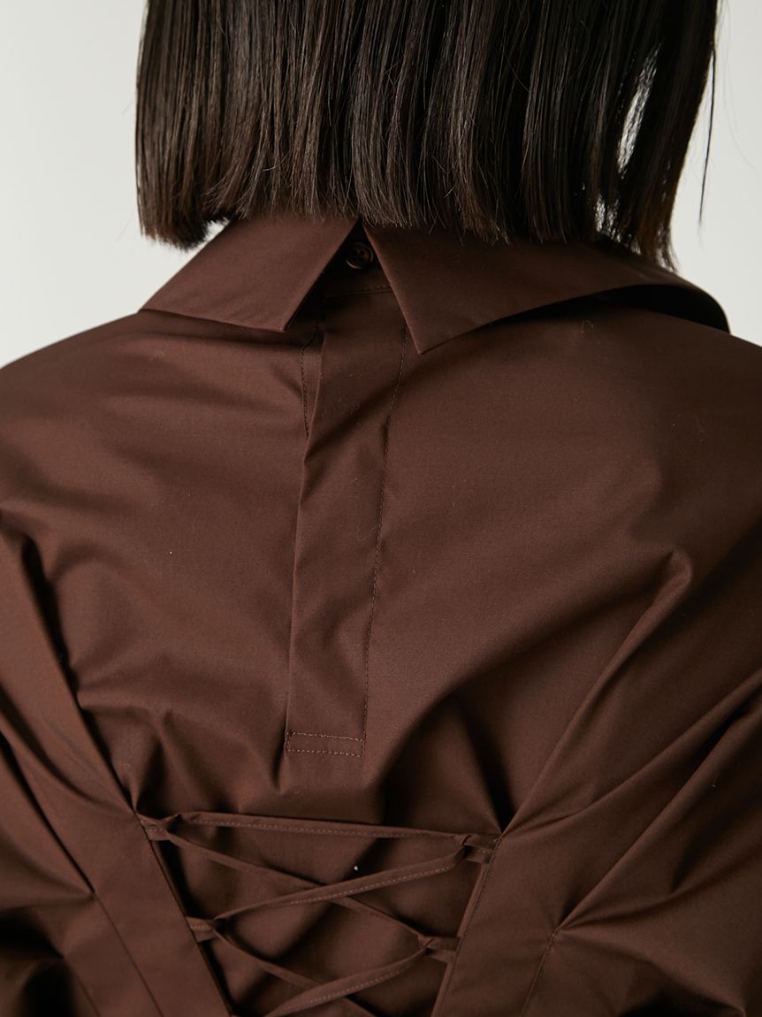 背部綁帶設計,使後姿也充滿細節。採中等挺度的襯衫布料,營造立體優美的輪廓。前後腰部均設置打摺,呈現自然修飾線條。