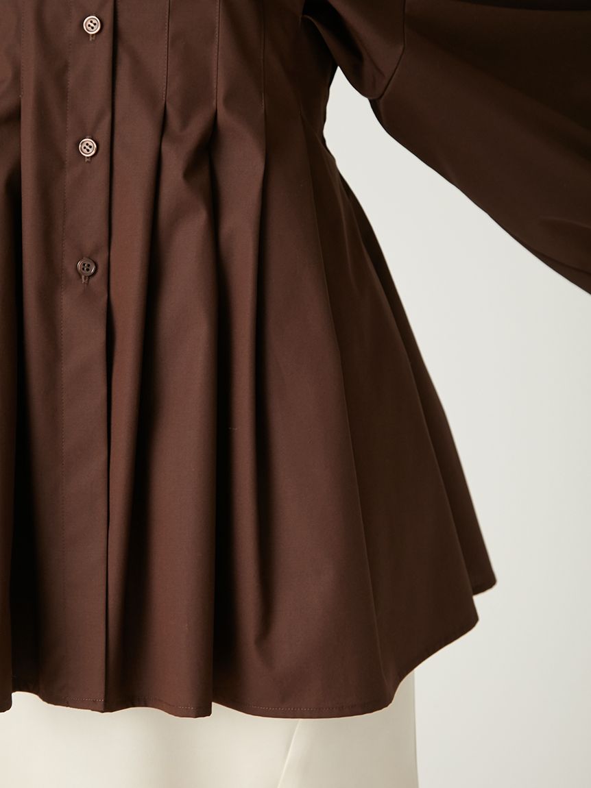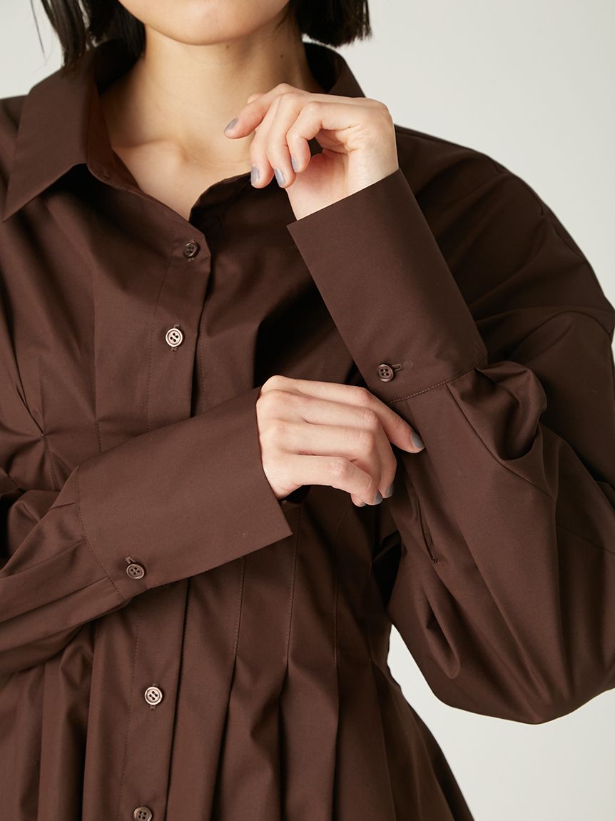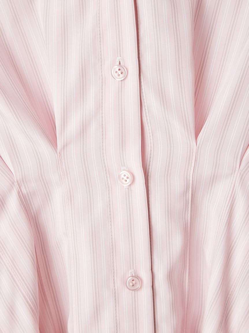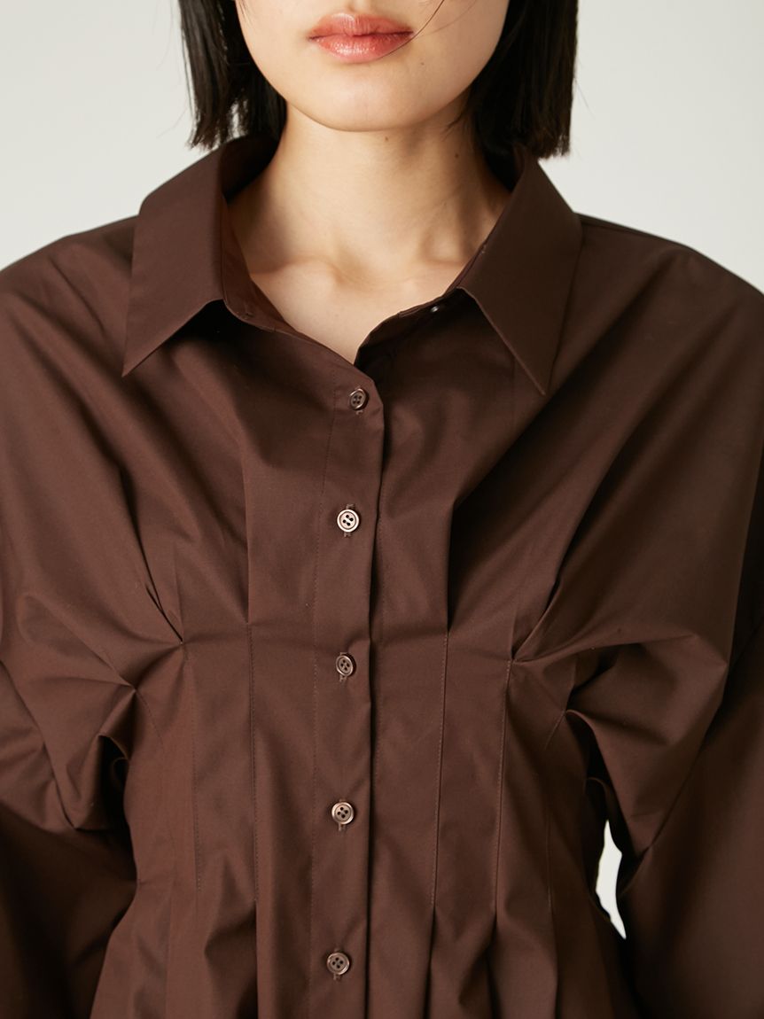 背部綁帶設計,使後姿也充滿細節。採中等挺度的襯衫布料,營造立體優美的輪廓。前後腰部均設置打摺,呈現自然修飾線條。