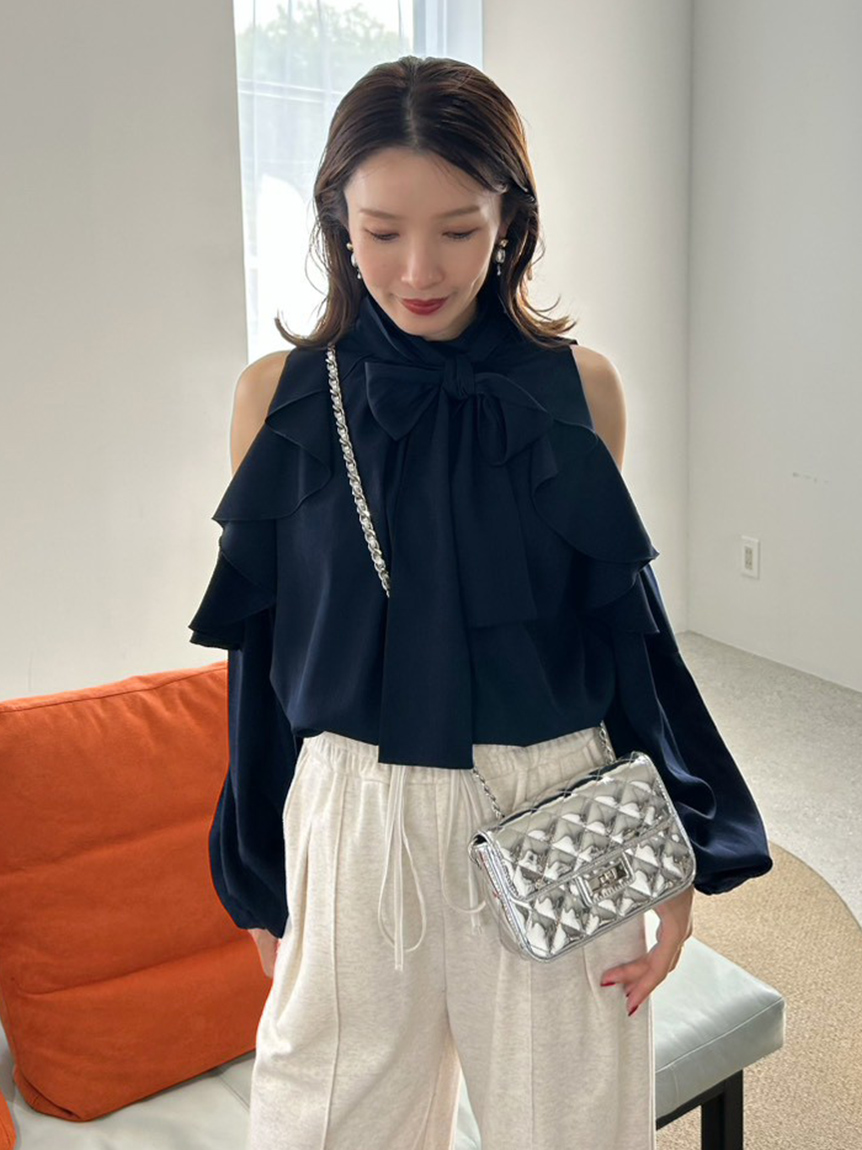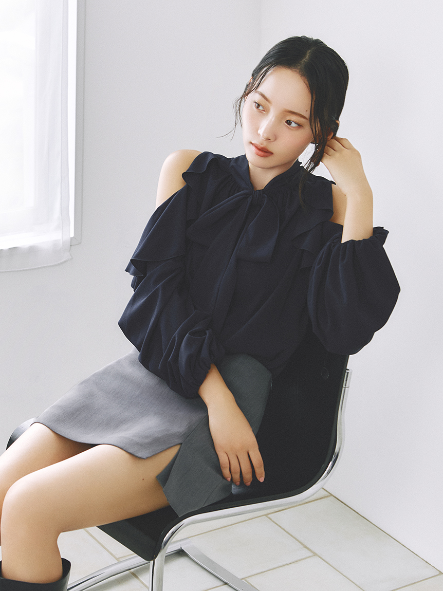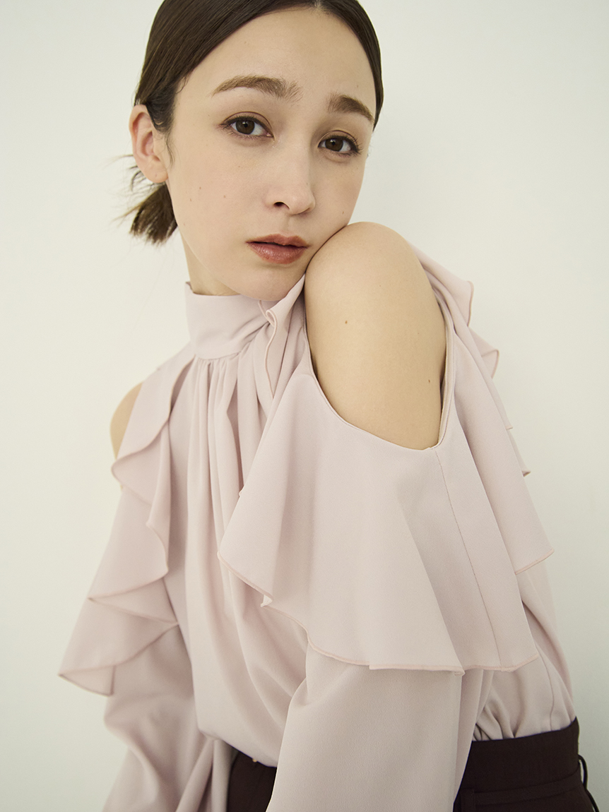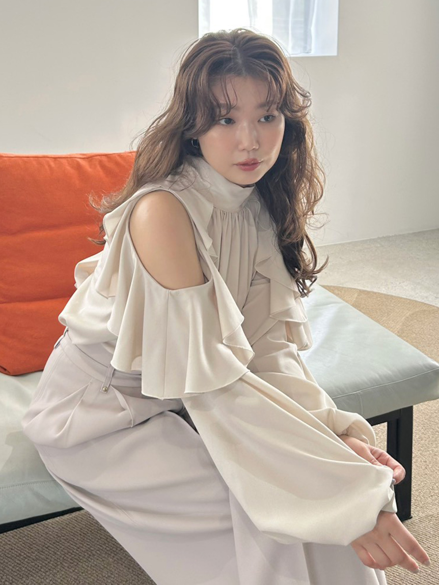 肩部流暢的荷葉邊設計與優雅露膚感,讓這件上衣成為造型主角。