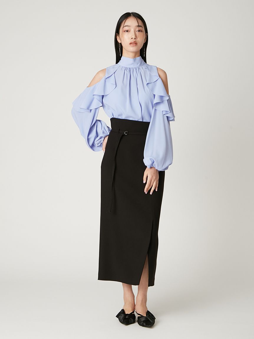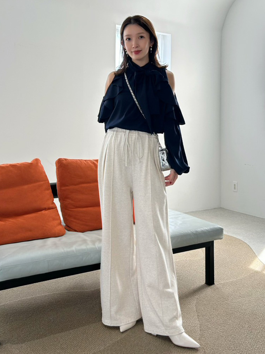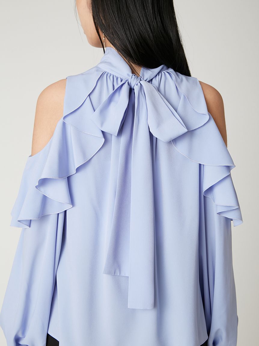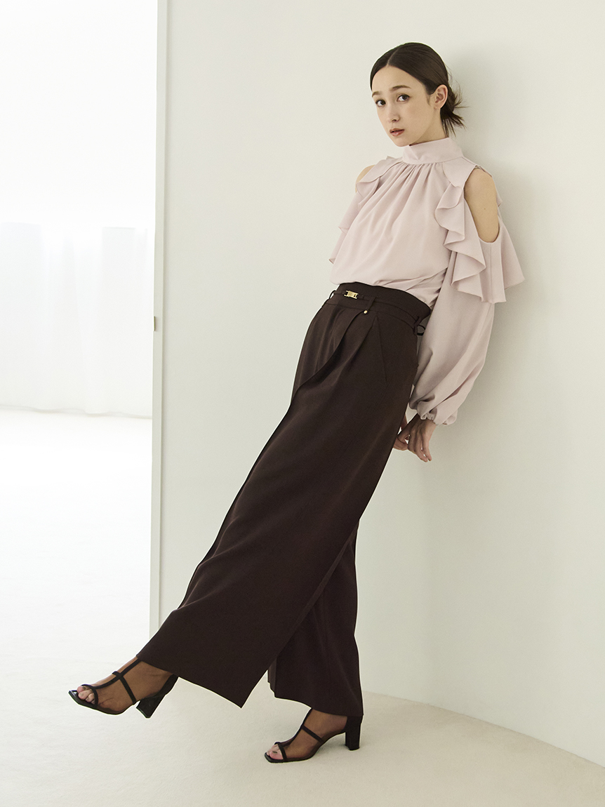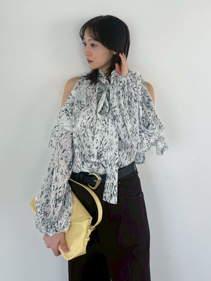 肩部流暢的荷葉邊設計與優雅露膚感,讓這件上衣成為造型主角。