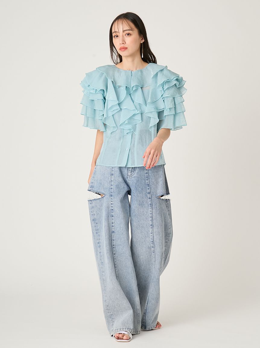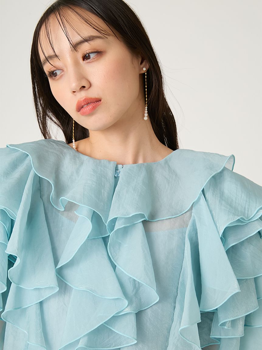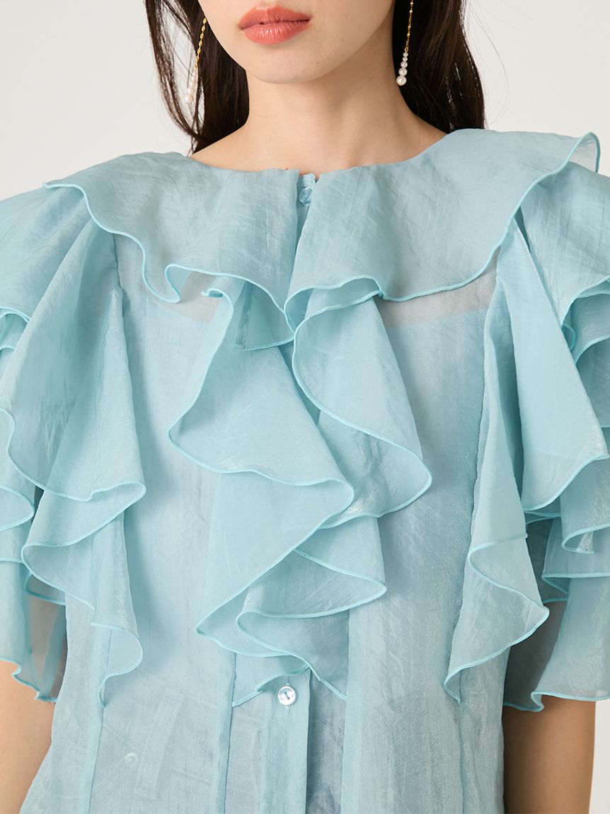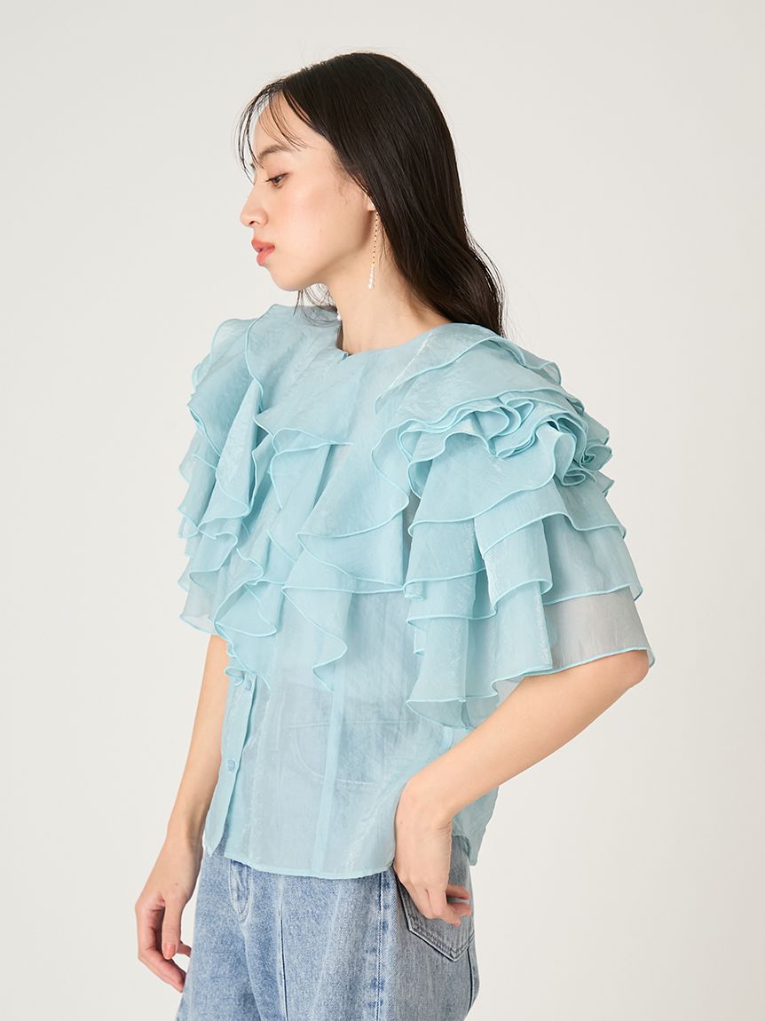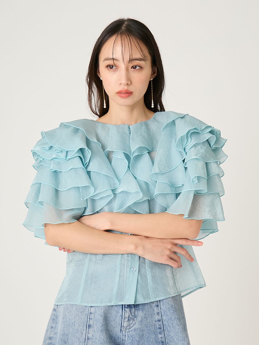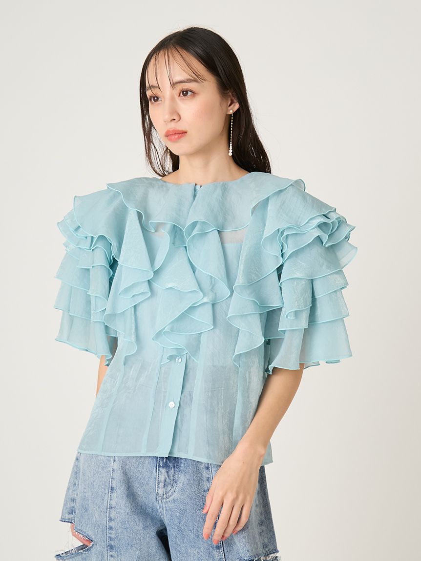 花瓣般層疊的透視荷葉邊襯衫,吸睛十足。