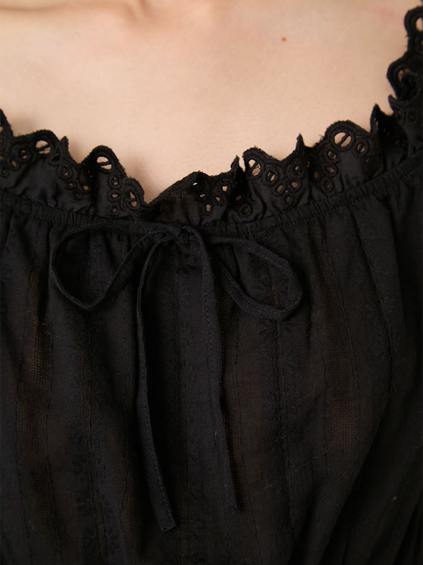 採用棉質透膚緹花面料,於領口、袖口與下擺點綴原創波浪滾邊蕾絲,呈現細緻華麗感。
