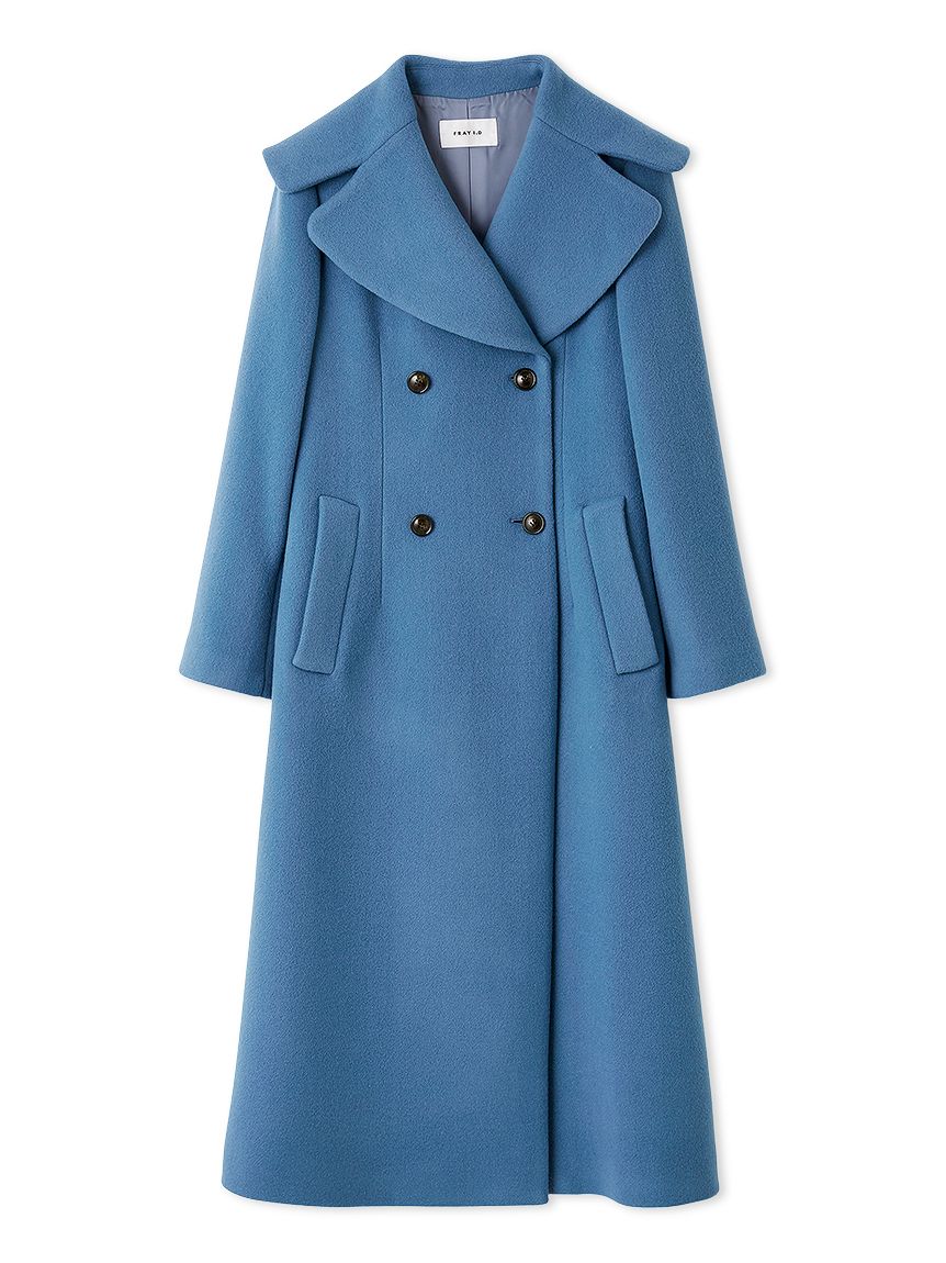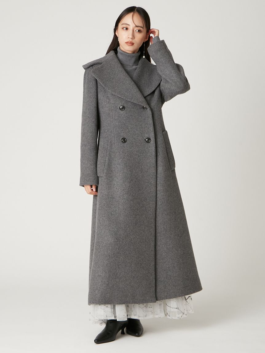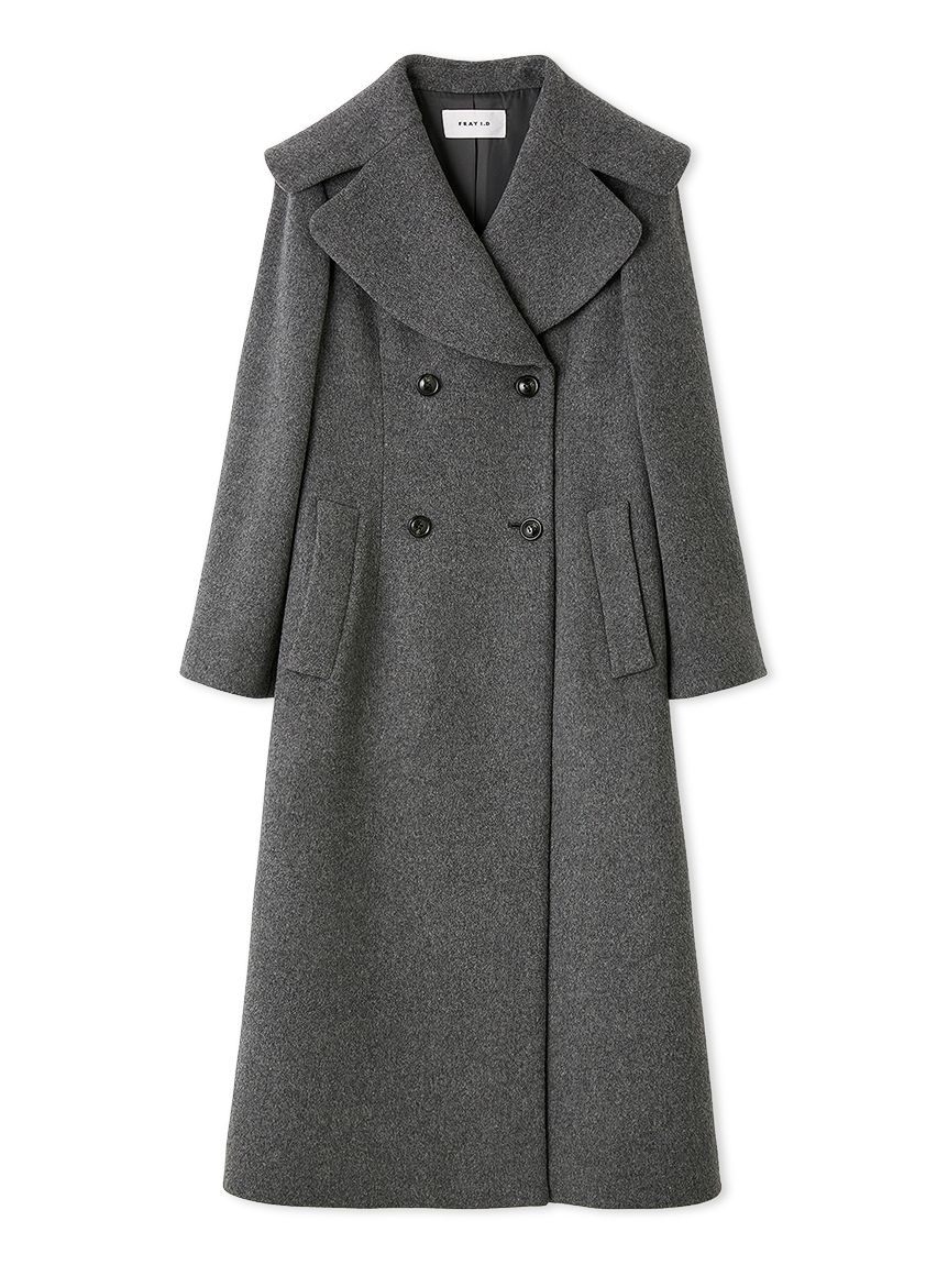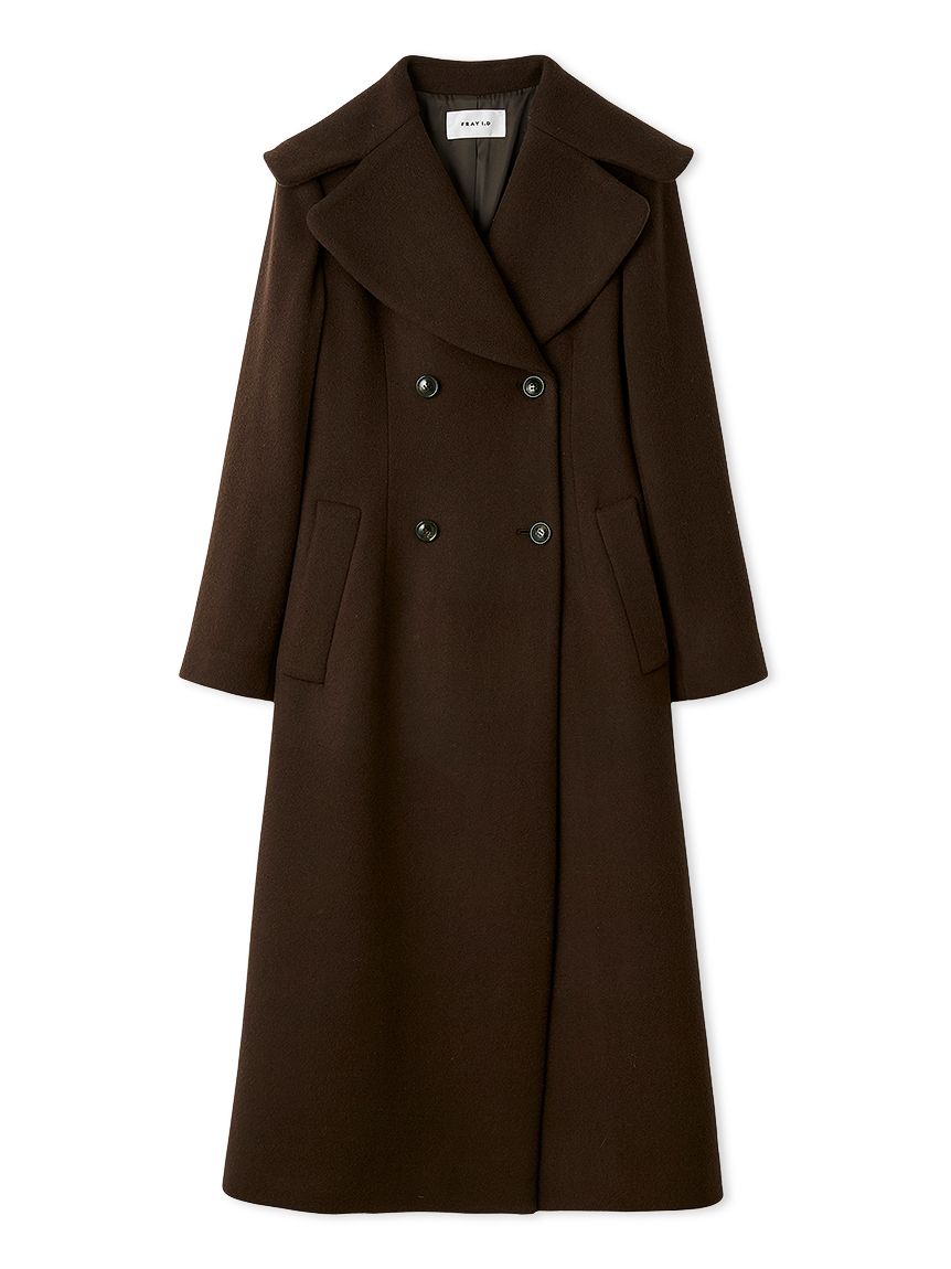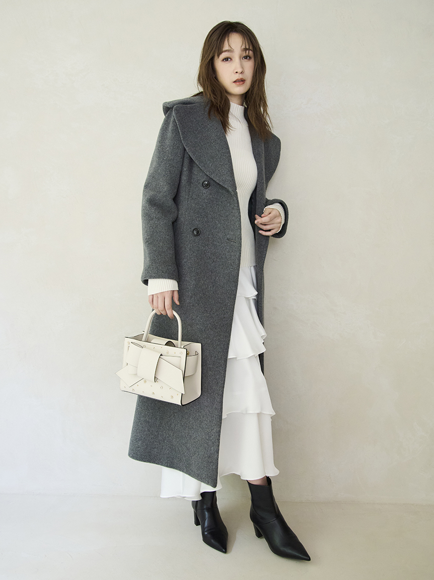 以洗鍊的長版羊毛大衣為基底,搭配醒目的寬大領口增添優雅點綴。