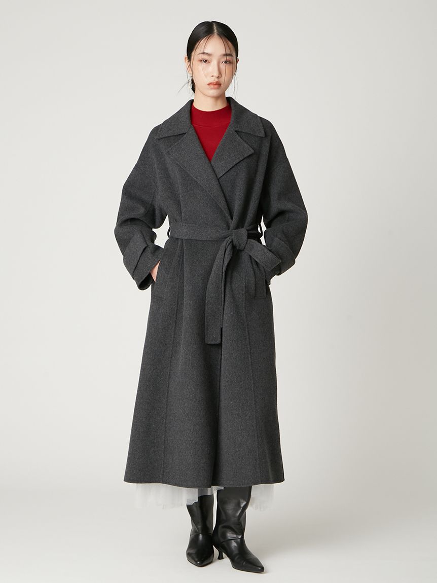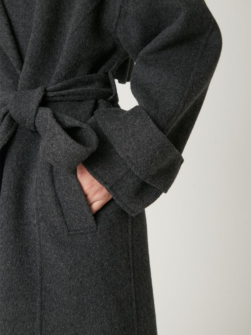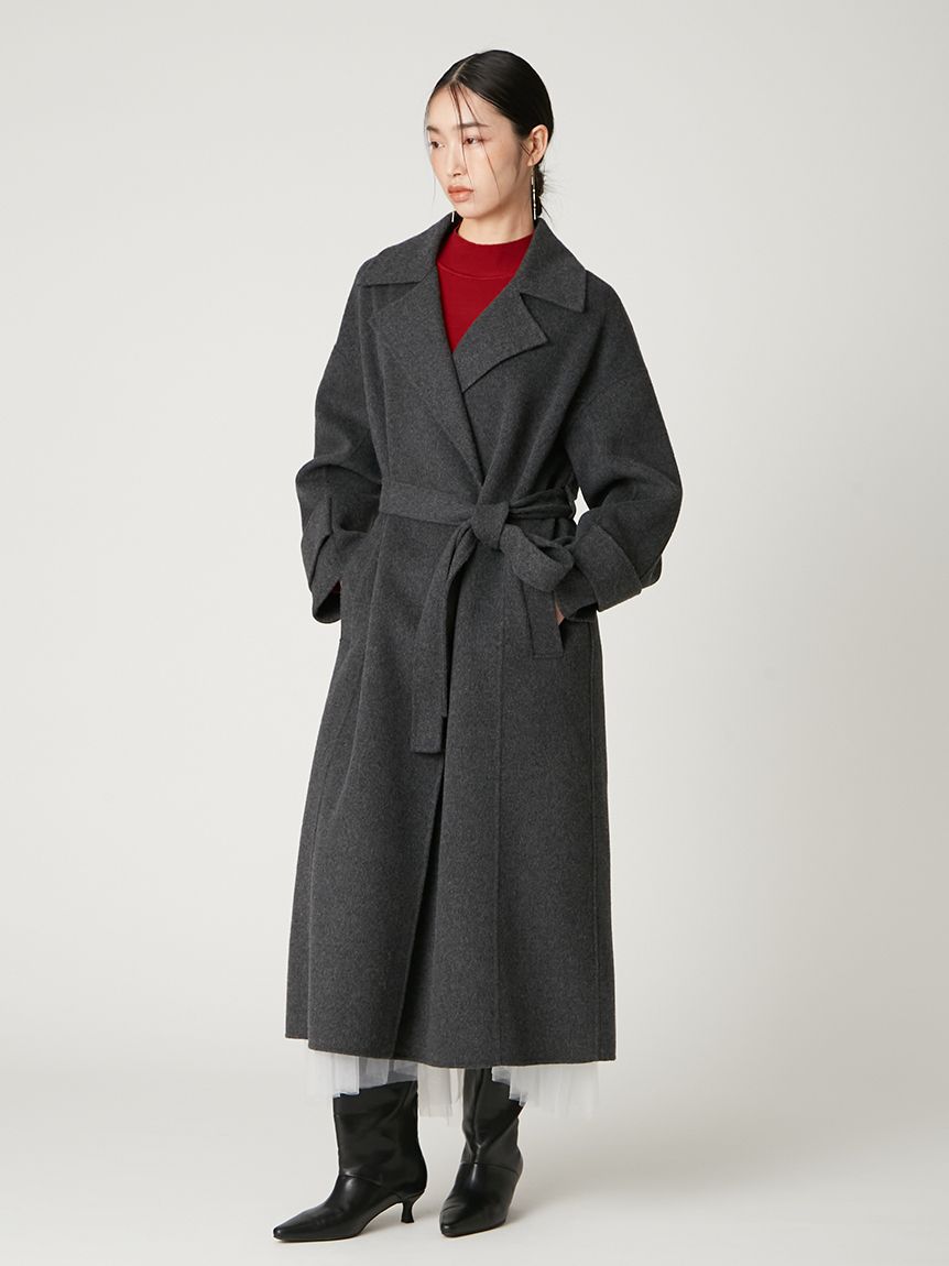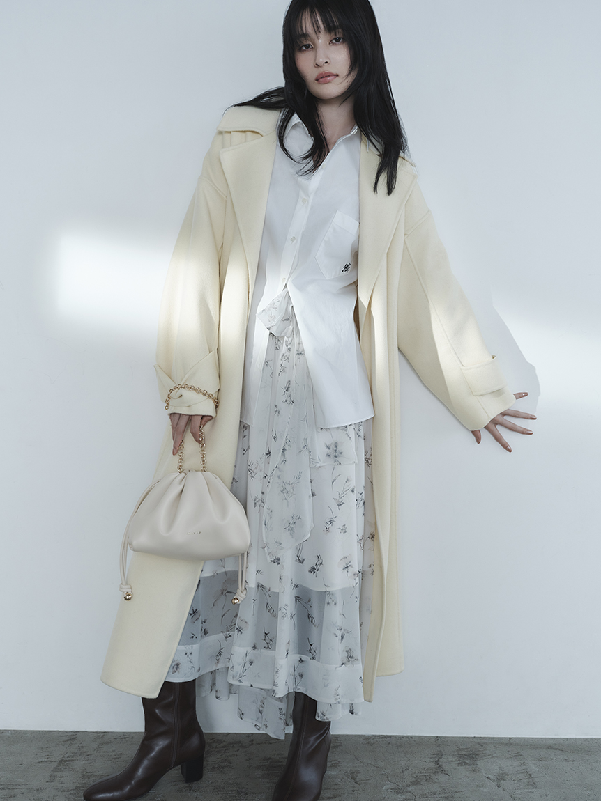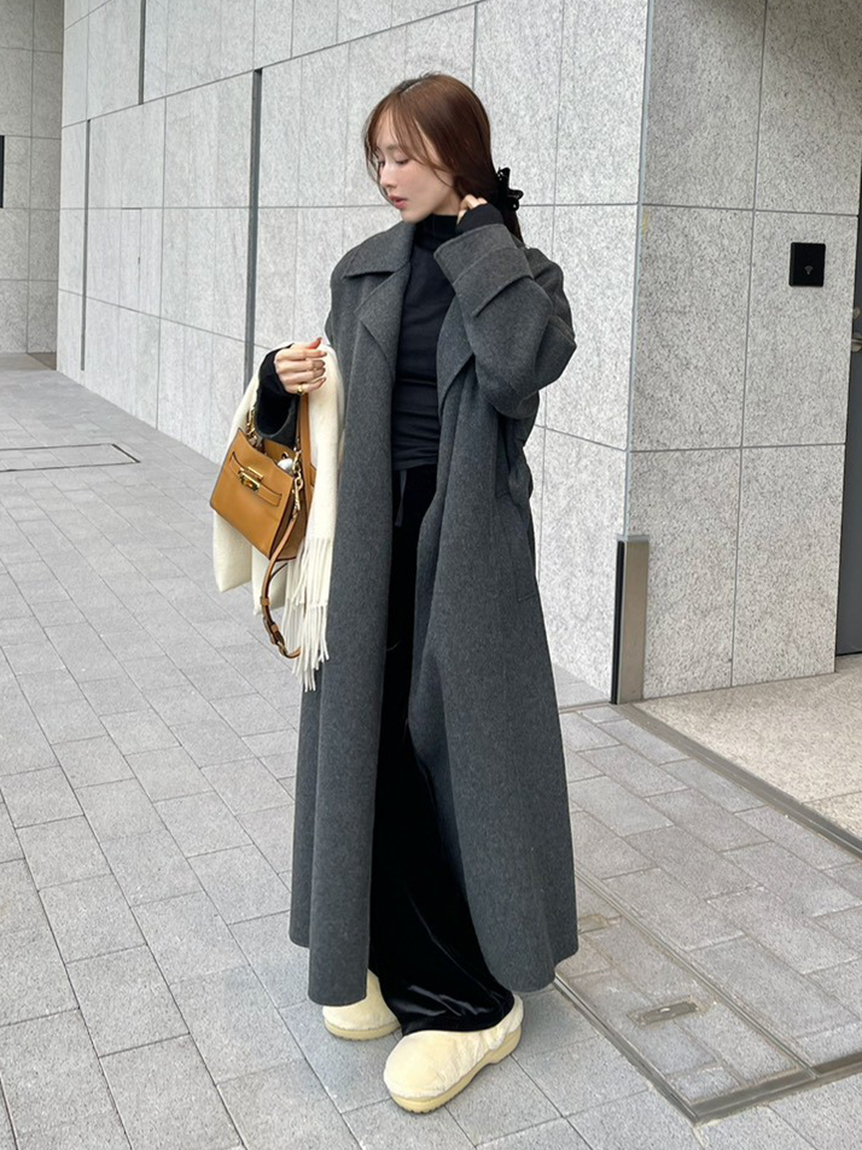 無鈕釦與拉鍊設計,以腰帶繫合的穿著方式,展現優雅且洗鍊的氛圍。此次採用輕盈且保暖的雙面縫製工藝製作,帶來舒適包覆感。