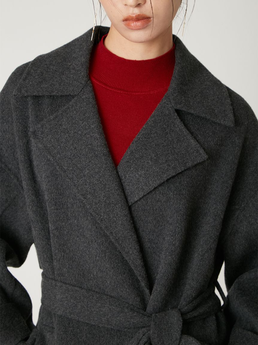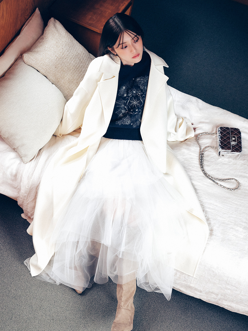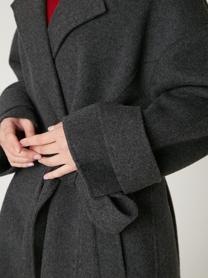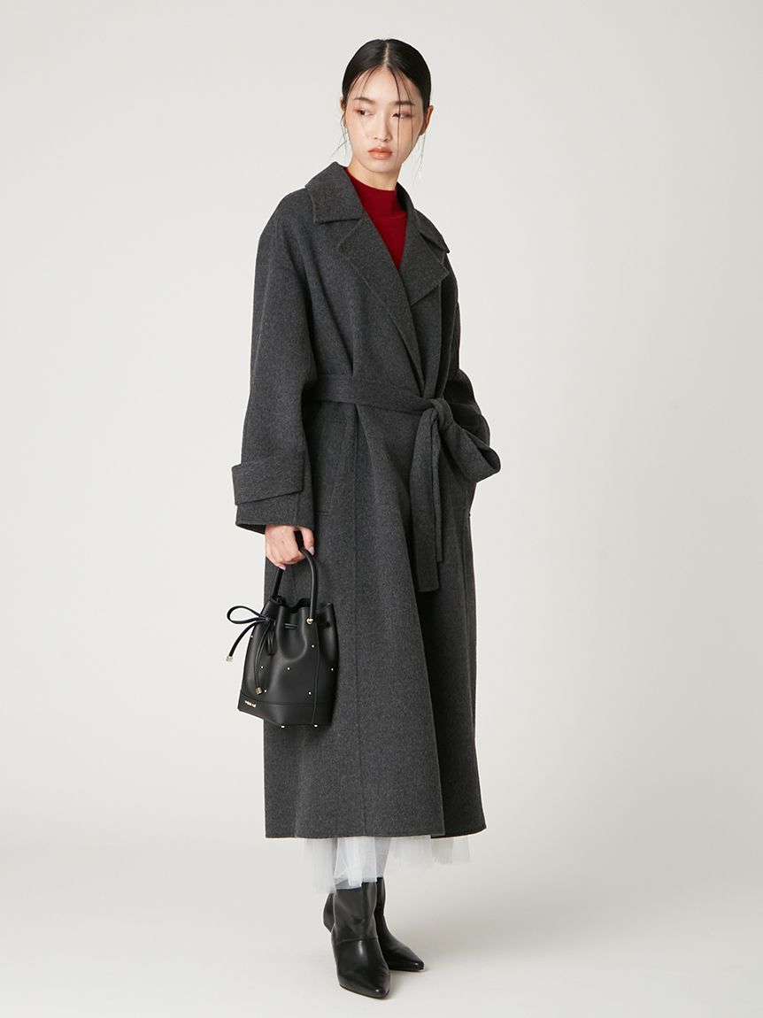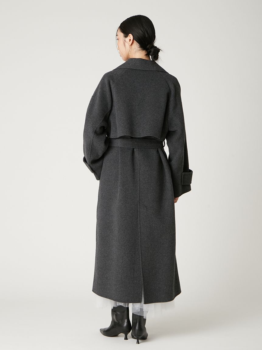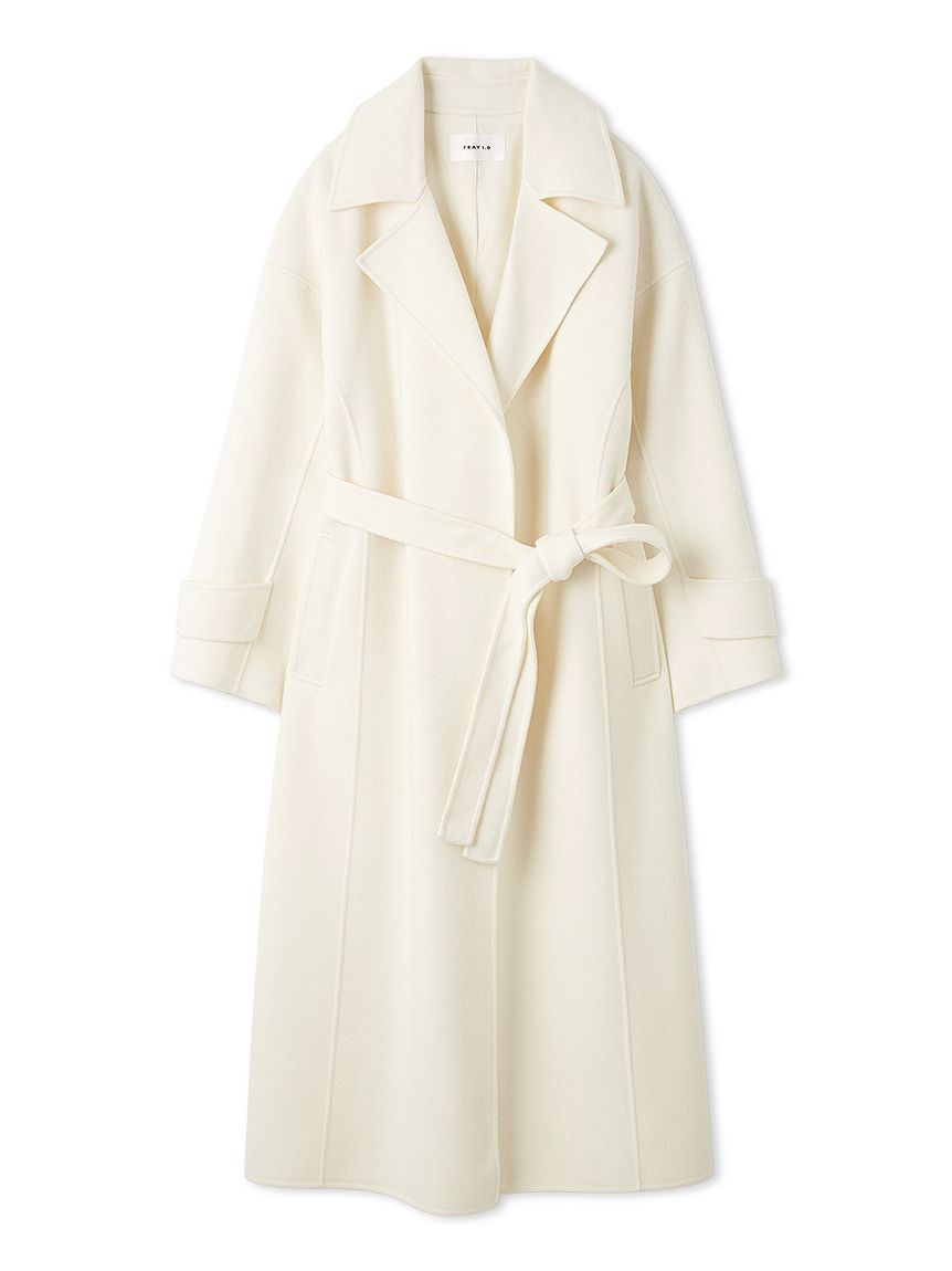 無鈕釦與拉鍊設計,以腰帶繫合的穿著方式,展現優雅且洗鍊的氛圍。此次採用輕盈且保暖的雙面縫製工藝製作,帶來舒適包覆感。