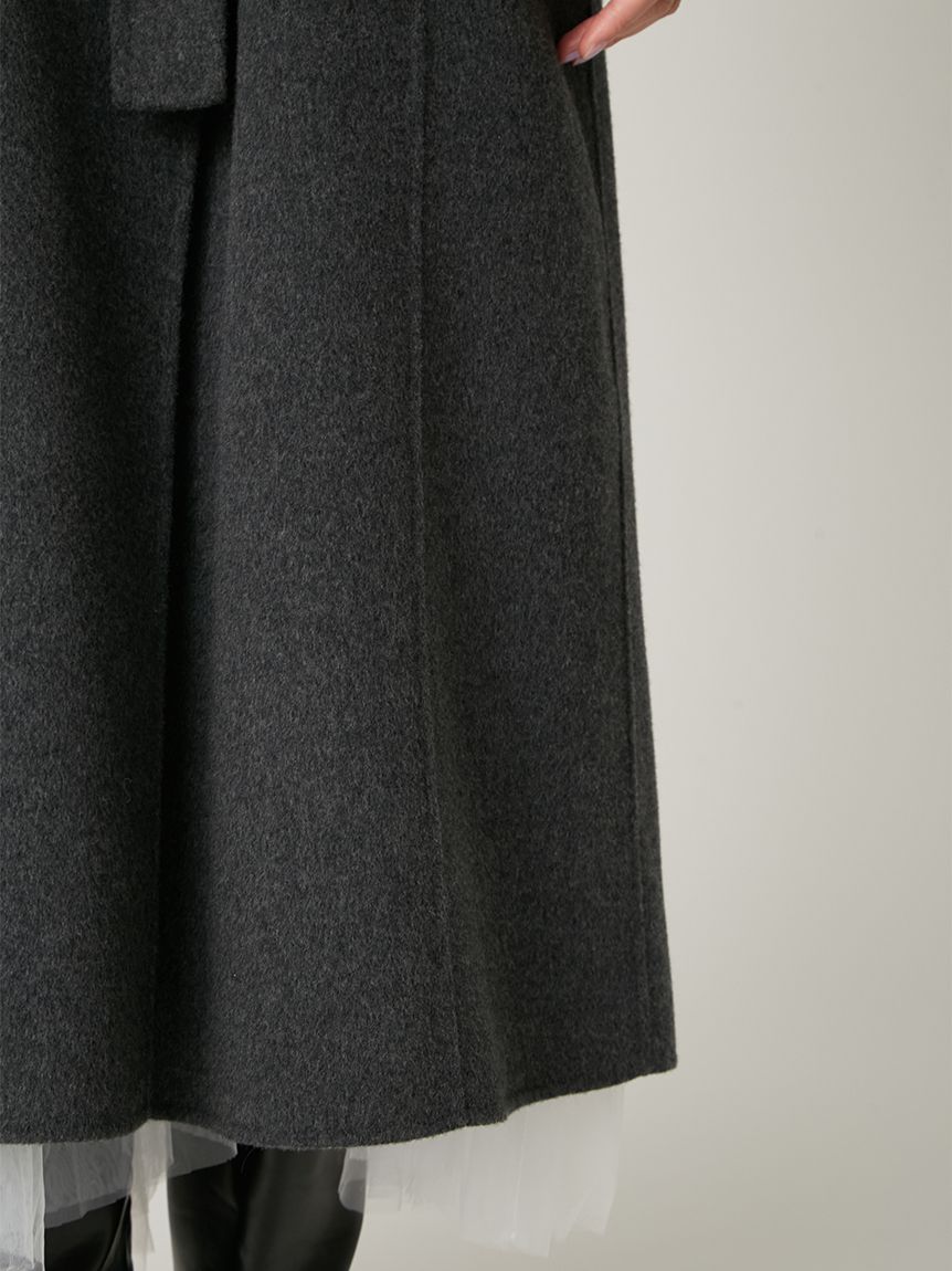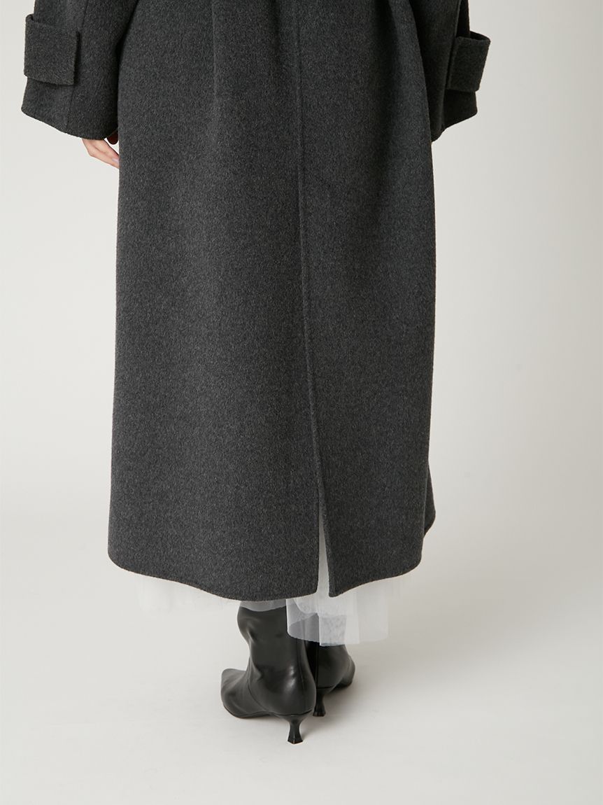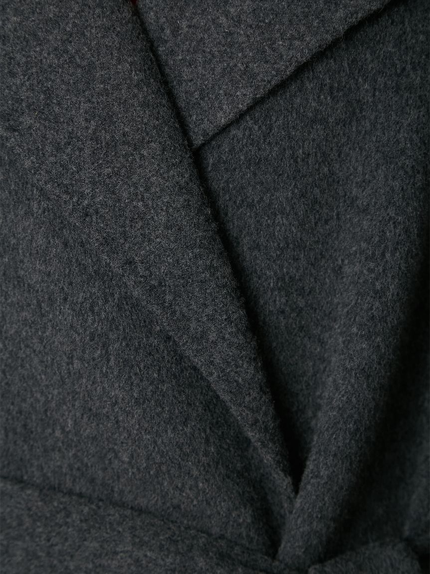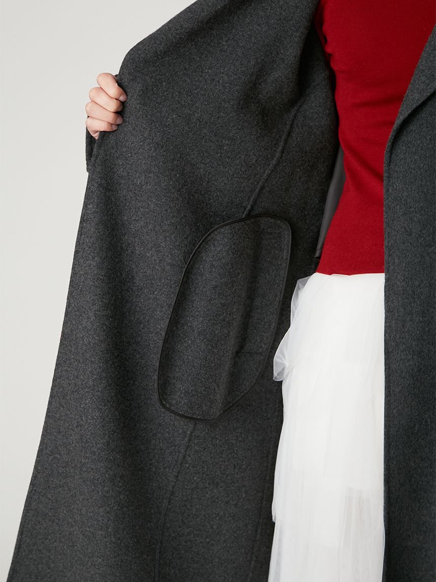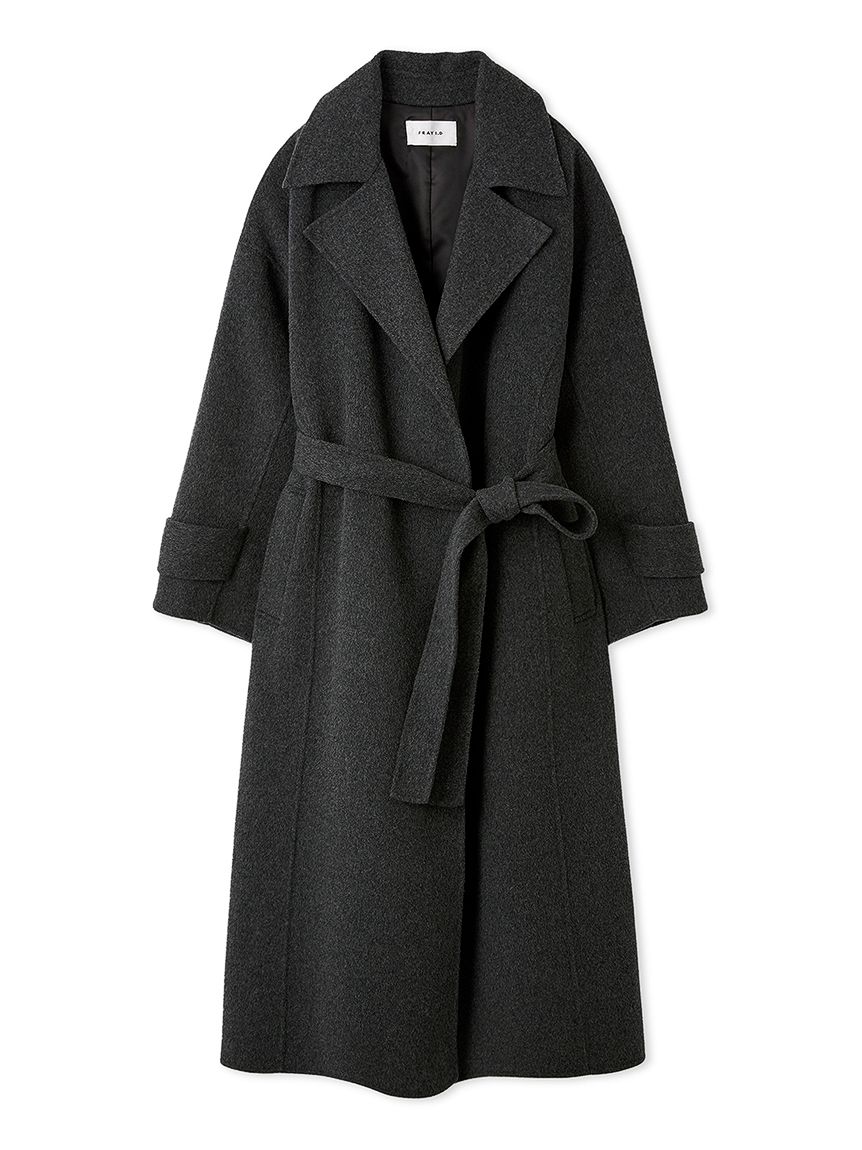 無鈕釦與拉鍊設計,以腰帶繫合的穿著方式,展現優雅且洗鍊的氛圍。此次採用輕盈且保暖的雙面縫製工藝製作,帶來舒適包覆感。