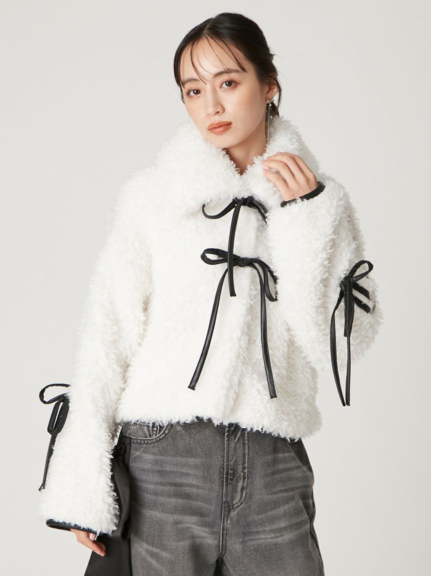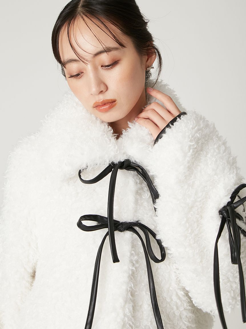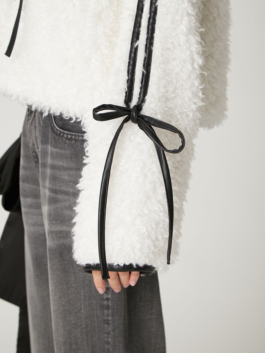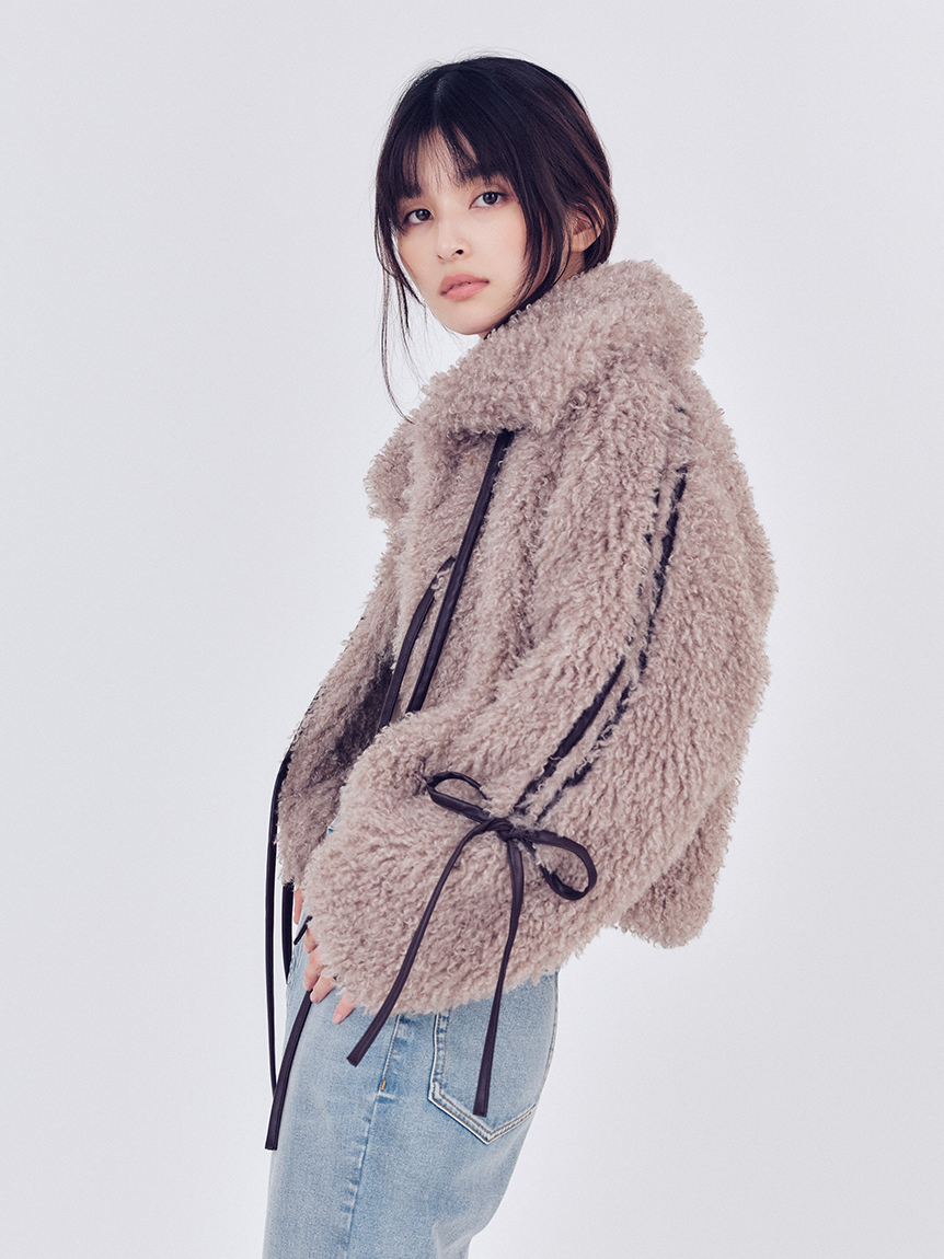 【以皮革蝴蝶結展現大人甜美感的主角級絨毛外套】