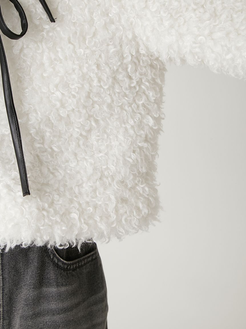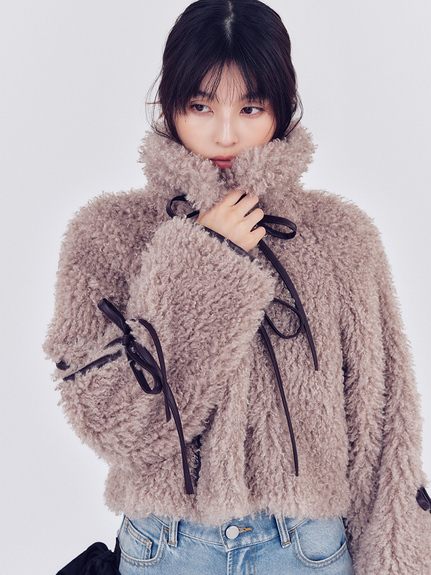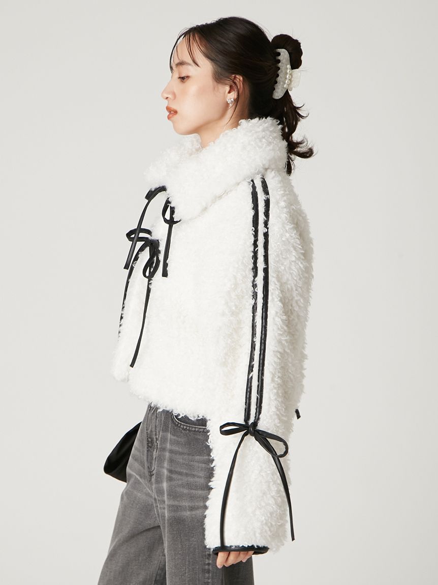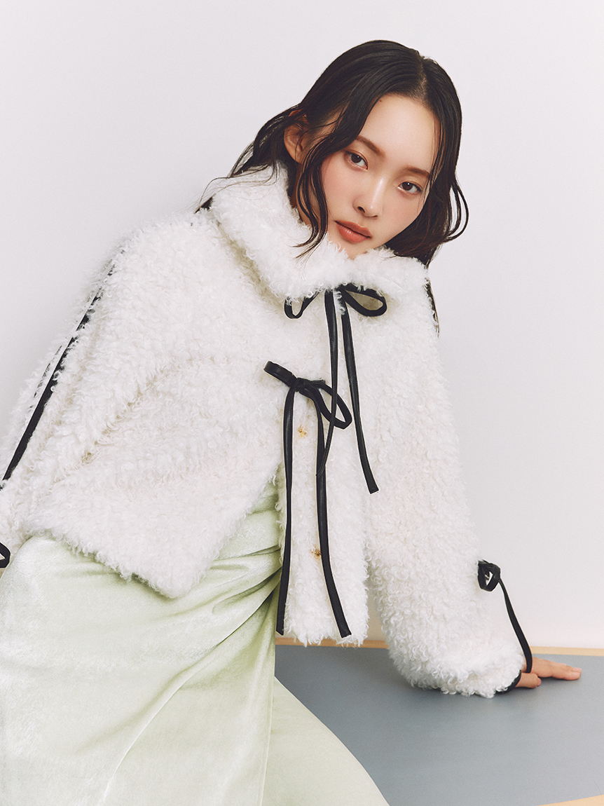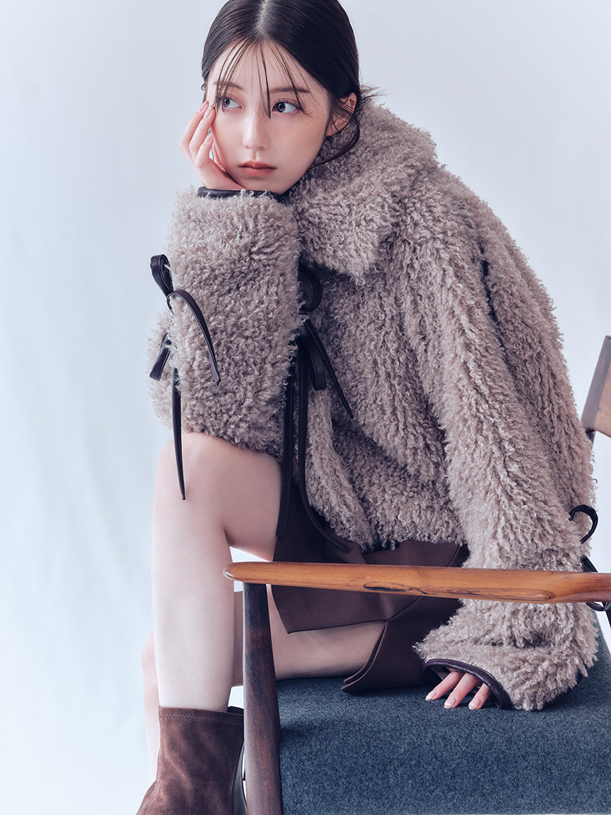 【以皮革蝴蝶結展現大人甜美感的主角級絨毛外套】