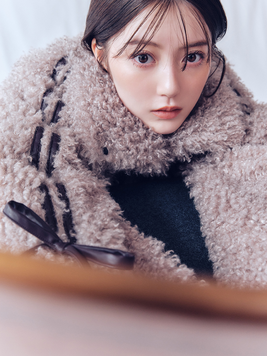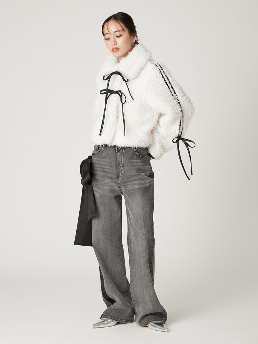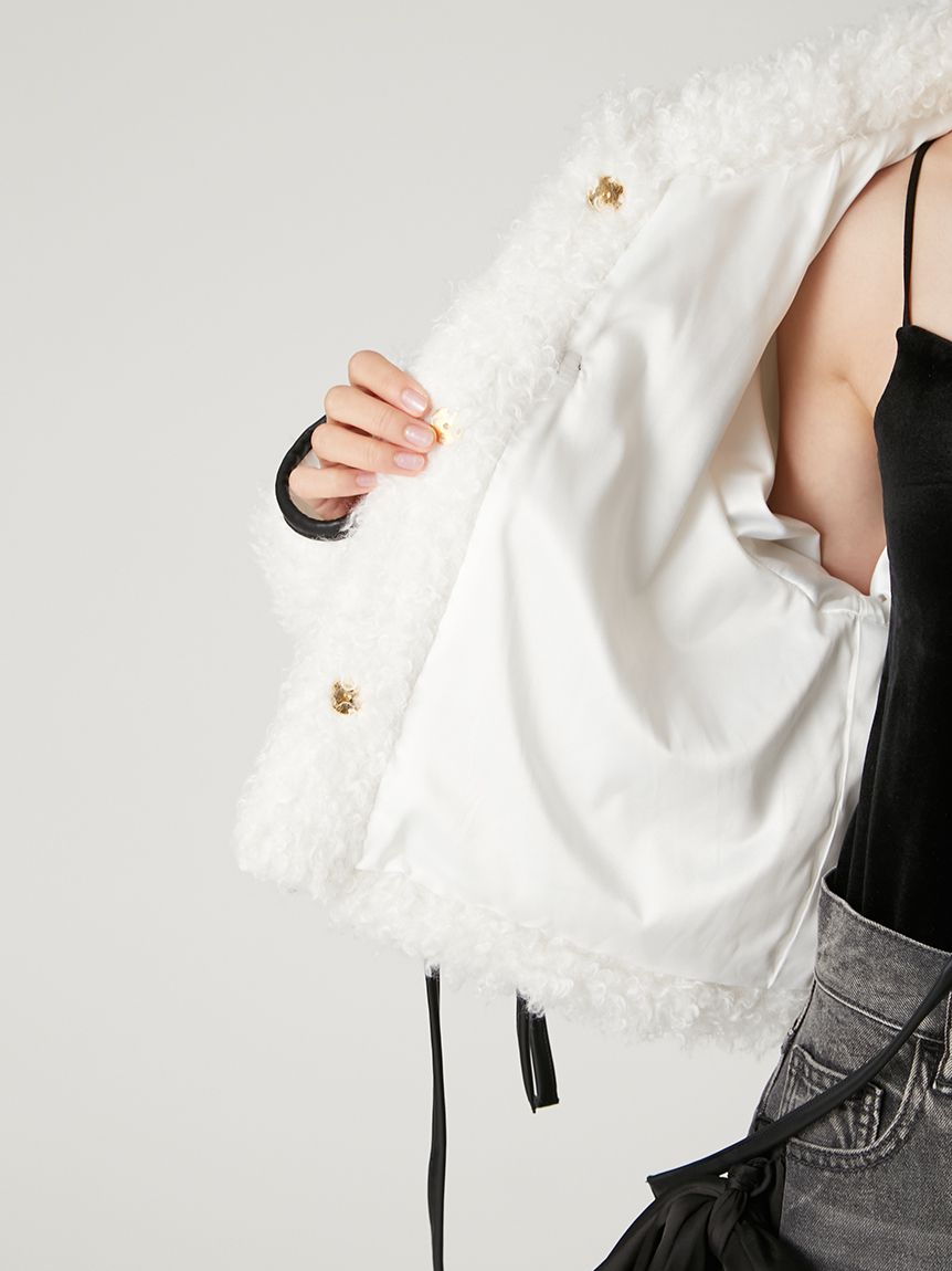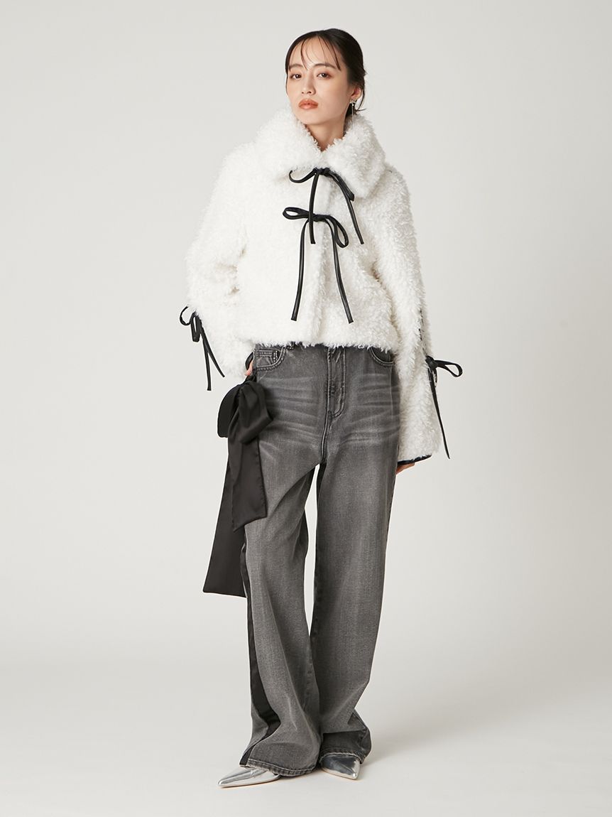 【以皮革蝴蝶結展現大人甜美感的主角級絨毛外套】