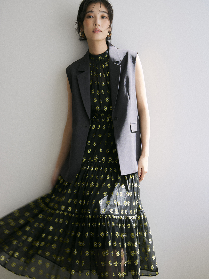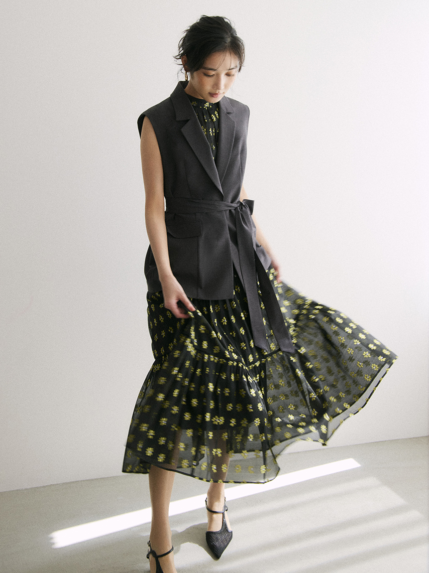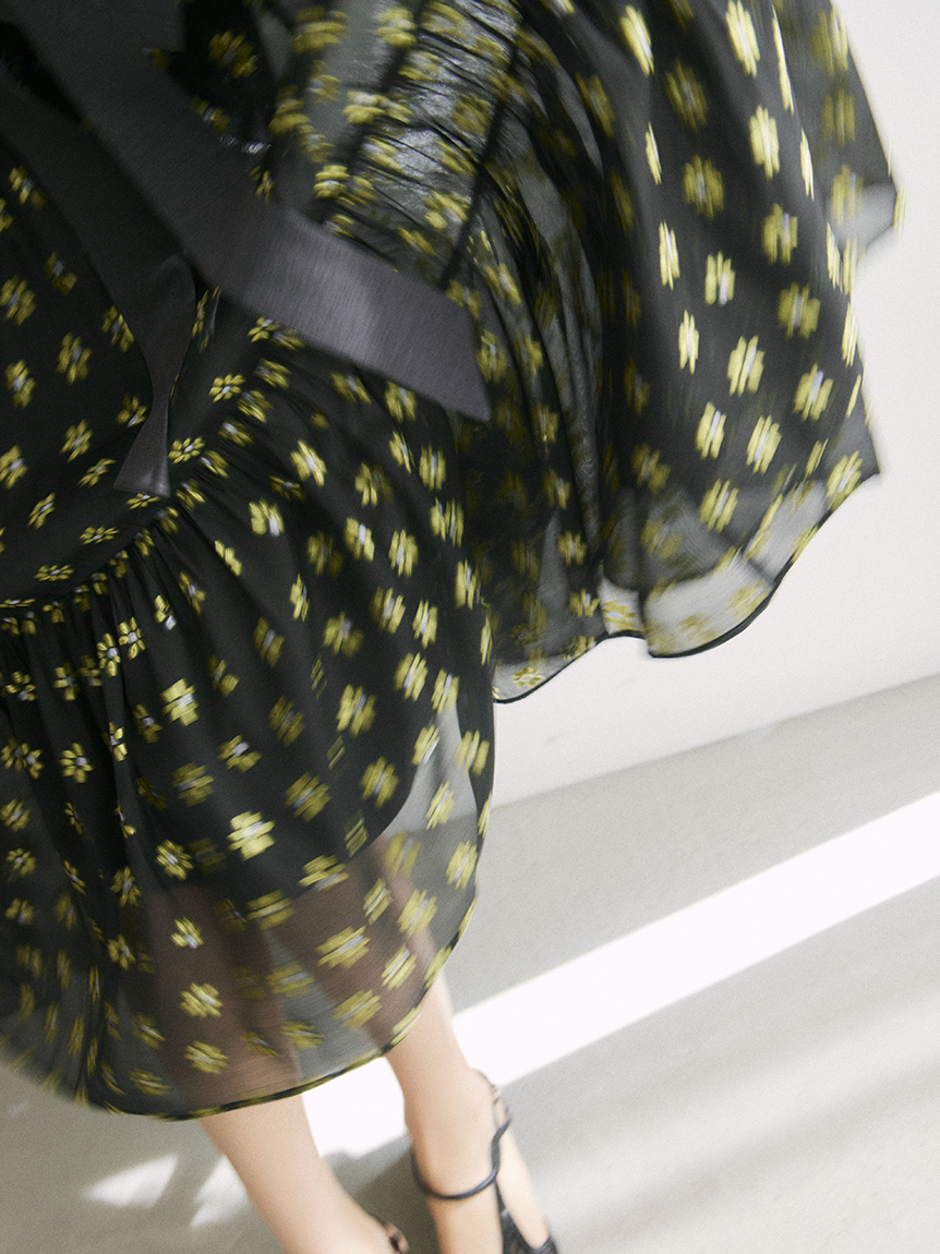 裙身層次以三種不同材質分段配置,並依布料特性調整抓皺份量,呈現不過於蓬鬆的恰好剪裁。
