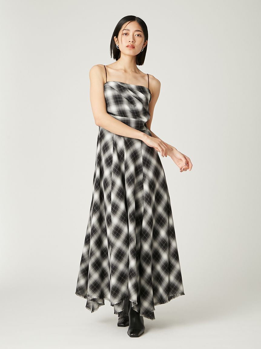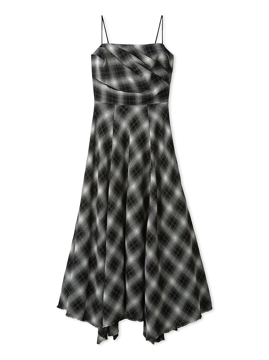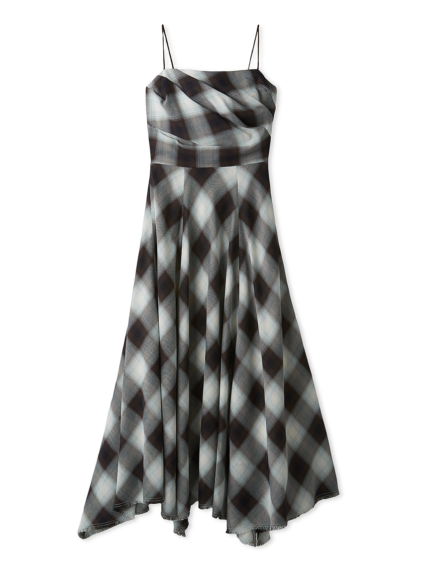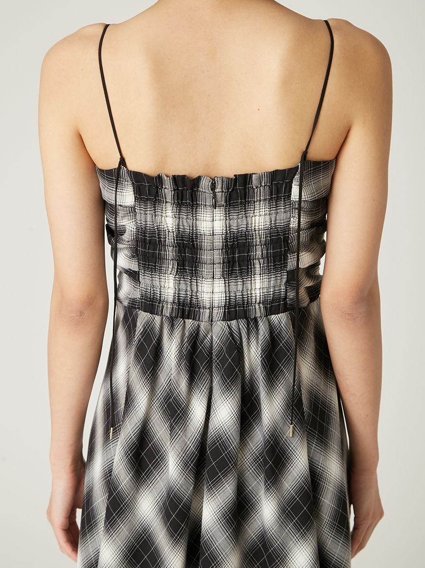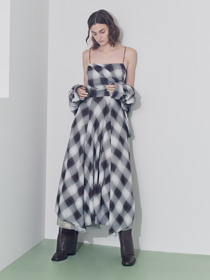 採用 FRAY I.D 原創先染漸層格紋布料 打造的細肩帶洋裝。