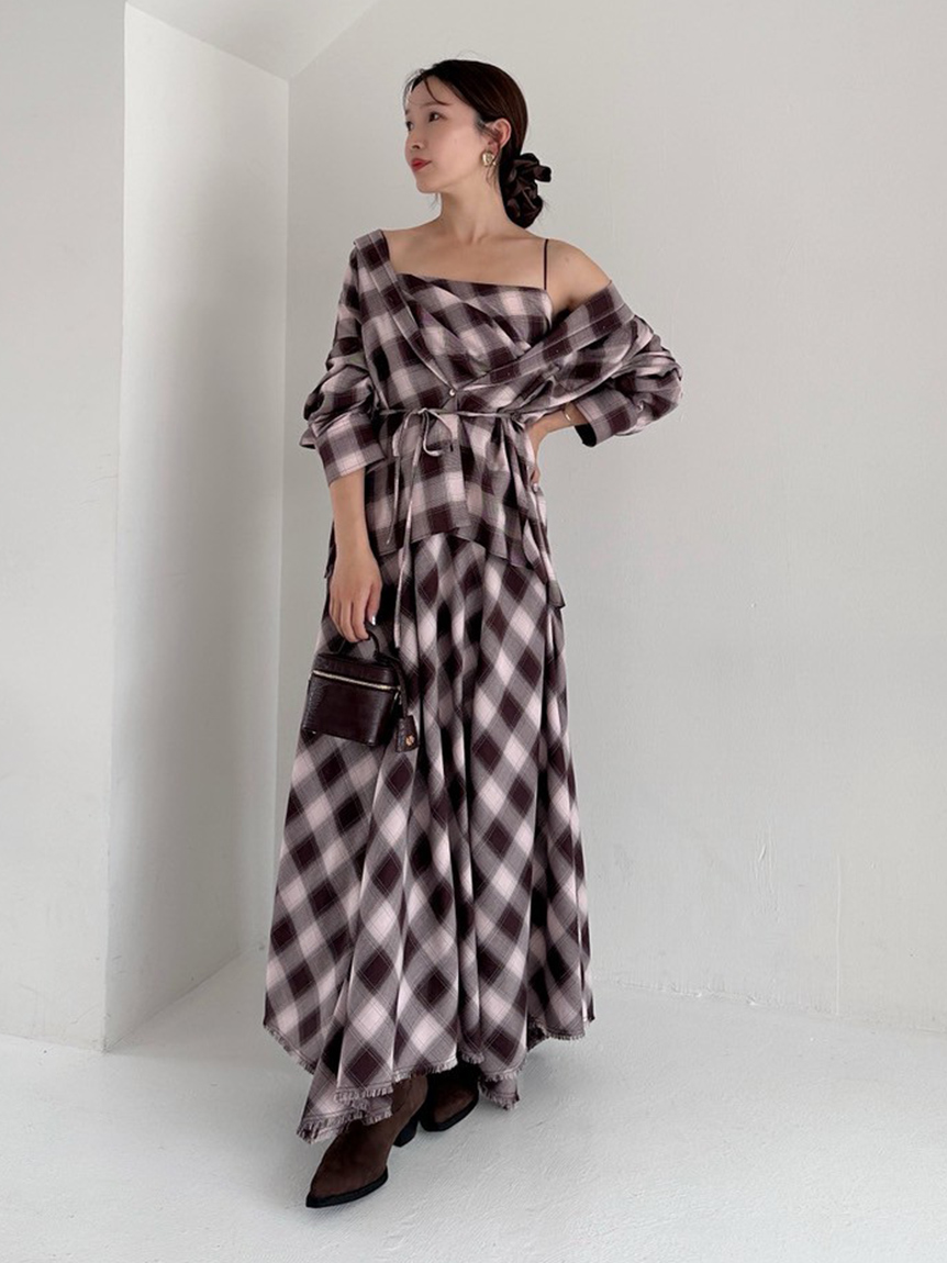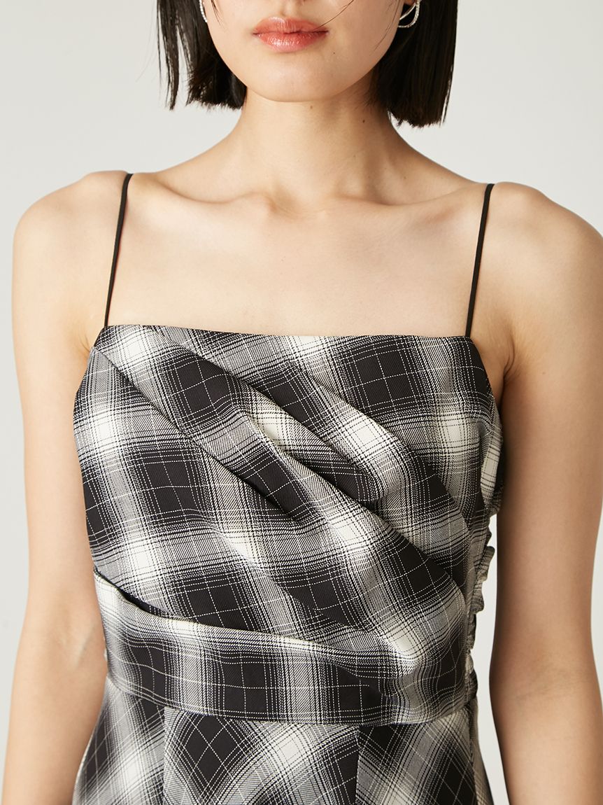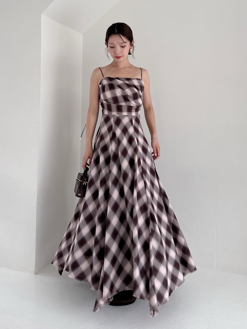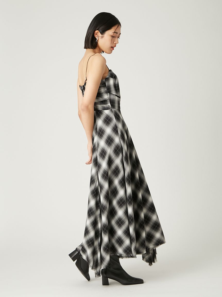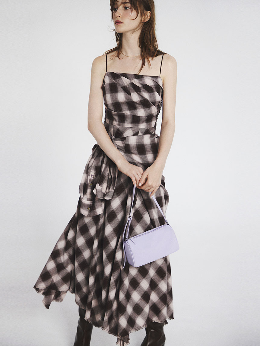 採用 FRAY I.D 原創先染漸層格紋布料 打造的細肩帶洋裝。