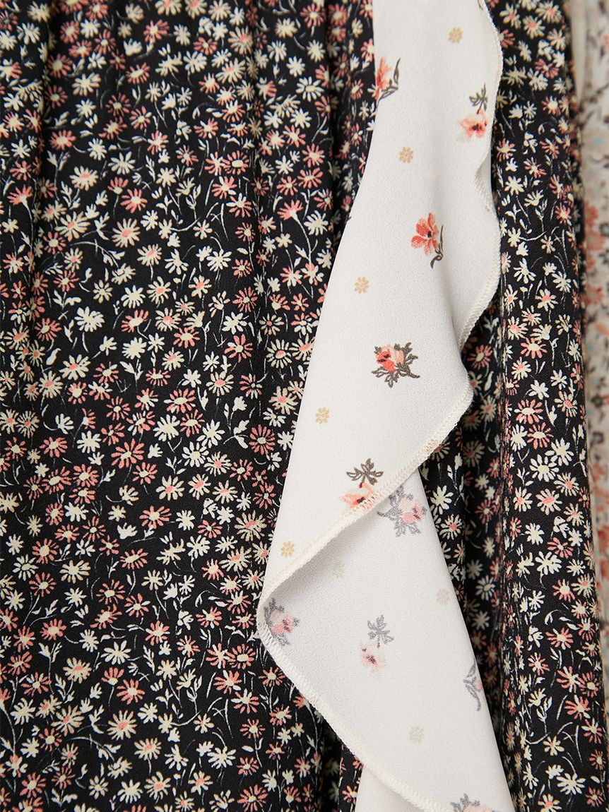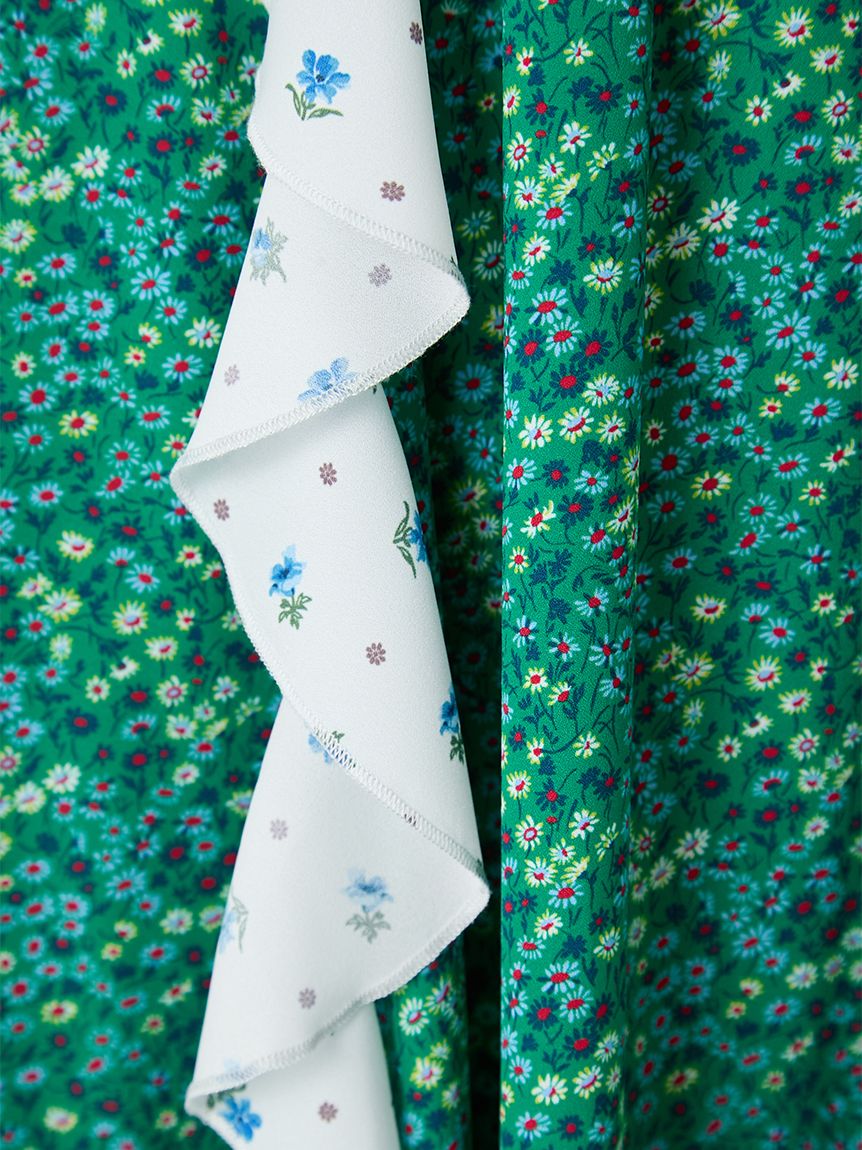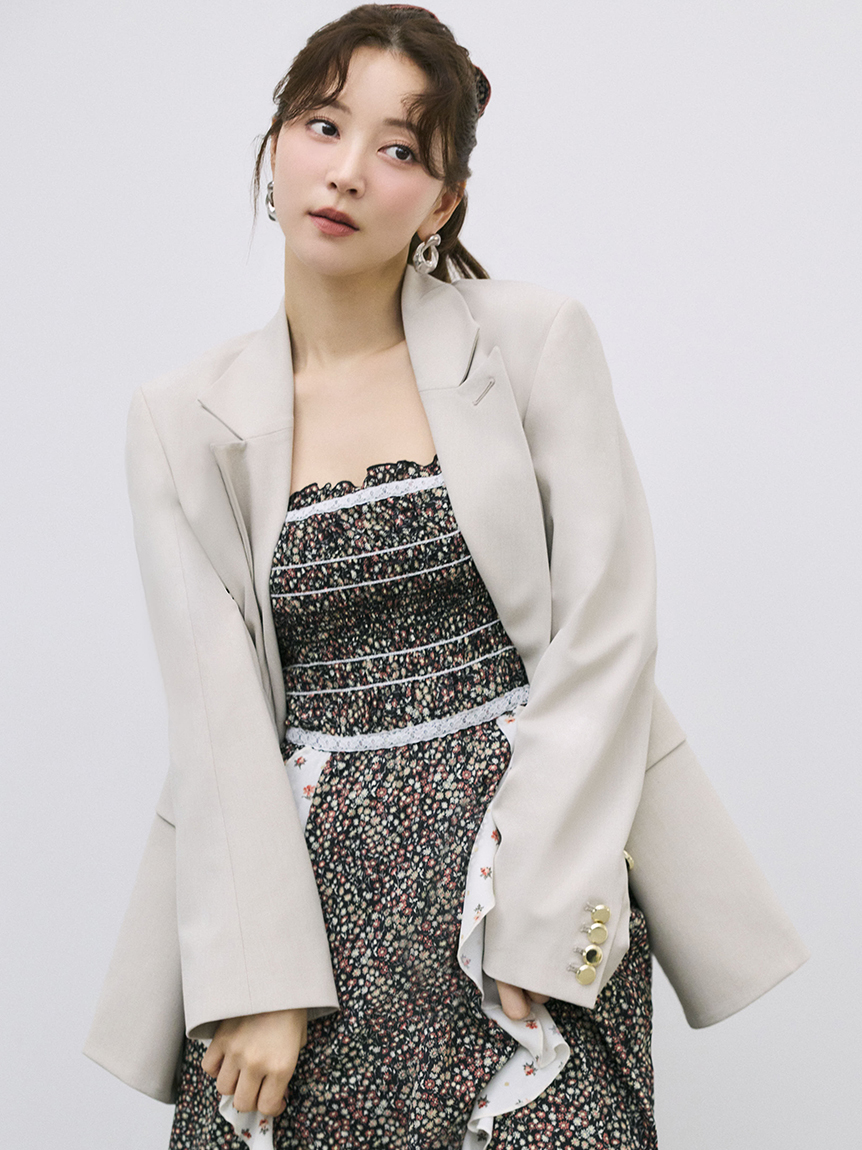 吊帶洋裝結合兩種小花印花,使用抗皺且垂墜感佳的喬其紗,並以大膽荷葉邊增添古典可愛與都會感。