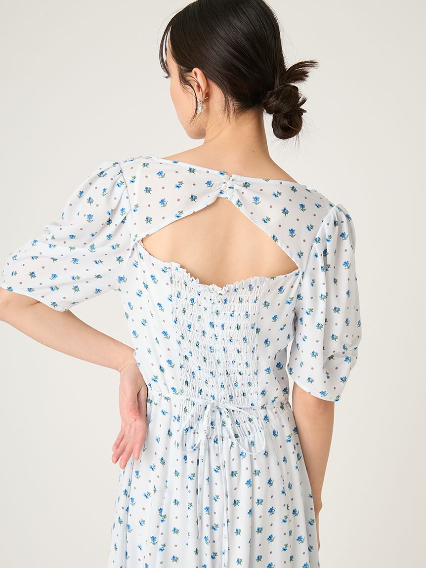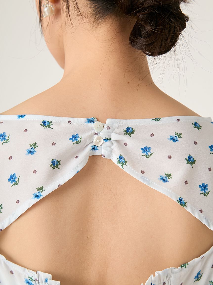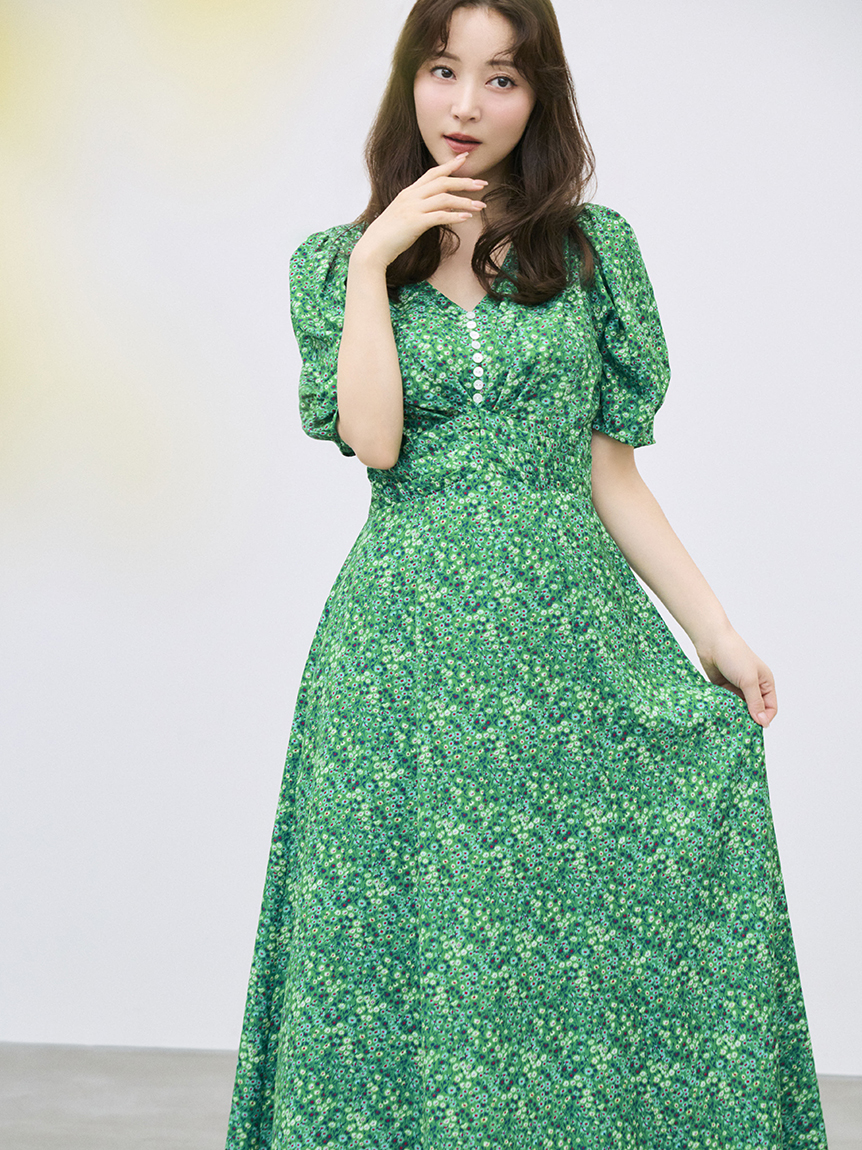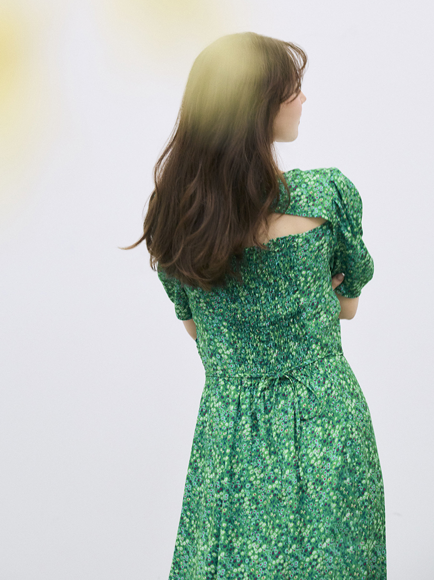 泡泡袖洋裝搭配細緻花卉印花,優雅不甜膩,落肩與柔美線條營造成熟感;後背鏤空設計增添性感與透氣感。前襟施以貝殼扣,增添高雅細節。