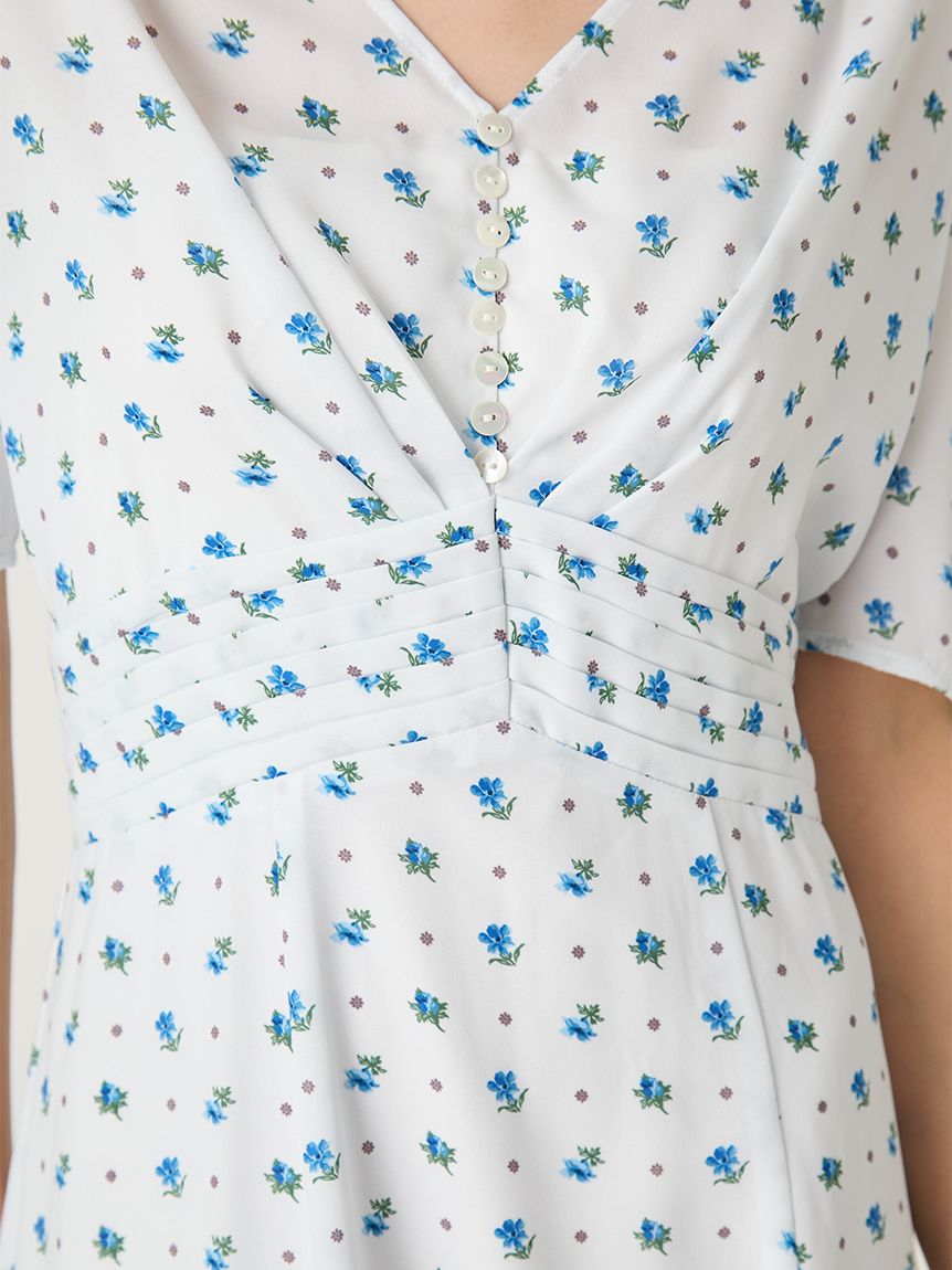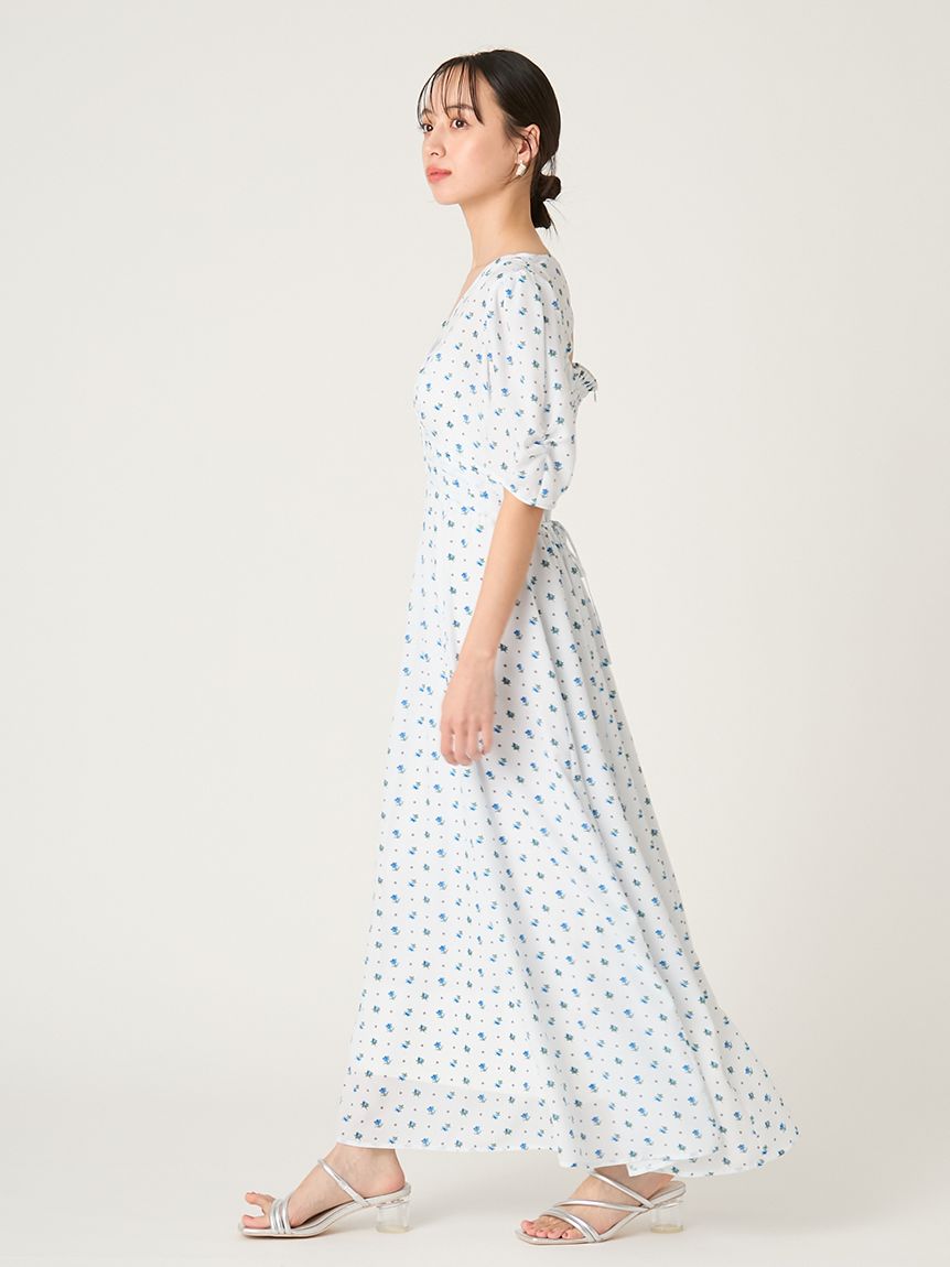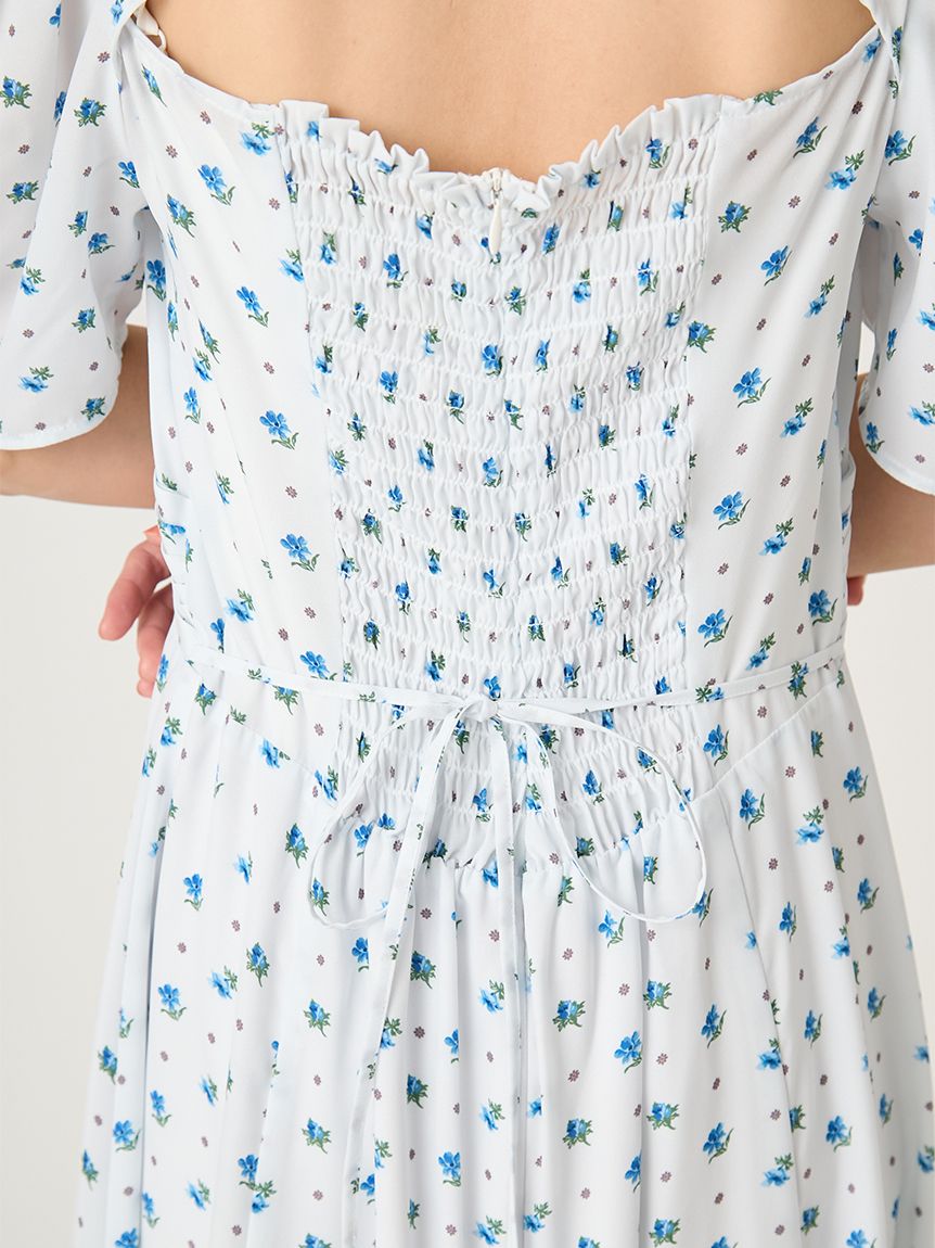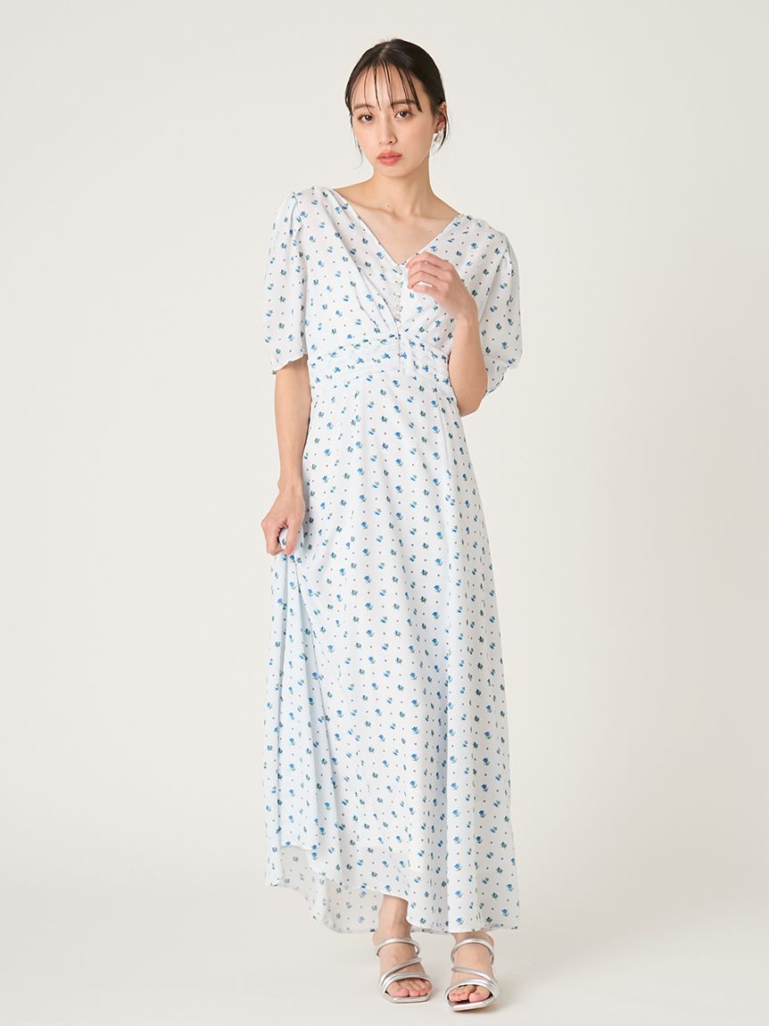 泡泡袖洋裝搭配細緻花卉印花,優雅不甜膩,落肩與柔美線條營造成熟感;後背鏤空設計增添性感與透氣感。前襟施以貝殼扣,增添高雅細節。