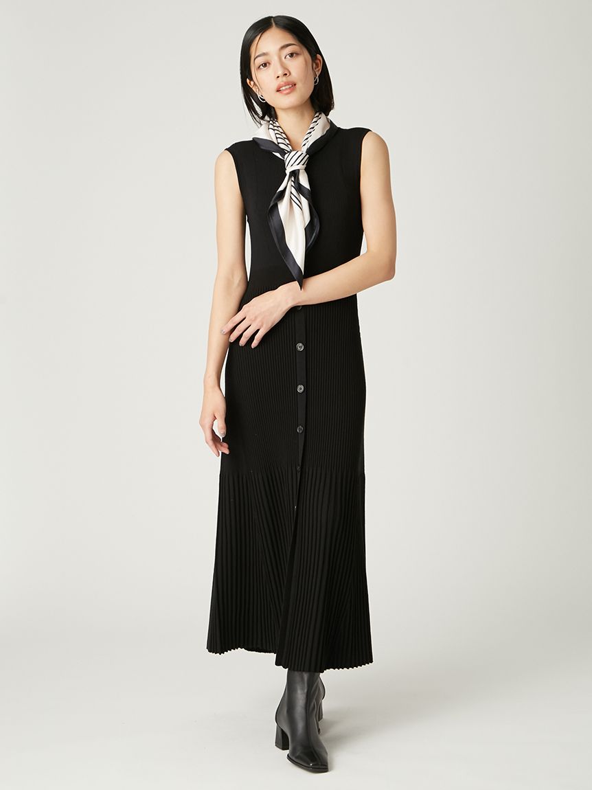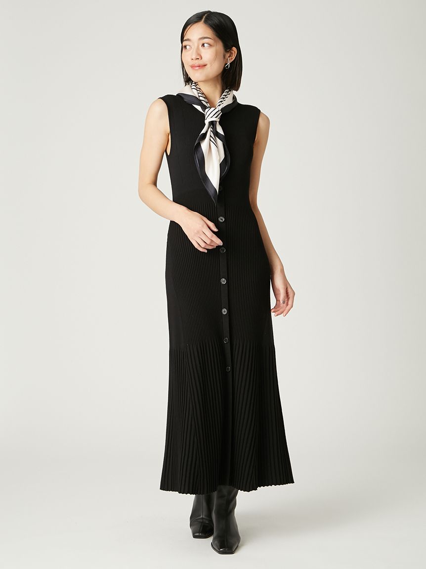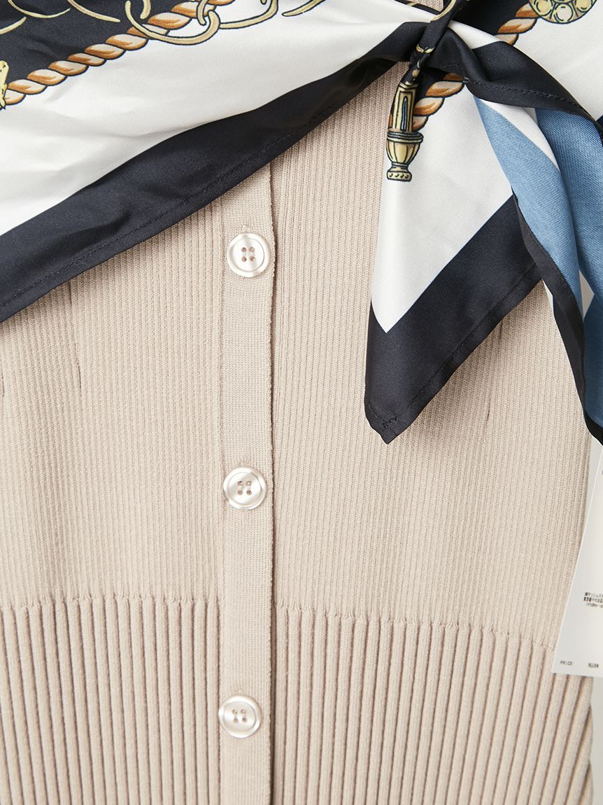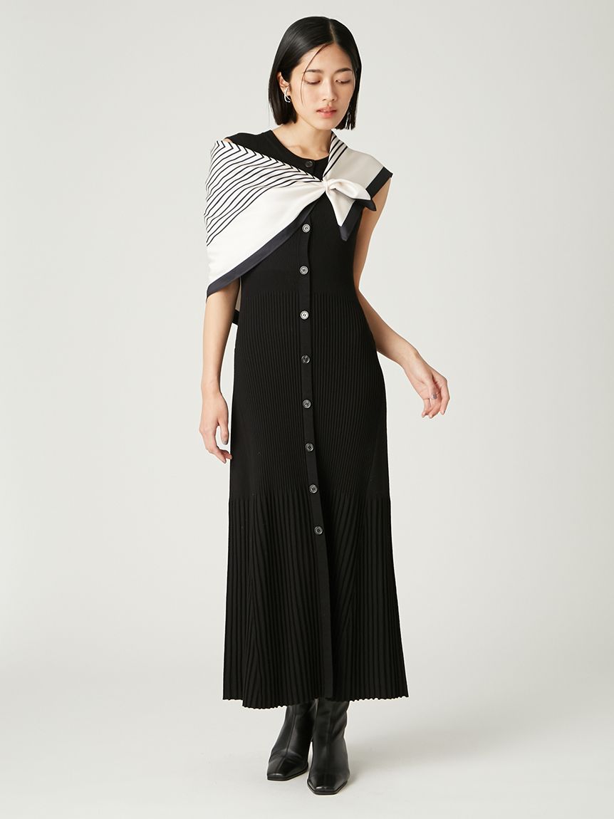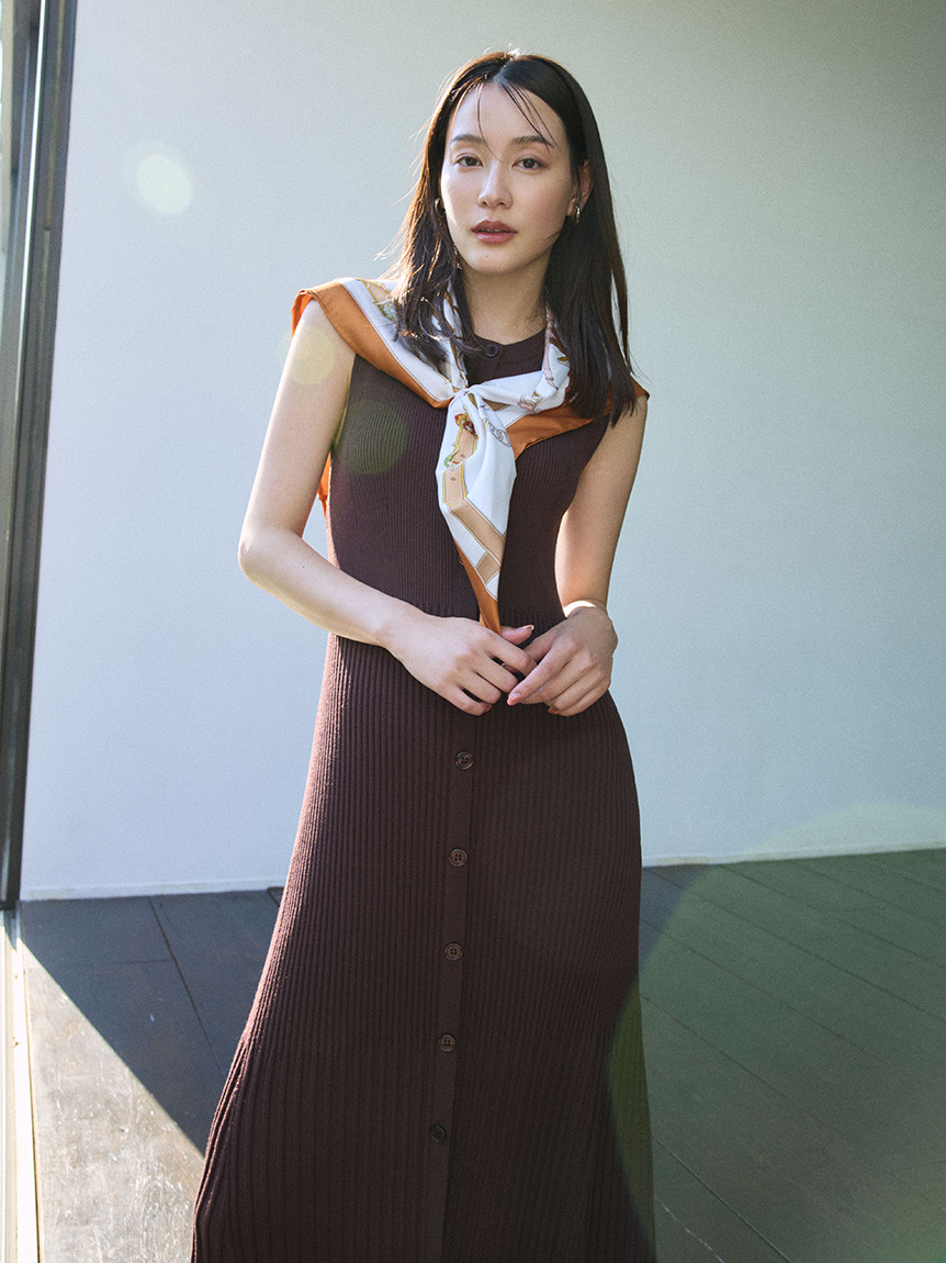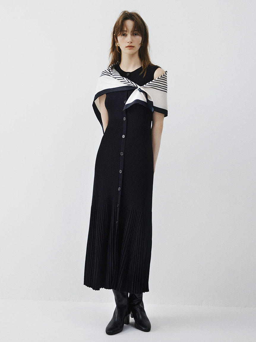 前開式羅紋針織洋裝搭配當季流行的絲巾套組。多種寬度的羅紋交錯編織,呈現柔美的喇叭線條,貼合身形卻不緊繃。腰下的鈕扣為裝飾設計,前片無法打開,穿著安心。