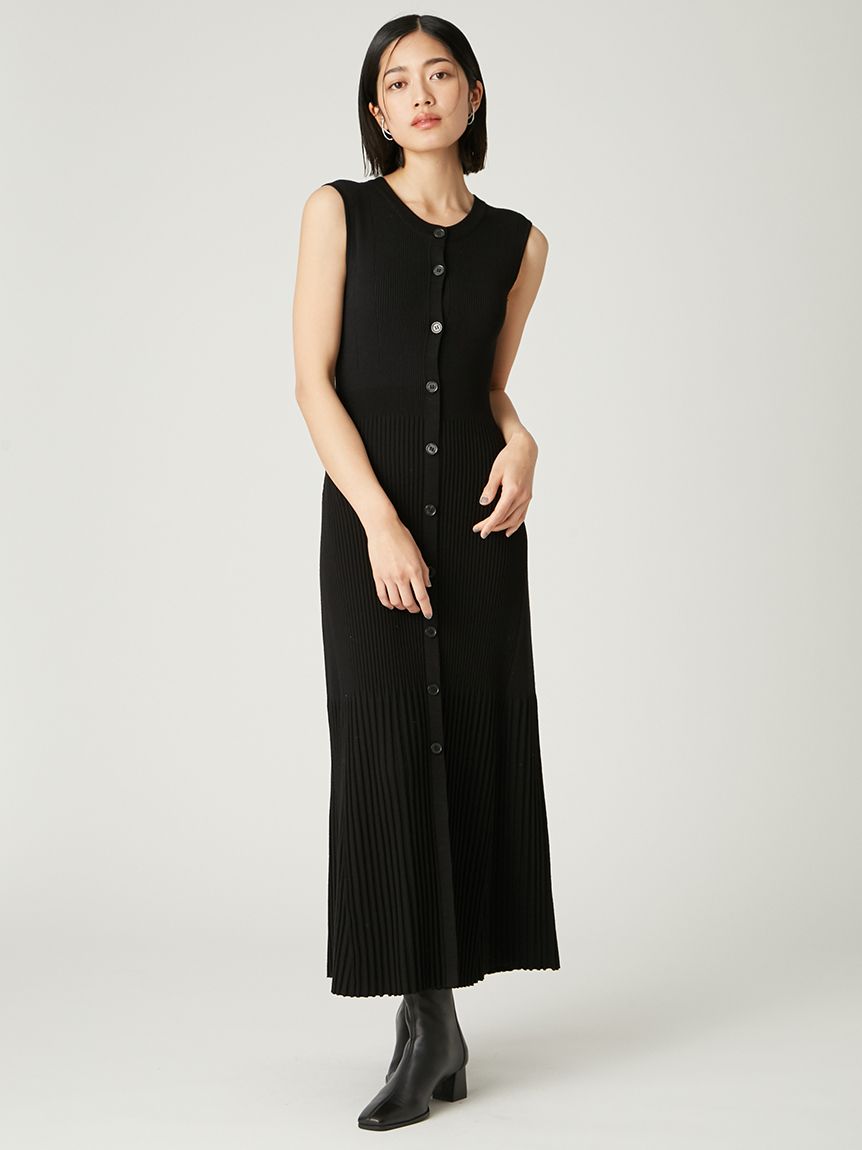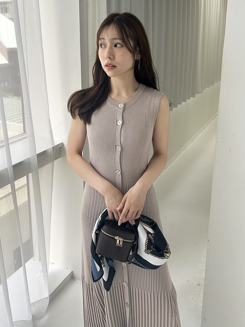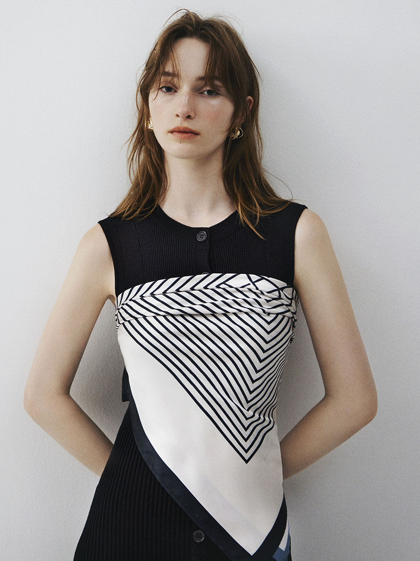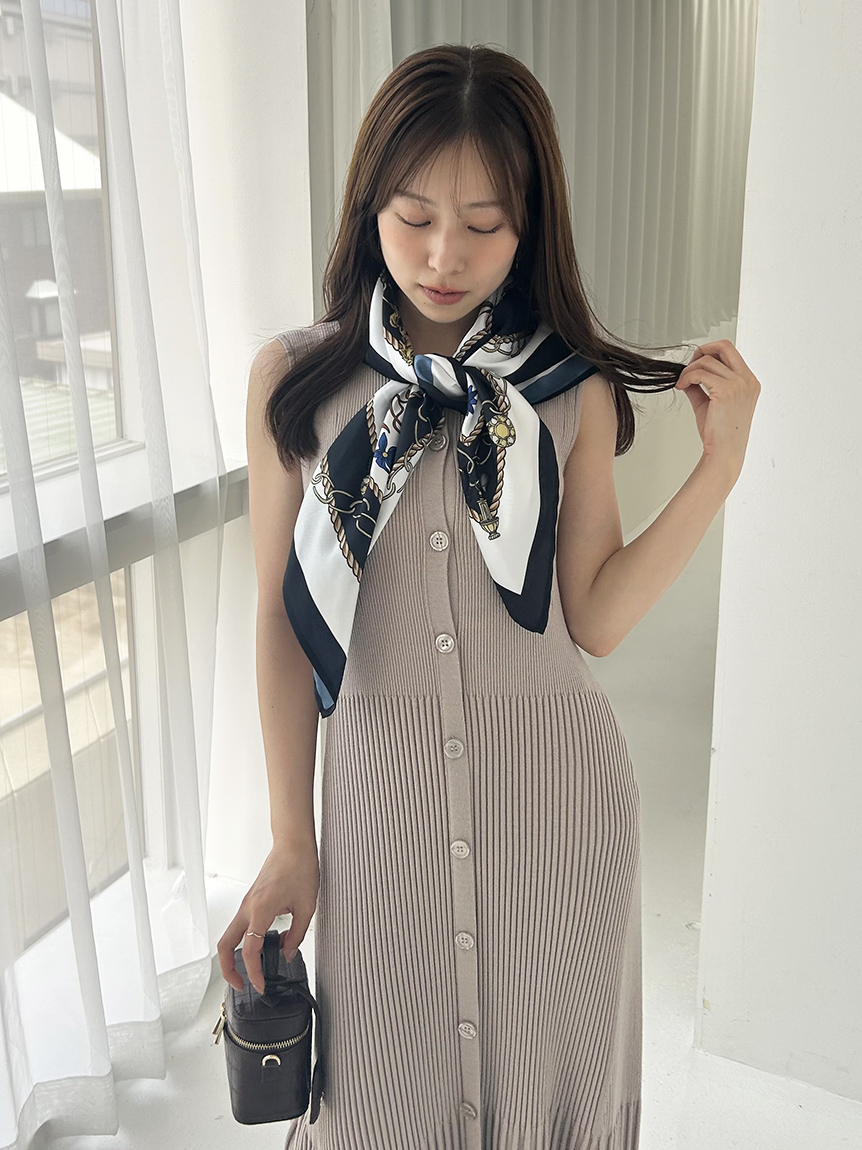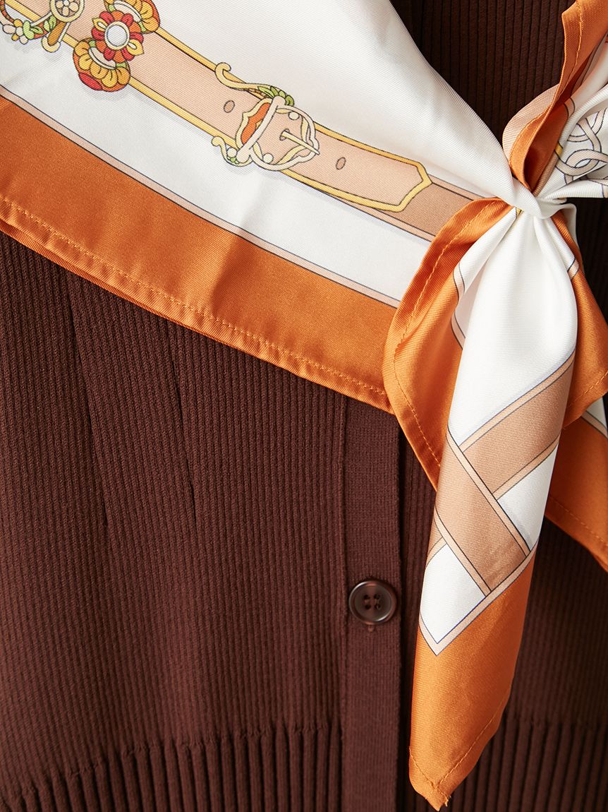 前開式羅紋針織洋裝搭配當季流行的絲巾套組。多種寬度的羅紋交錯編織,呈現柔美的喇叭線條,貼合身形卻不緊繃。腰下的鈕扣為裝飾設計,前片無法打開,穿著安心。