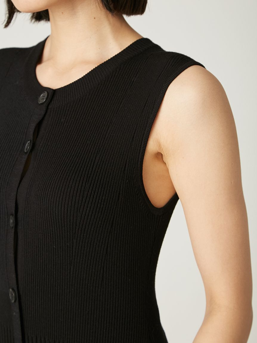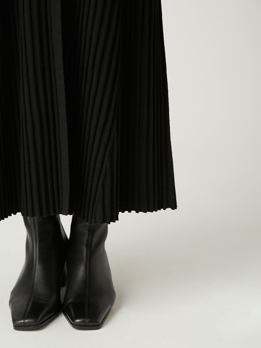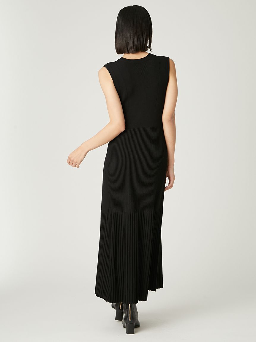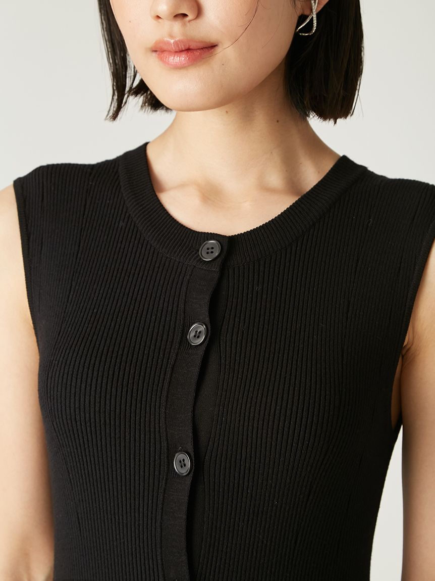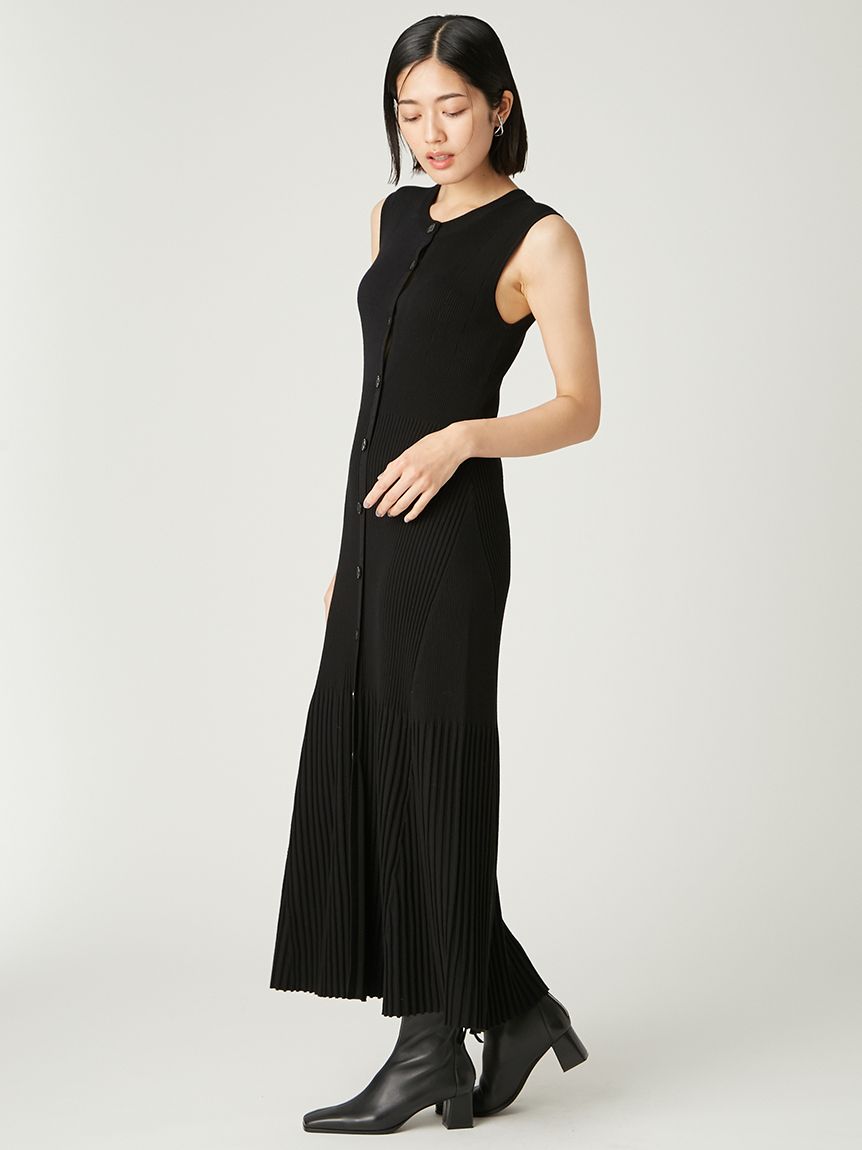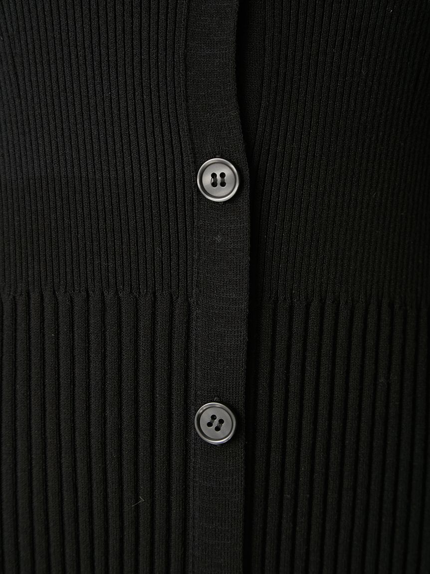 前開式羅紋針織洋裝搭配當季流行的絲巾套組。多種寬度的羅紋交錯編織,呈現柔美的喇叭線條,貼合身形卻不緊繃。腰下的鈕扣為裝飾設計,前片無法打開,穿著安心。
