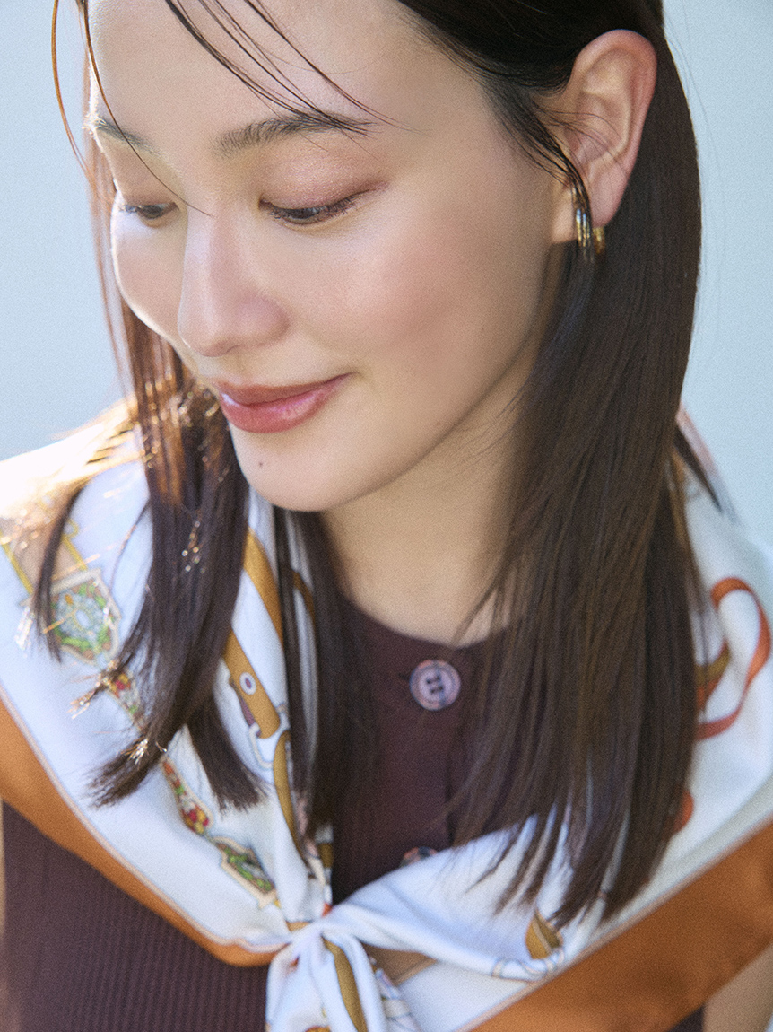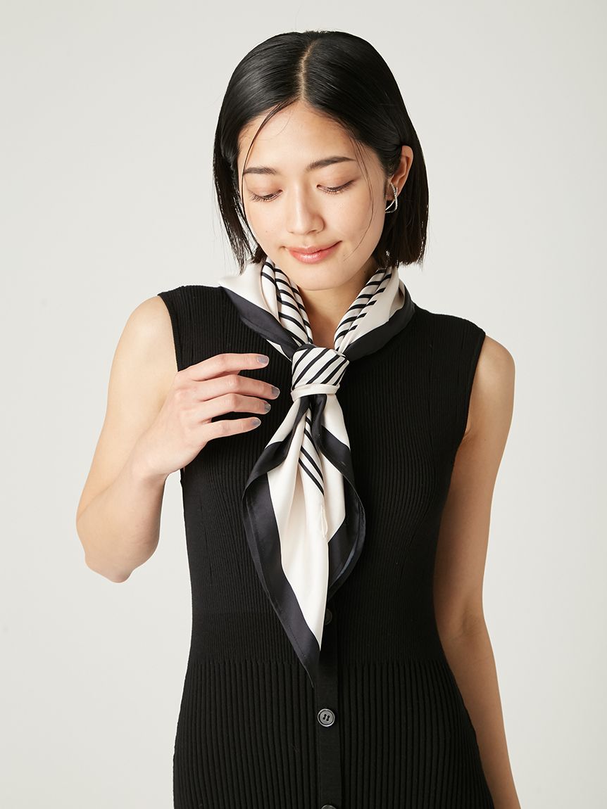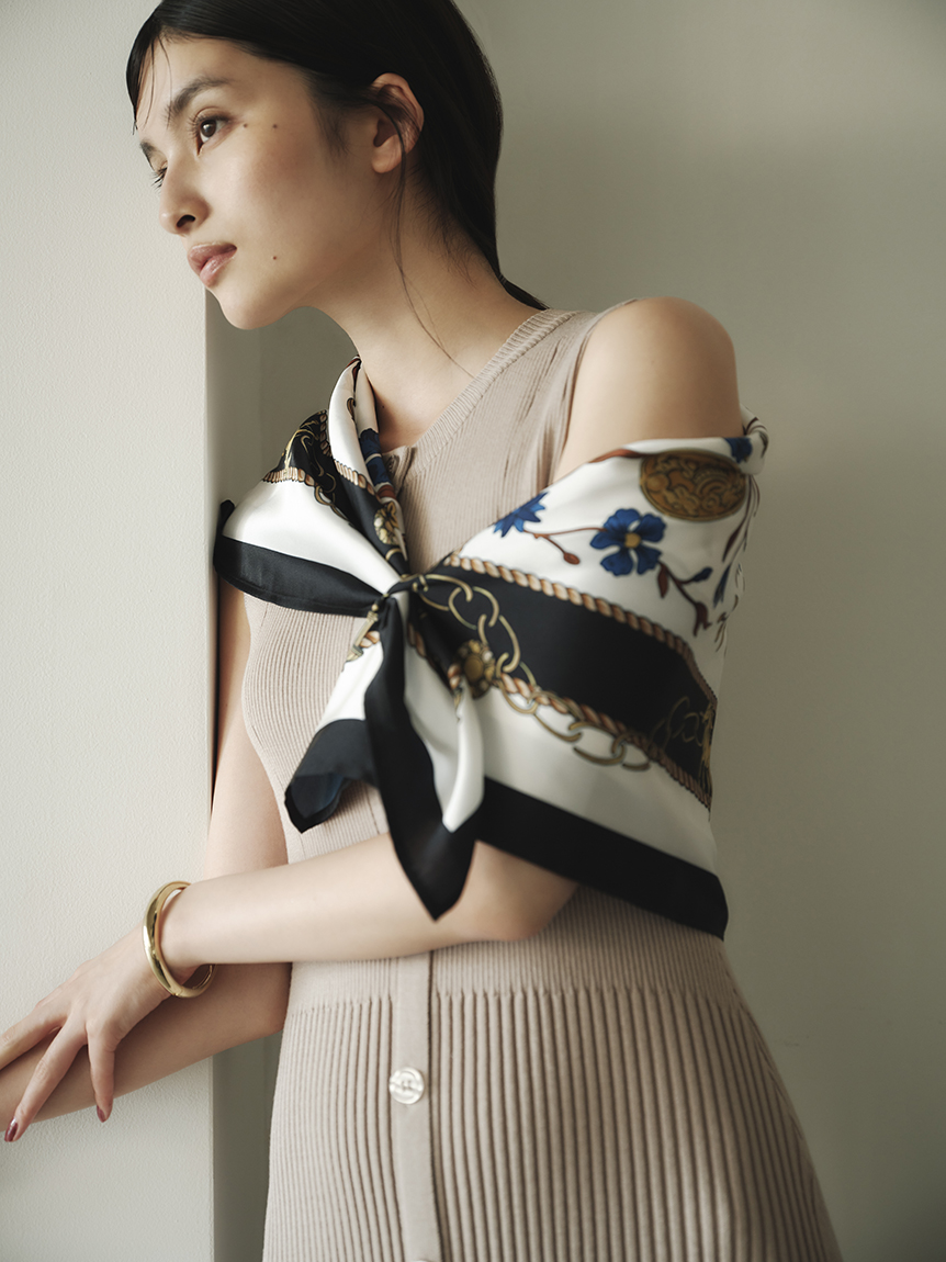 套組的絲巾以洋裝色系為基礎,設計出原創色彩與圖案。巾上設有穿孔,只需將末端穿過即可輕鬆披肩,也可綁成領巾、腰巾或作為平口上衣的造型,多種穿法隨心搭配。